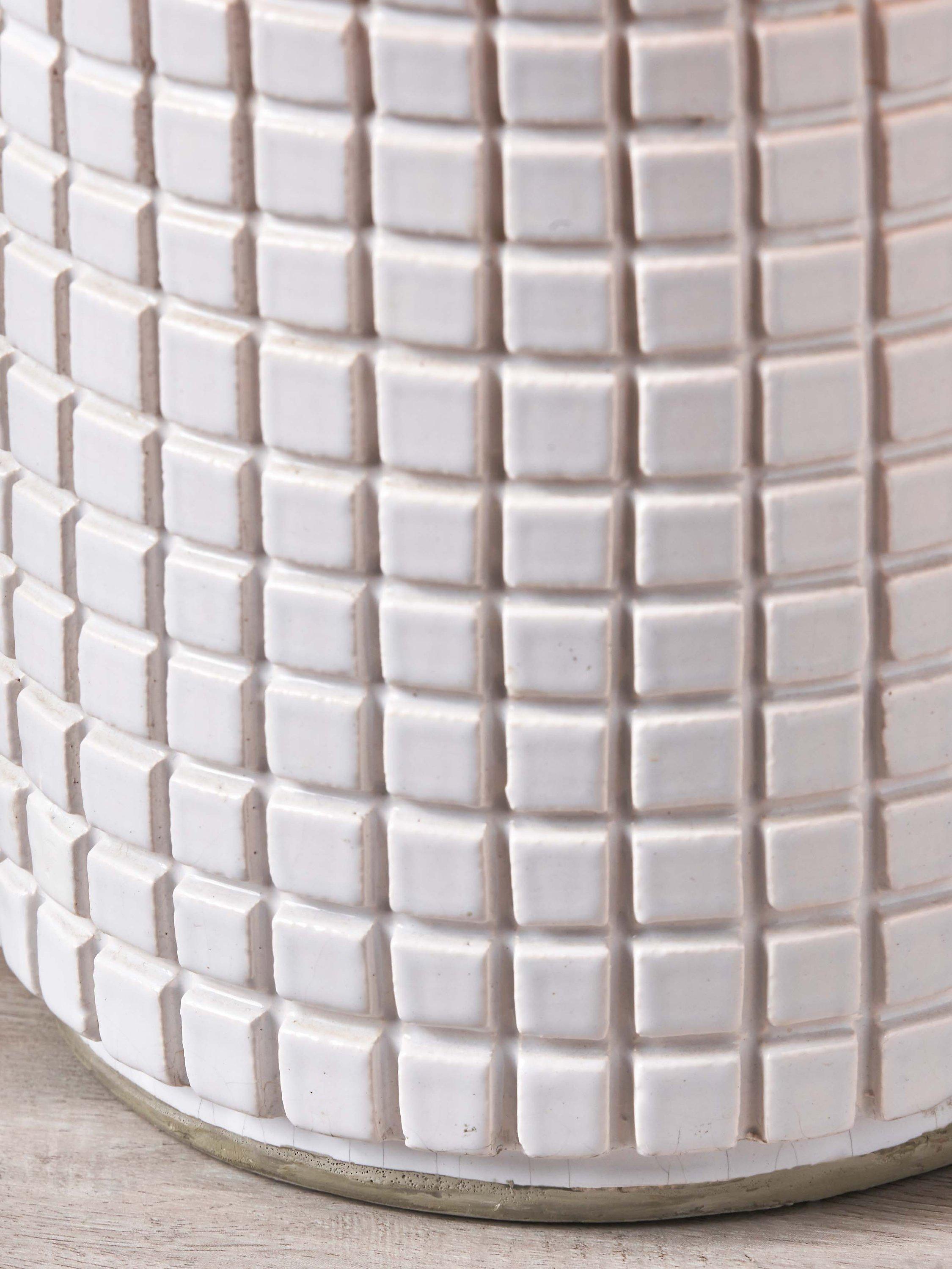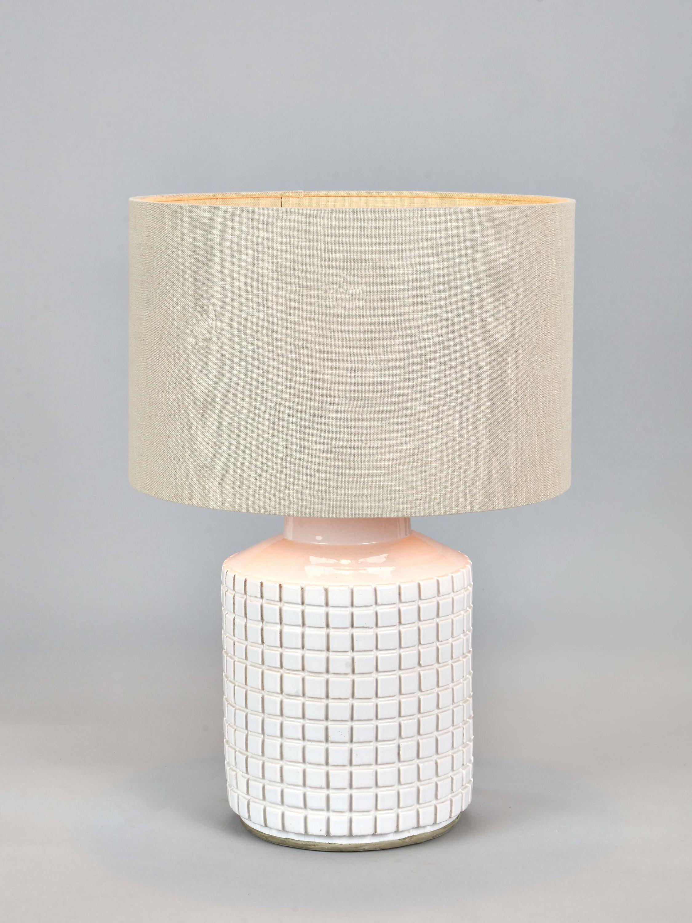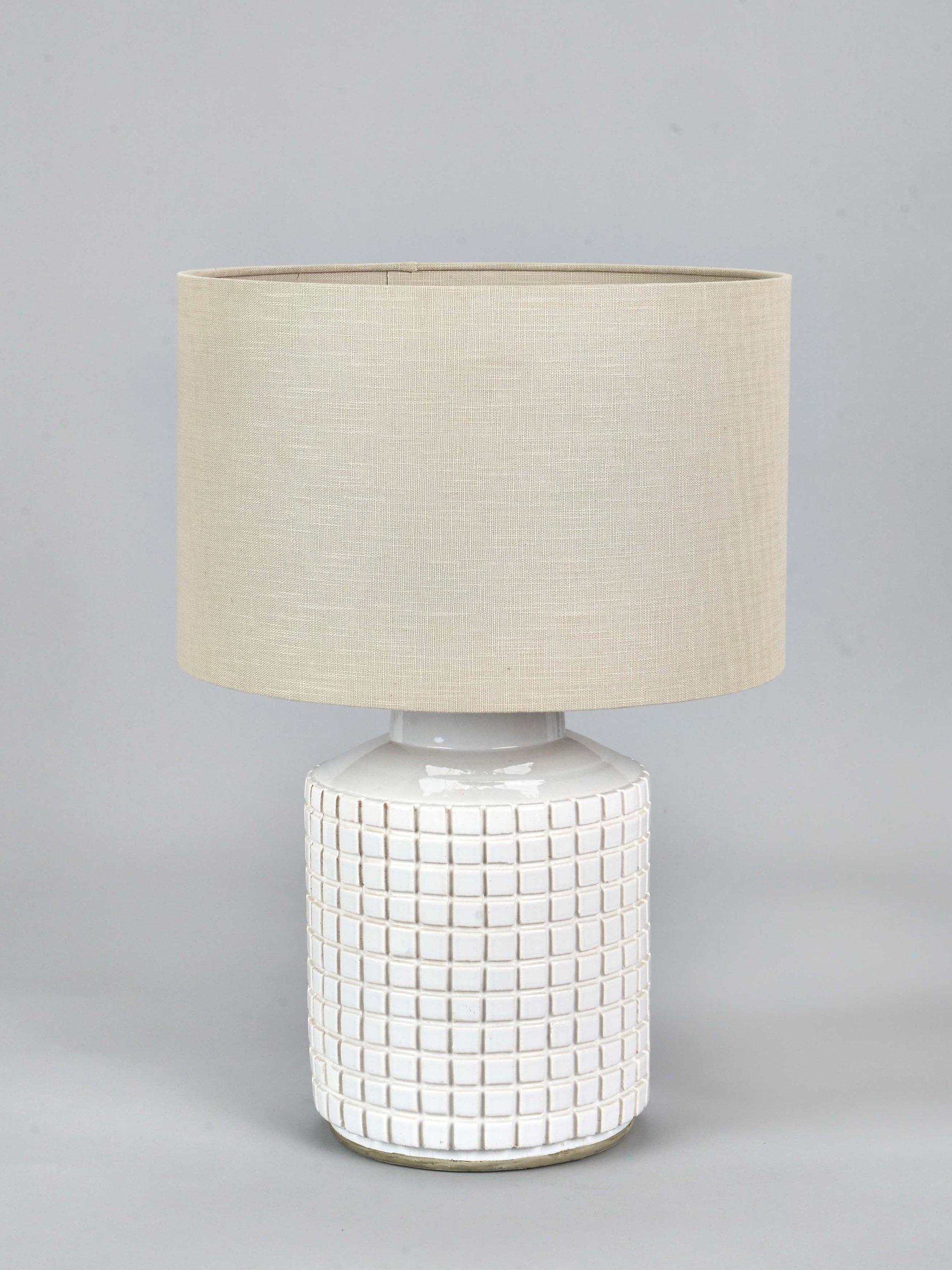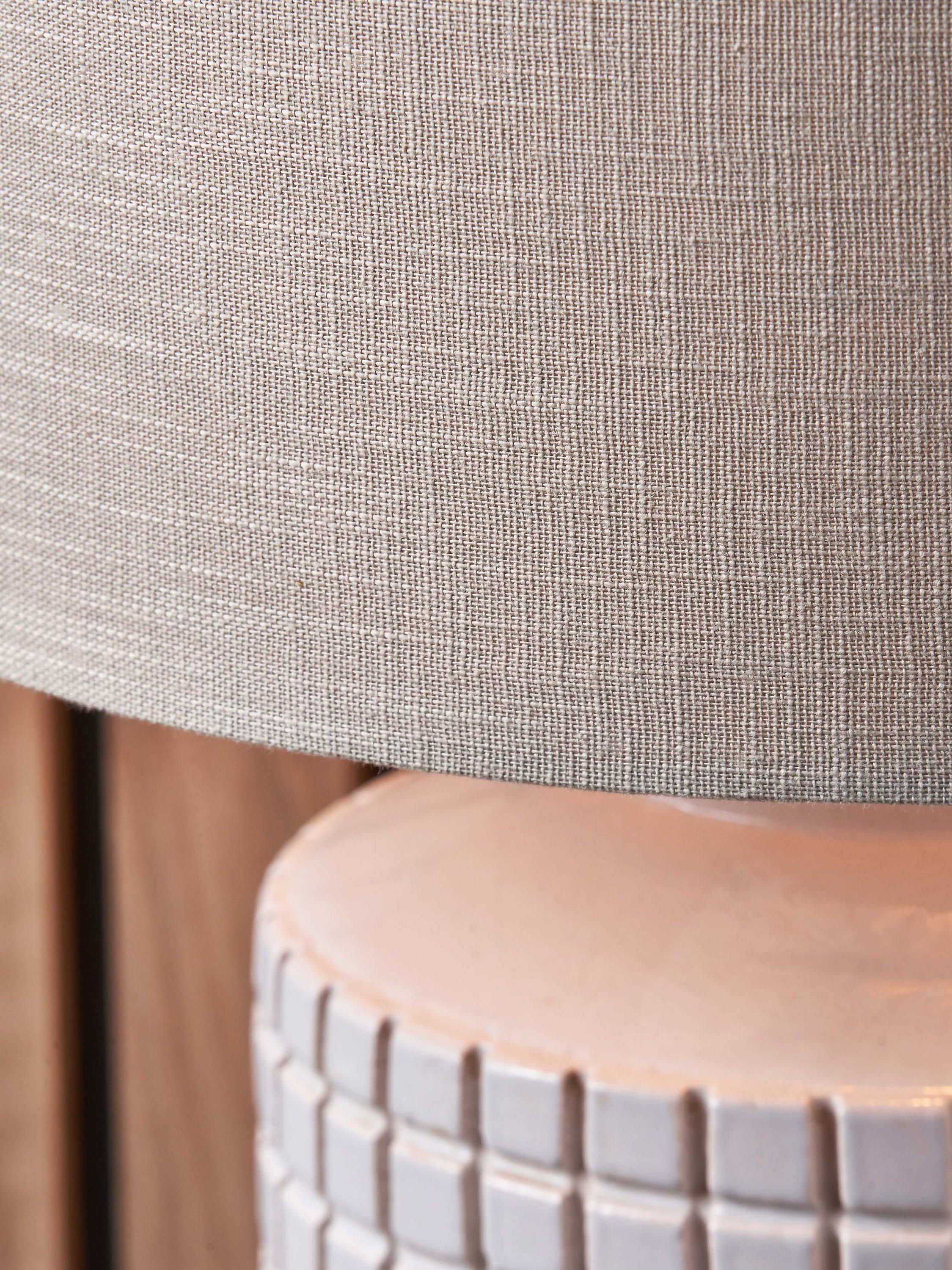 The Malone stoneware table lamp showcases a contemporary geometric square texture, hand-finished in the Philippines. Made from stoneware and finished in a textured, semi-matte gloss. Complemented by a modern, open weave lampshade that allows light to filter through.