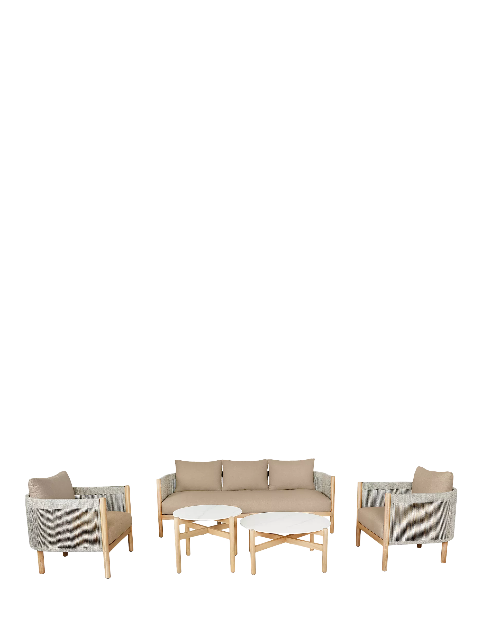 The Marche, made in Vietnam, gives your garden an update with an on-trend curved seat back design and synthetic rope weave. The four-seater garden lounge set features acacia wood frames and a large round coffee table and a small round coffee table with polystone tops which are durable and weather-resistant.