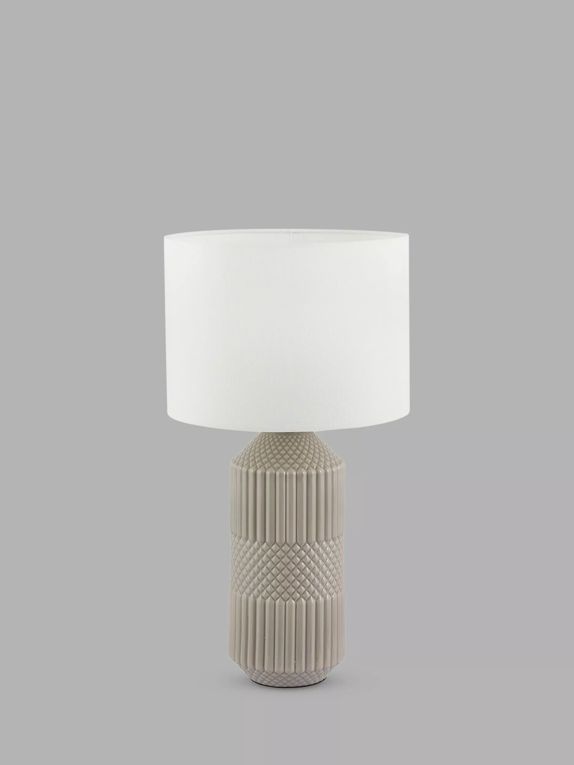 This beautiful tall, textured ceramic table lamp is finished in a simple glaze. Complete with a crisp white shade for a clean neutral look.