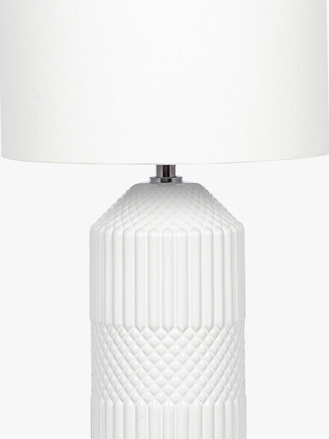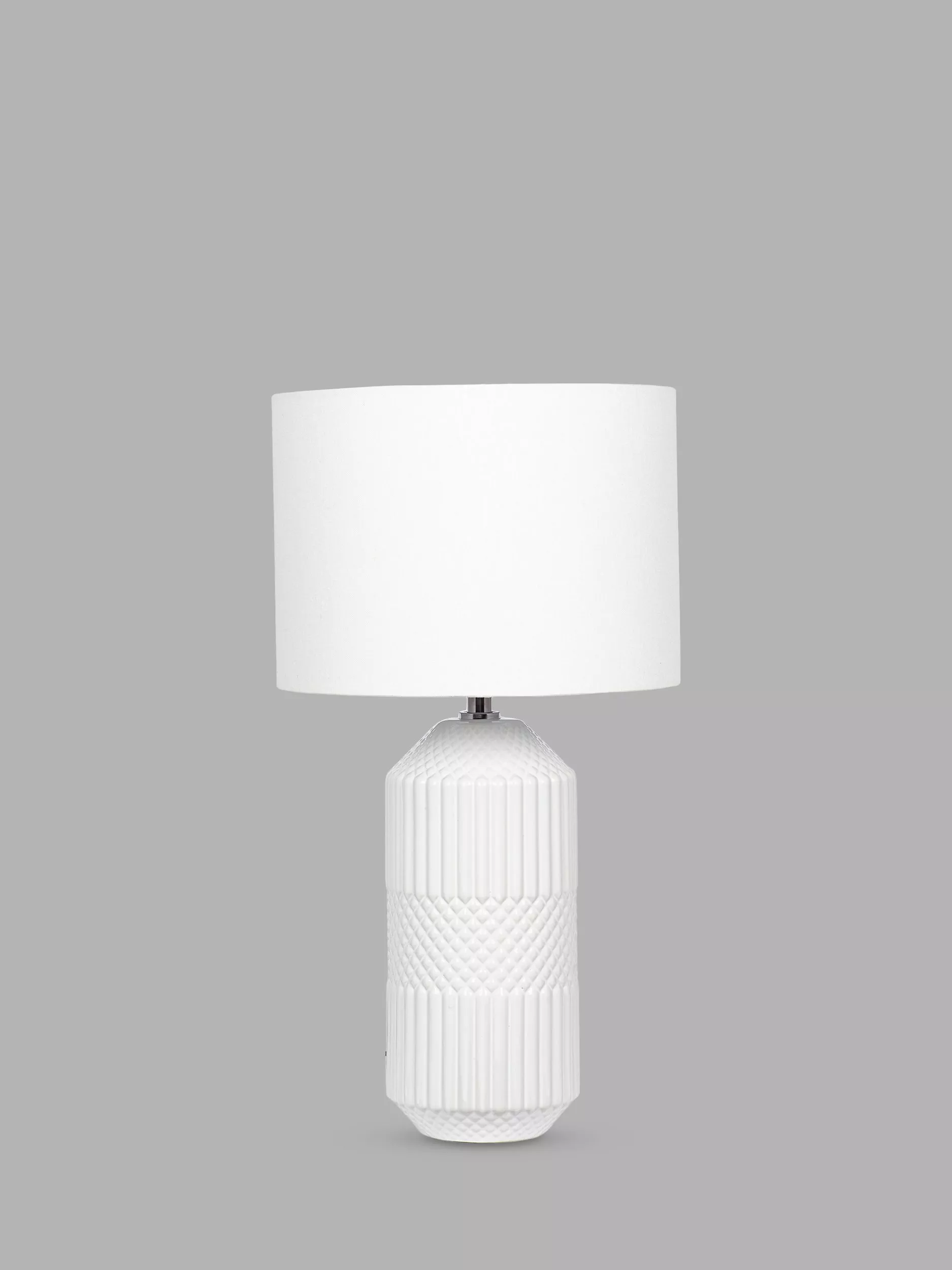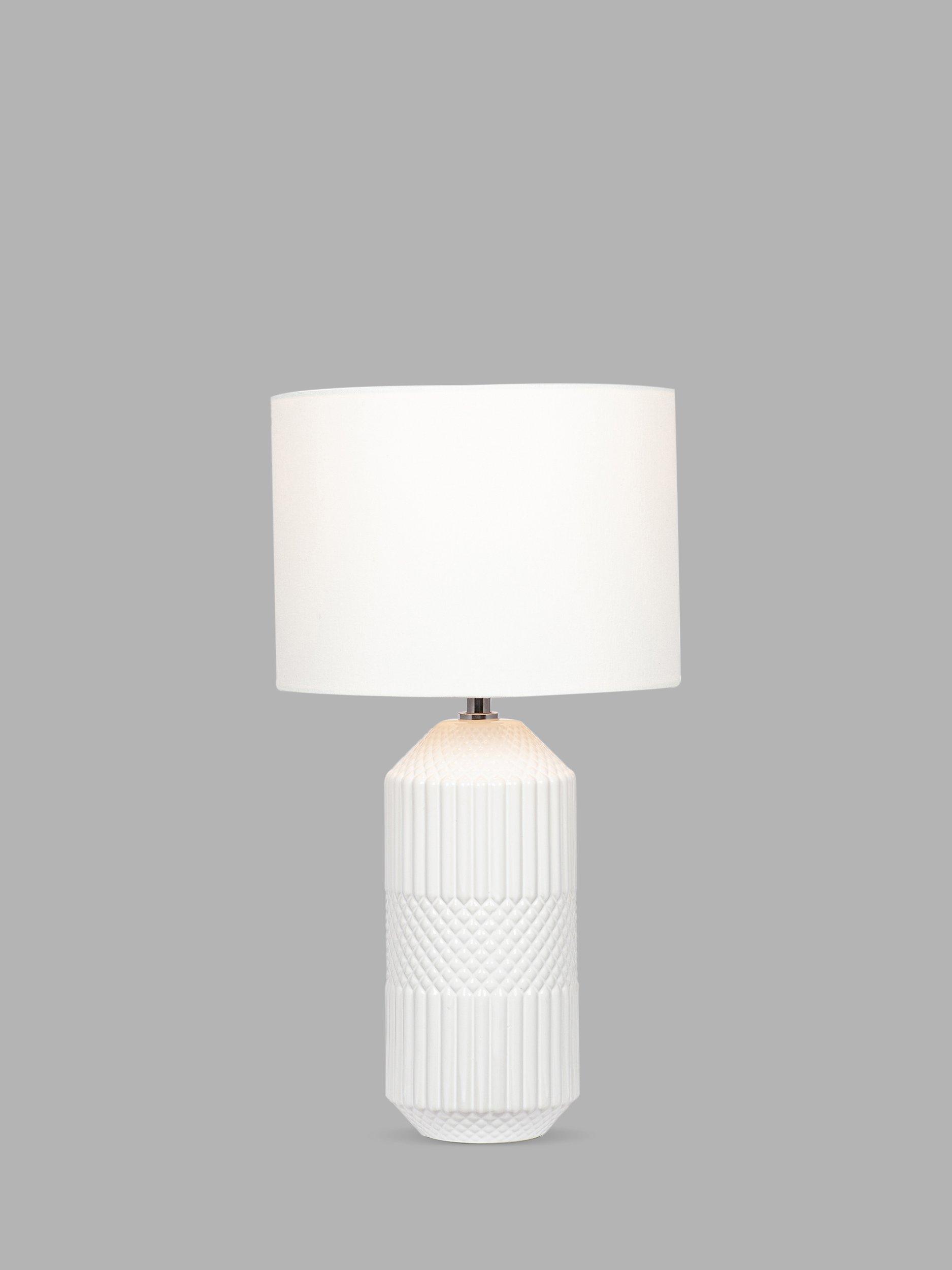 This beautiful tall, textured ceramic table lamp is finished in a simple glaze. Complete with a crisp white shade for a clean neutral look.