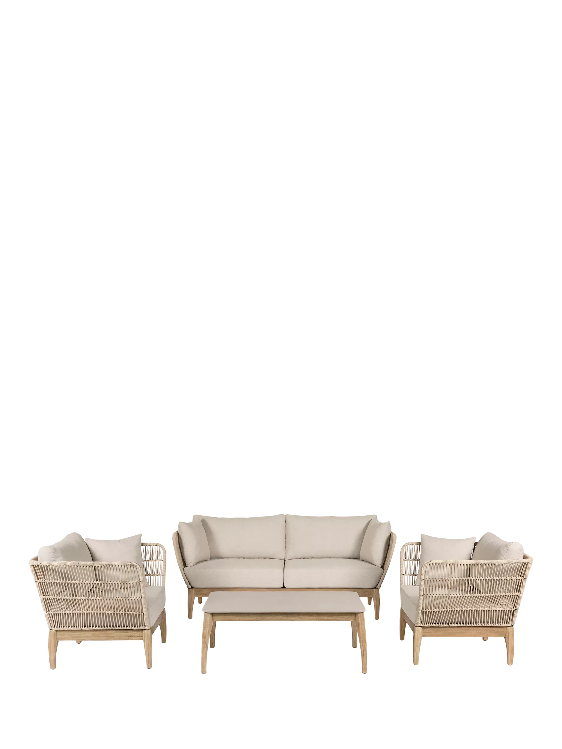 The Moeven, crafted in Vietnam, features a contemporary and comfortable design to give your garden a modern update. The four-seater garden lounge set features antique-effect acacia wood frames with a polyrope weave in a latte colour.