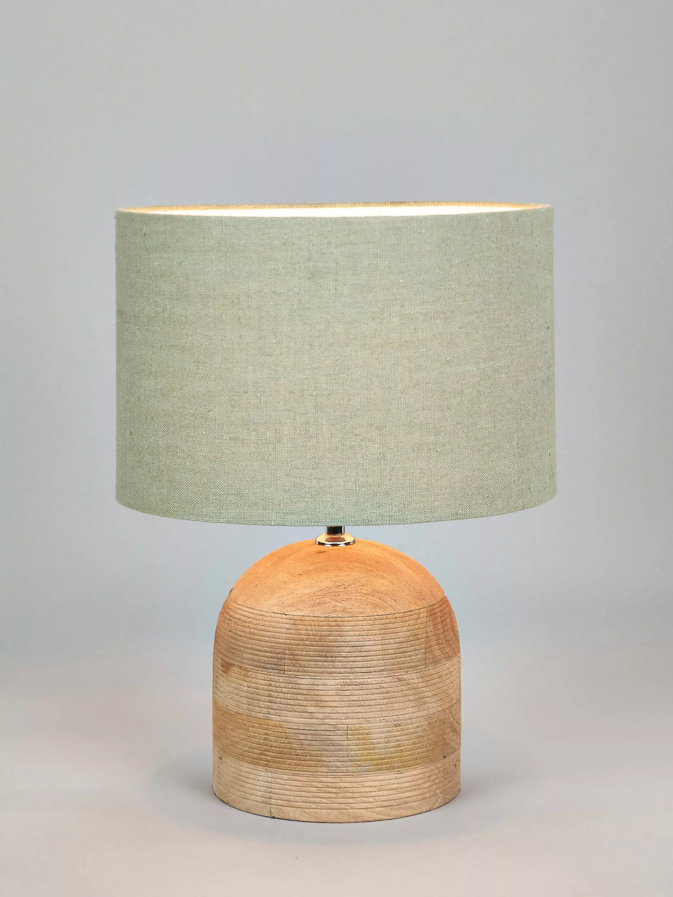 Modernise your decor with this stylish Nelu mango wooden dome-shaped table lamp. The intricately engraved stripe detailing is handmade in India and adds unique character. Topped with a lined, open weave lampshade that allows light to filter through.