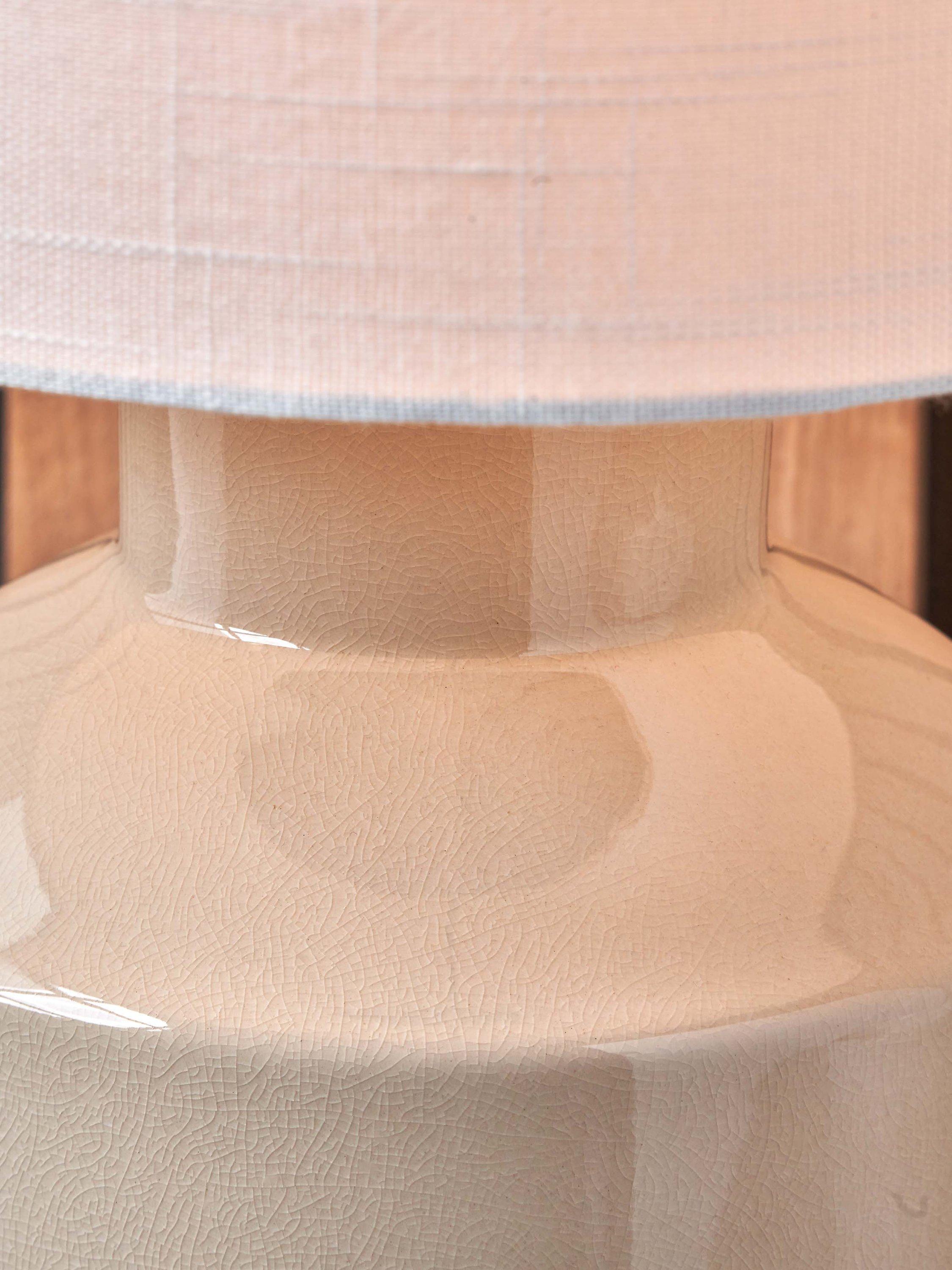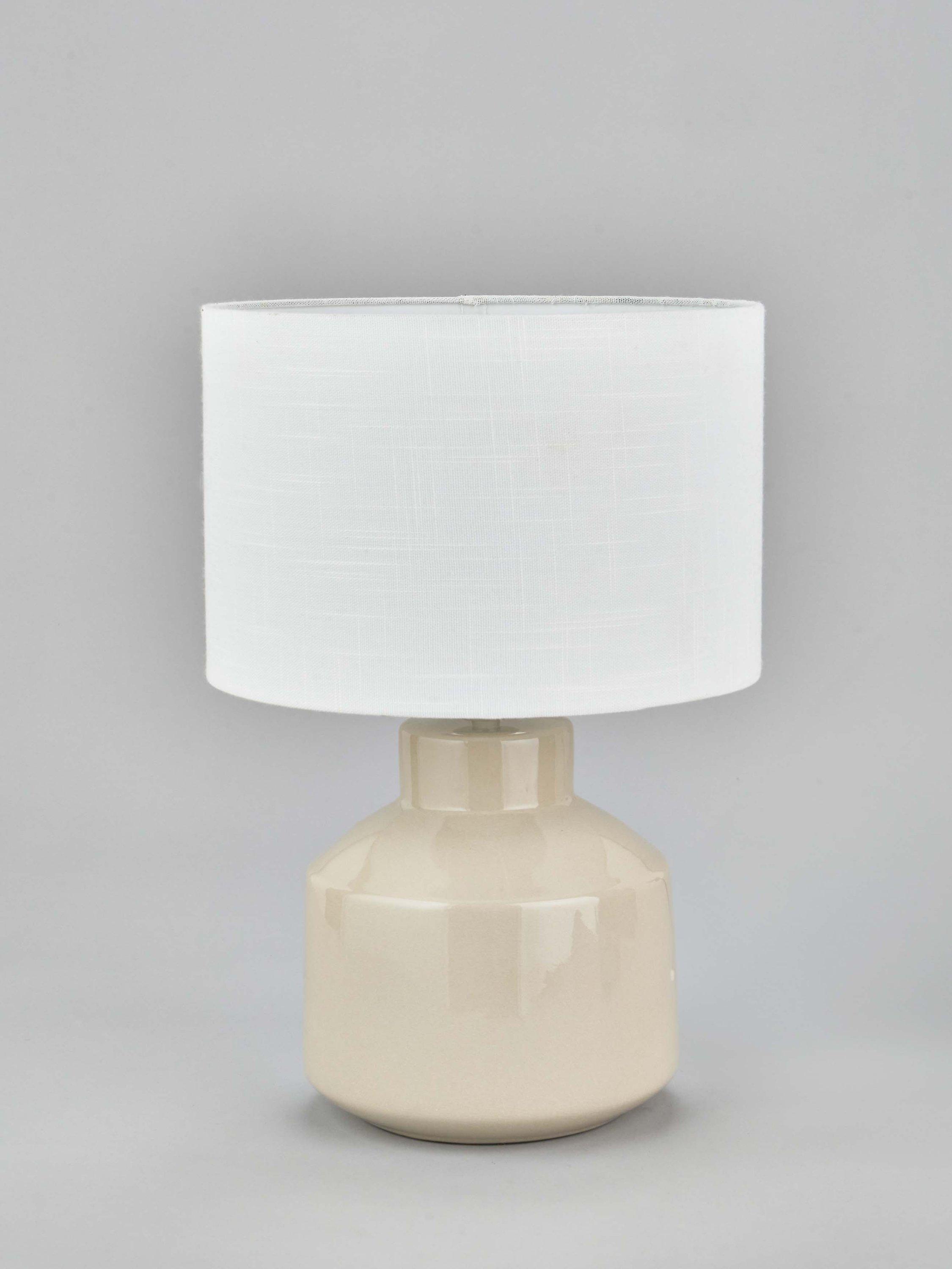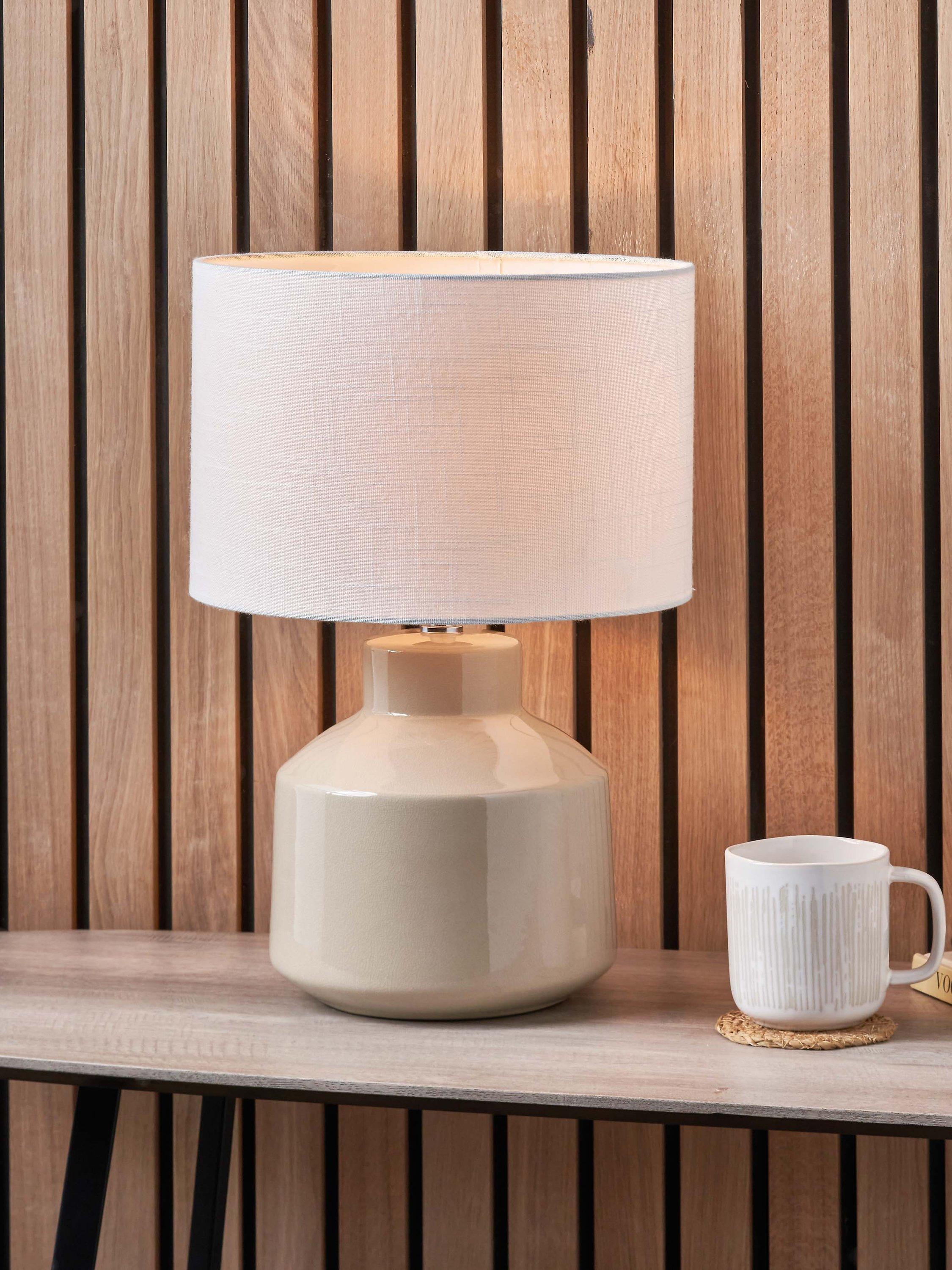 Scandi styling at its best, the Nora ceramic table lamp has a beautiful, gloss base with a subtle kiln effect crackle glaze. Topped with a lined, open weave lampshade that allows light to filter through.