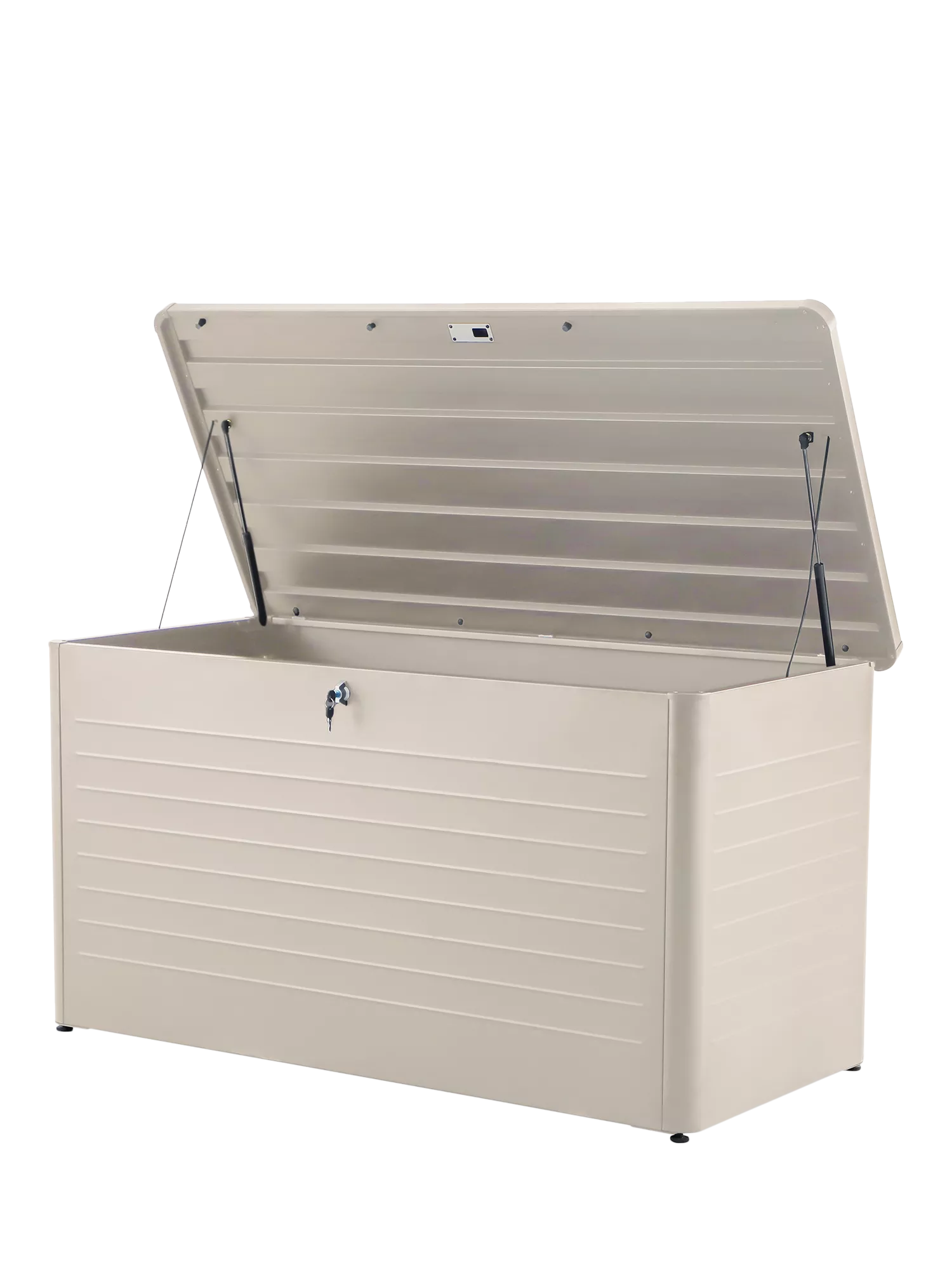 Galvanised steel cushion box with a contemporary, slim lid, designed with gas pump hinges for ease of closing and opening. Adjustable feet keep it level when it's on the patio, ready to store your garden cushions inside. A lock and key ensure security.