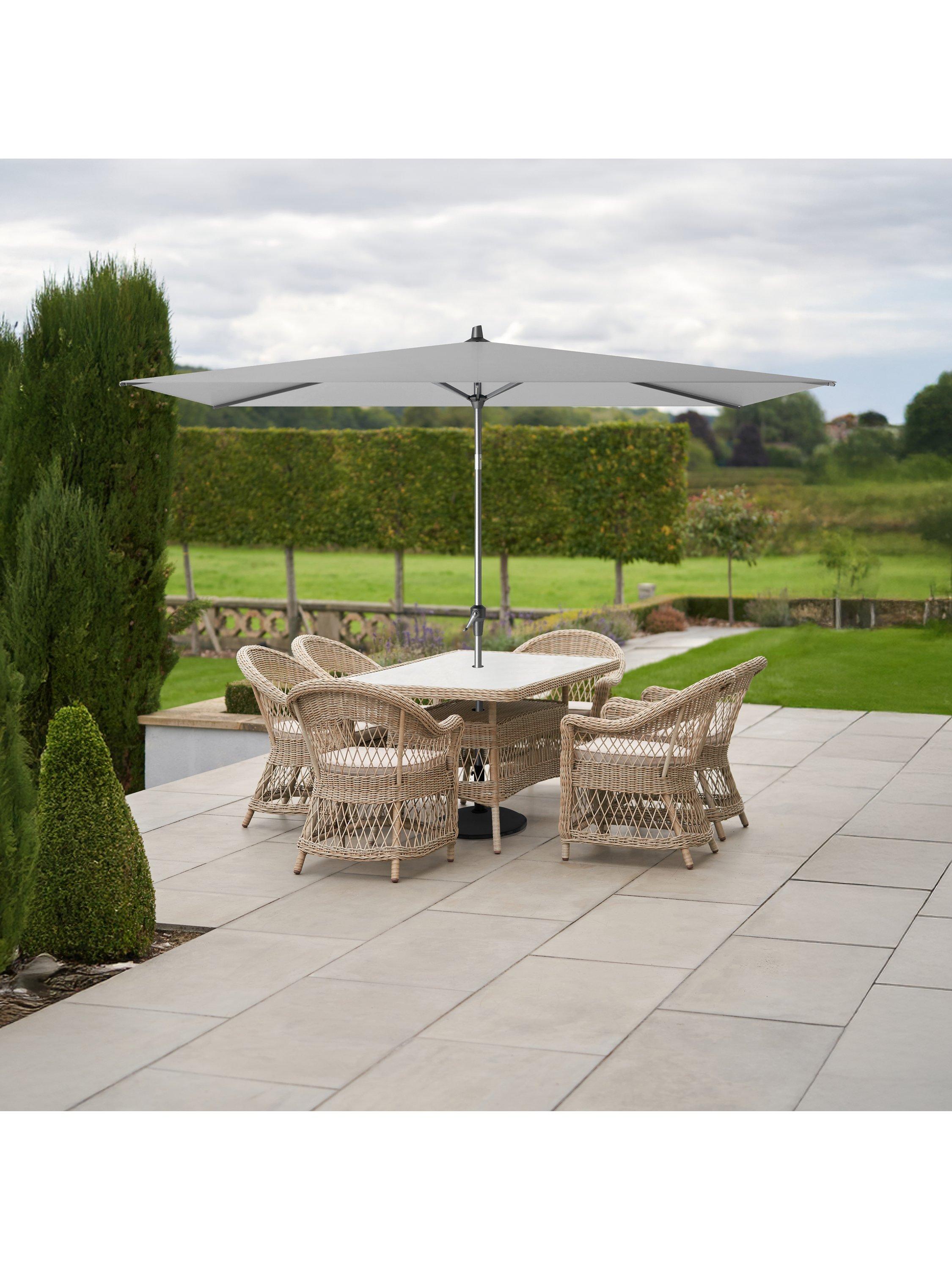 The Riva centre-pole rectangular parasol has a strong, contemporary aesthetic, and is ideal for rectangular outdoor dining tables or seating sets. The parasol is easy to open and close thanks to its easy-up winding system to create the perfect shade in your garden, patio or balcony.