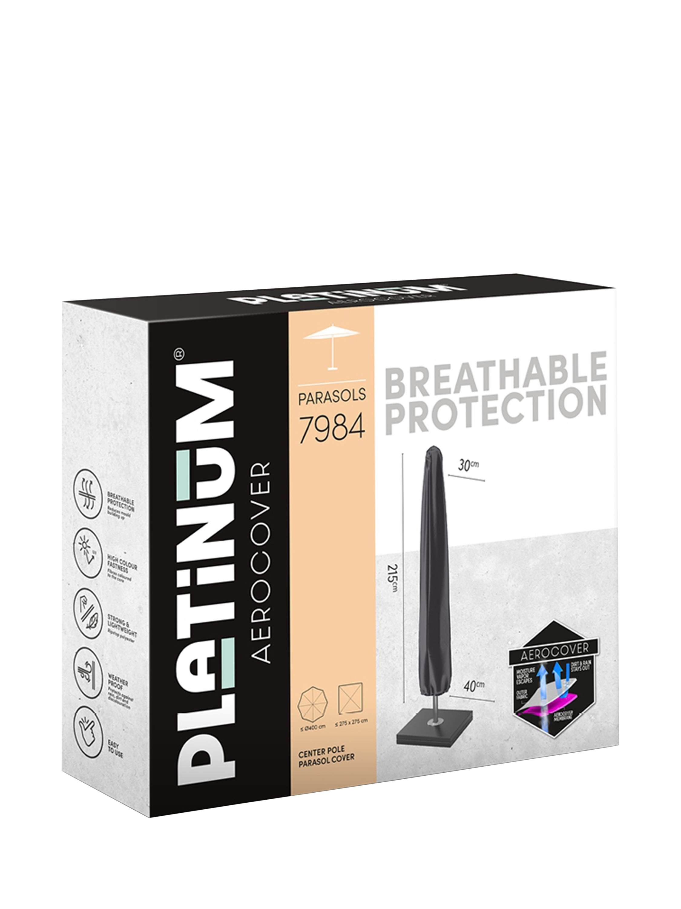 Comes with a Platinum Aerocover to protect your parasol. The breathable cover features a sewn-in rod for easy placement. It's water-resistant and provides UV protection for year-round cover.