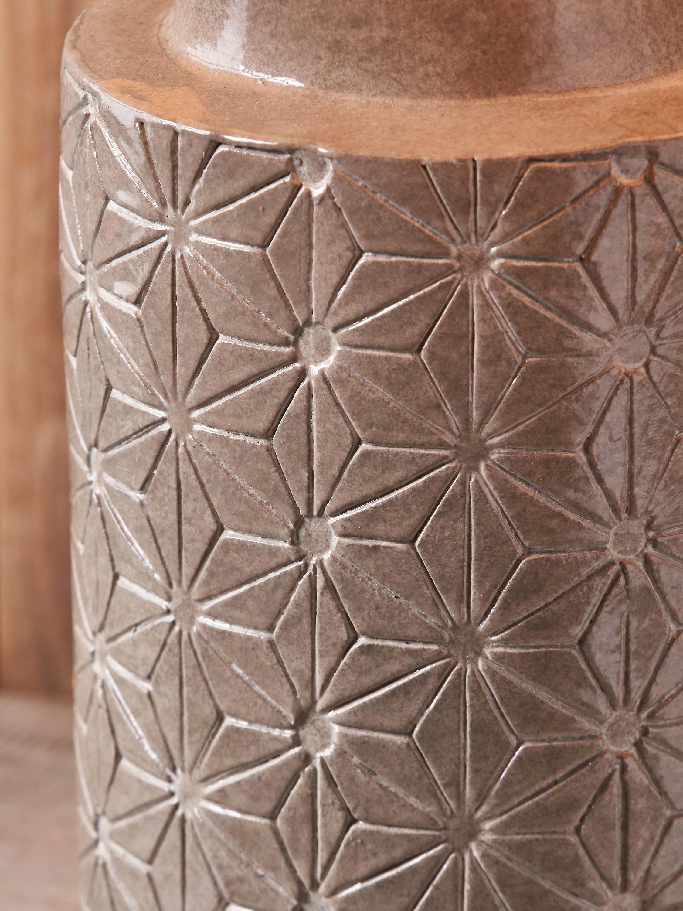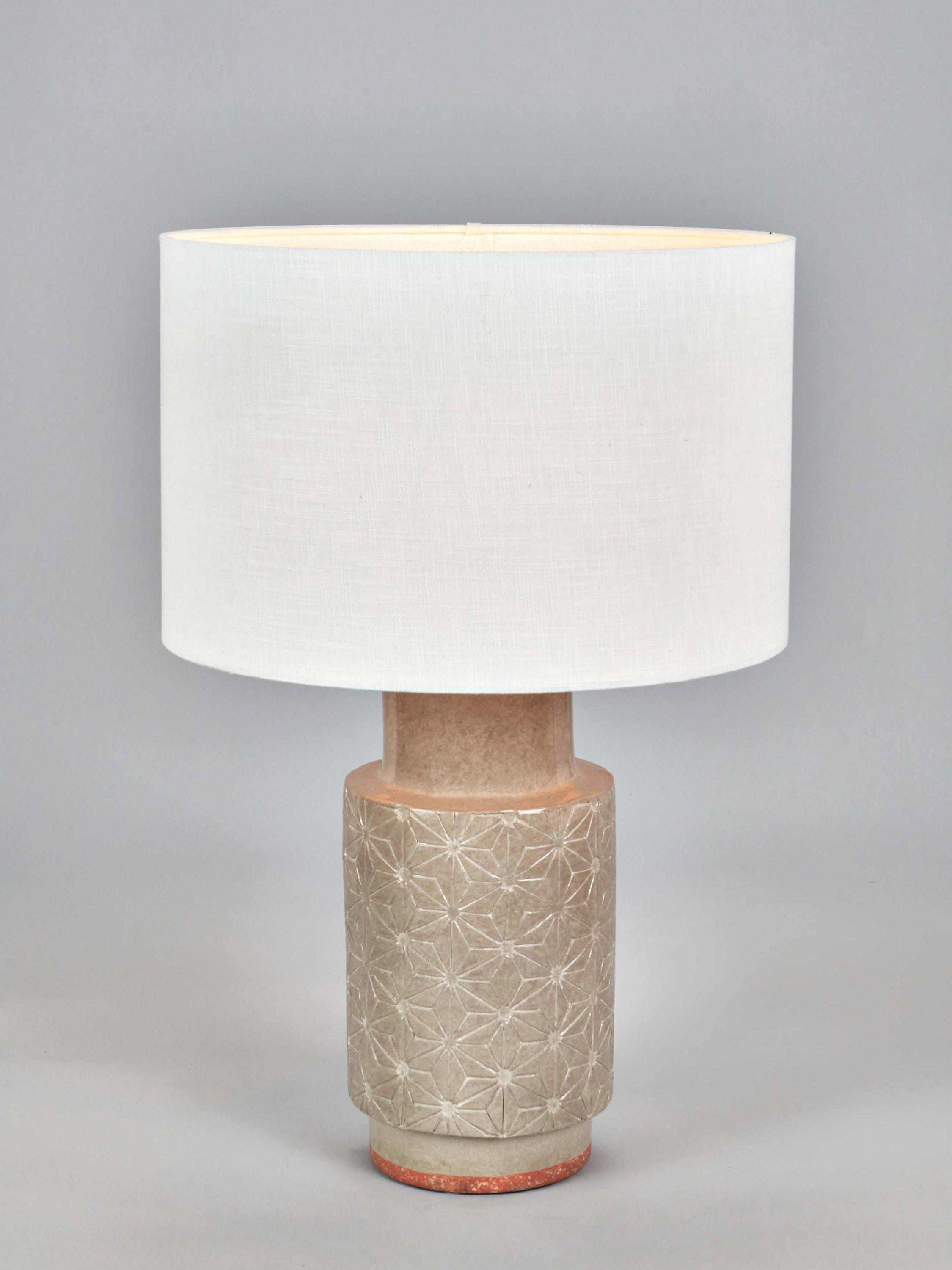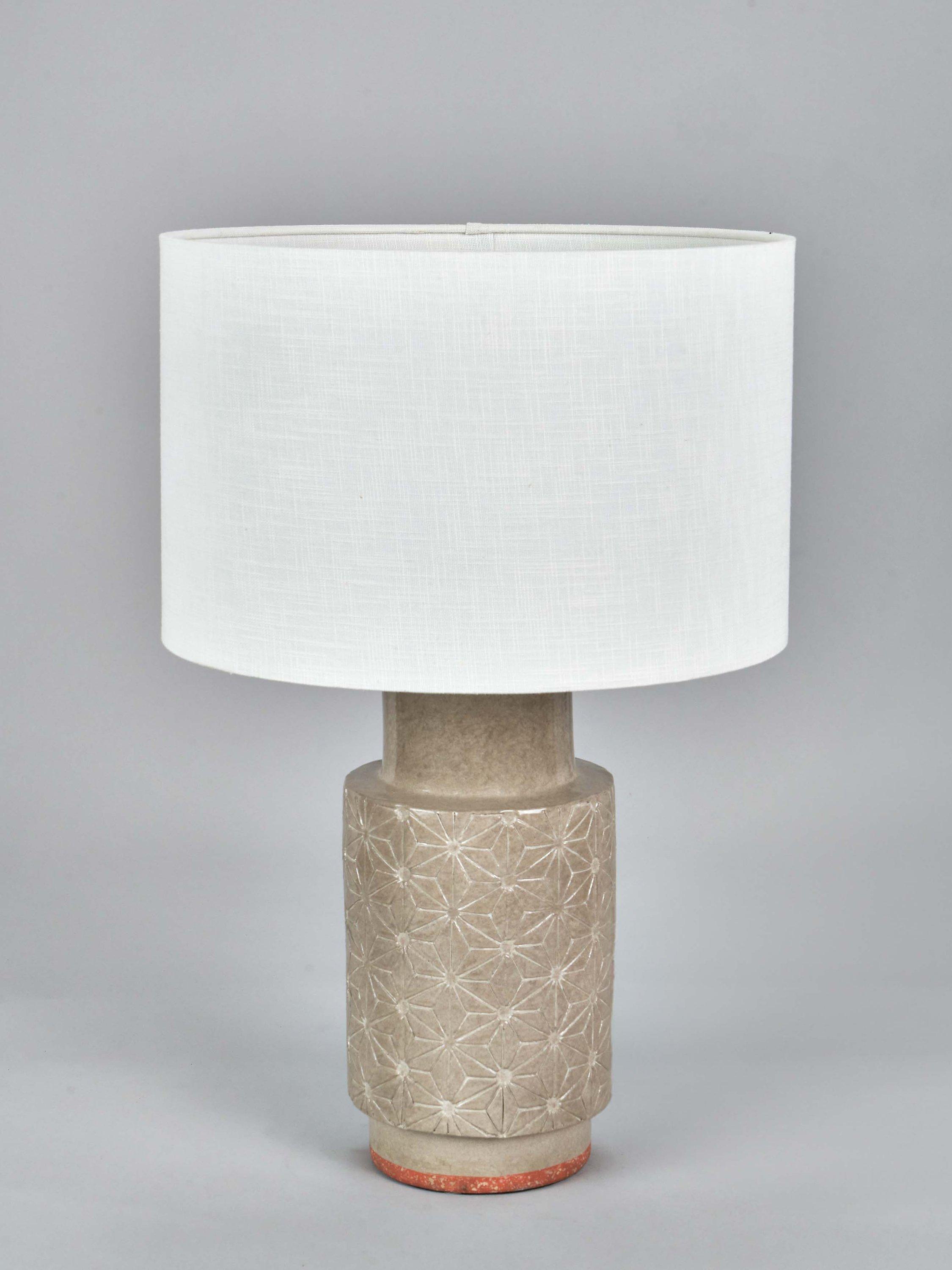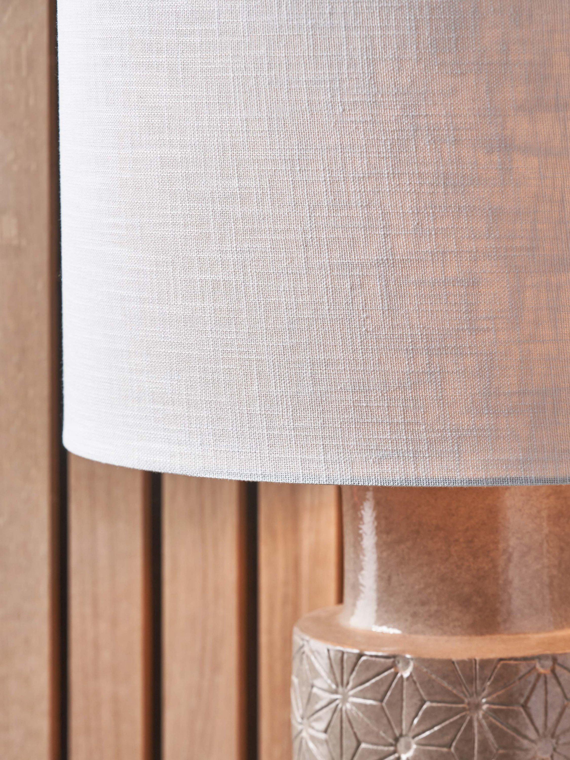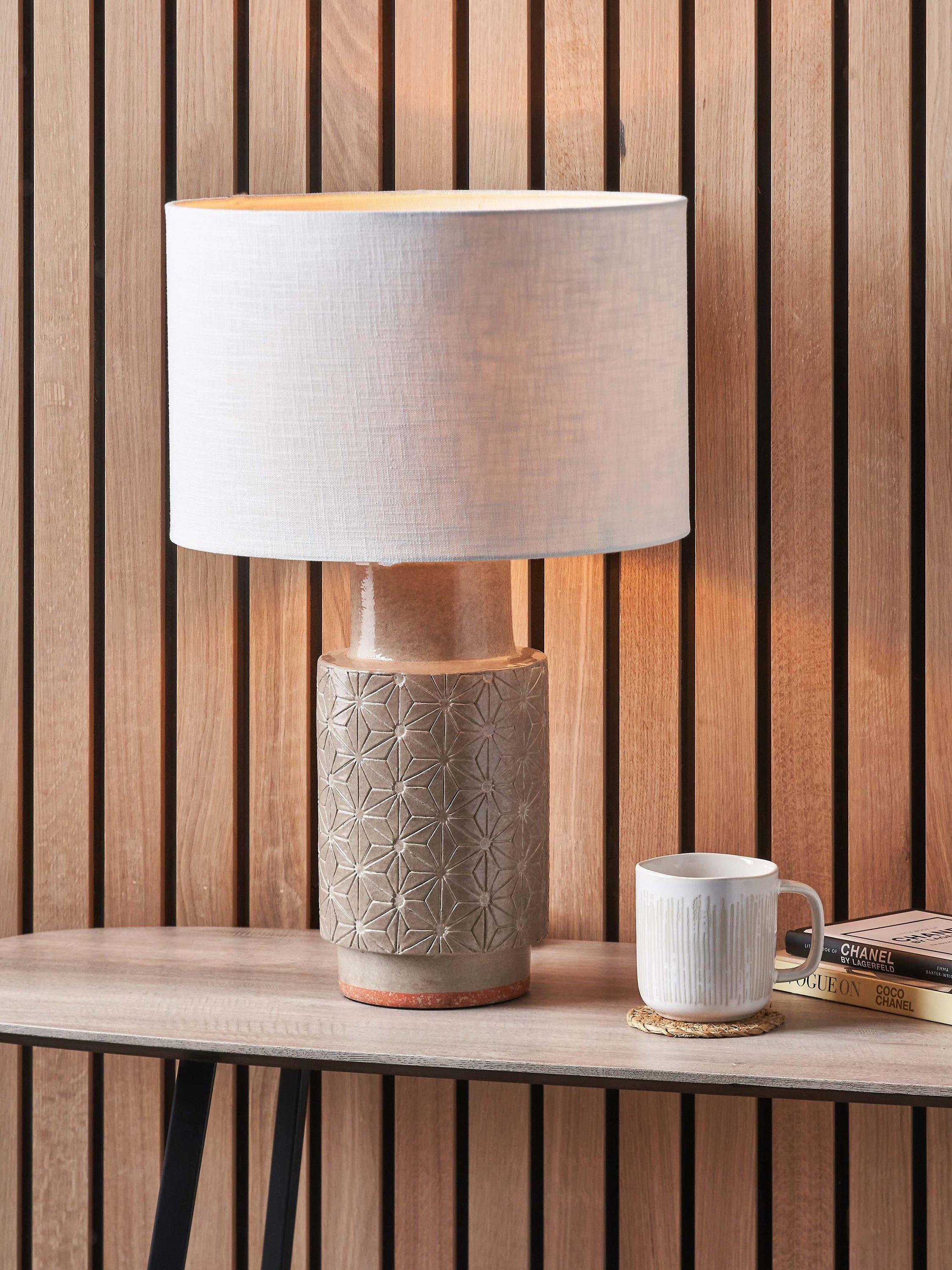 The Sidra stoneware table lamp is handmade in the Philippines and has a modern starburst engraved pattern. Topped with a lined, open weave lampshade that allows light to filter through.