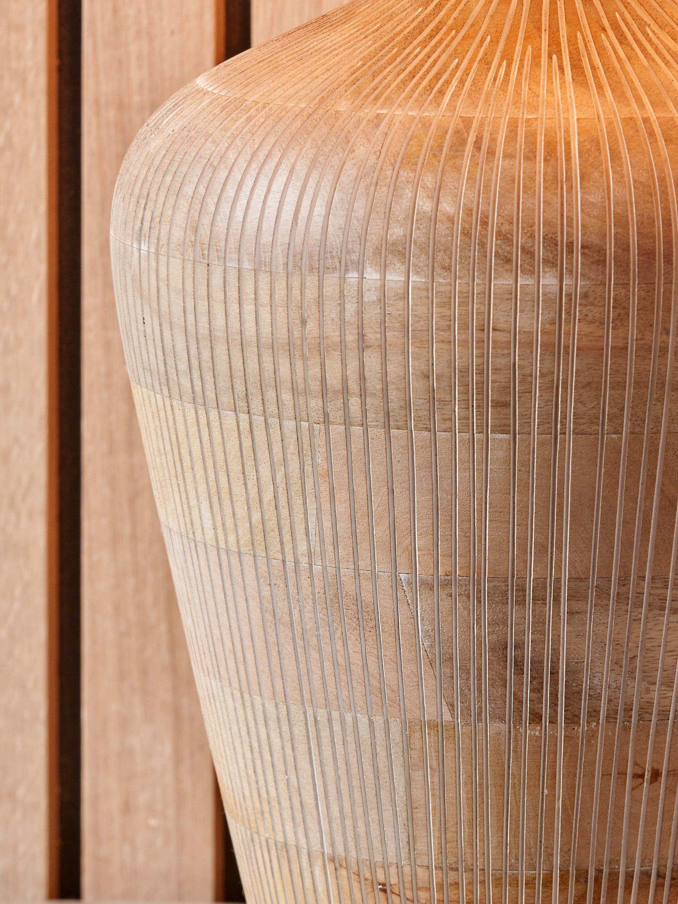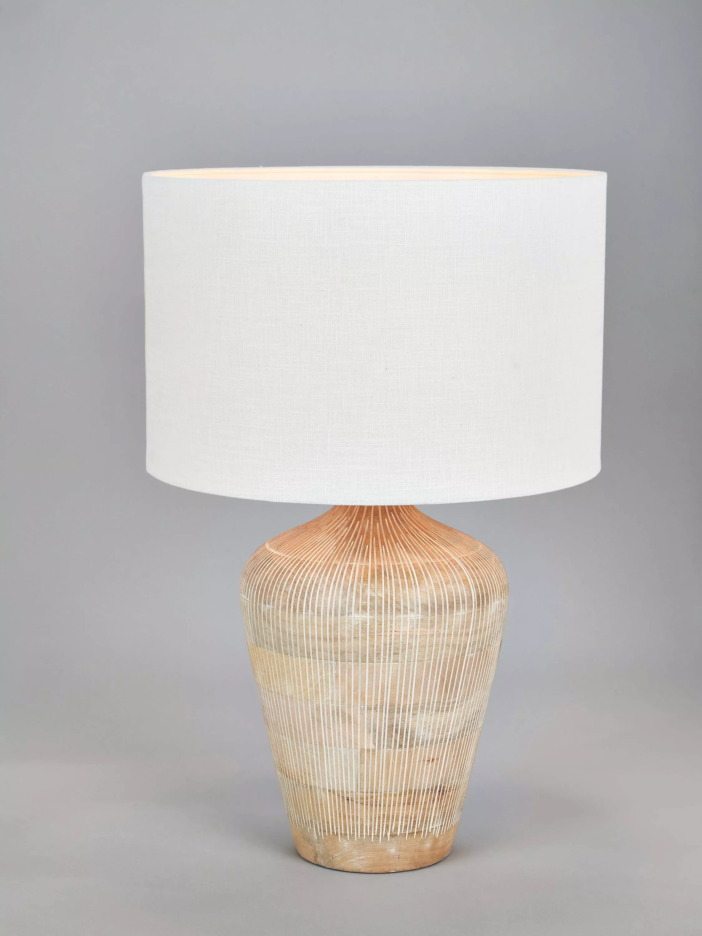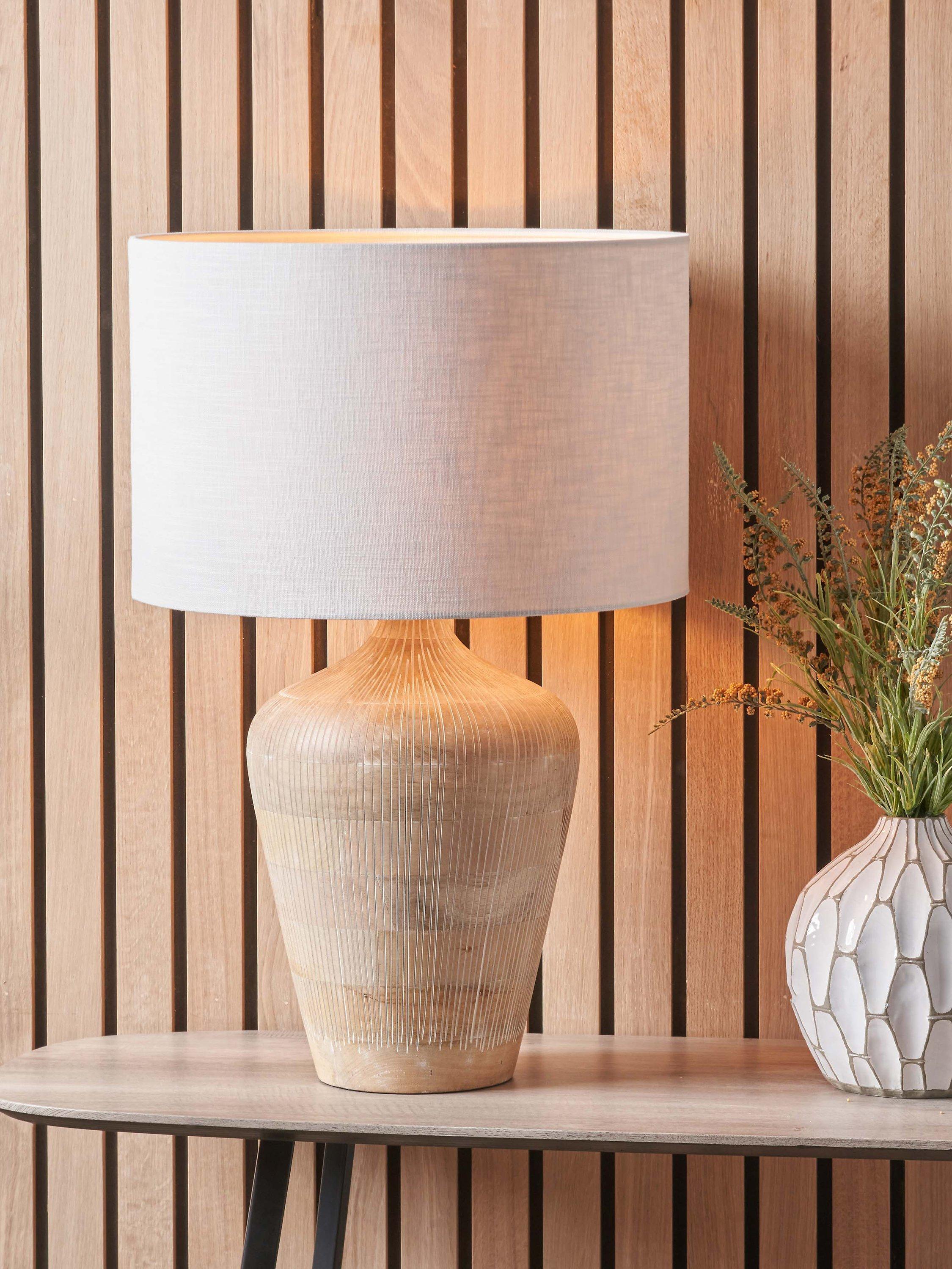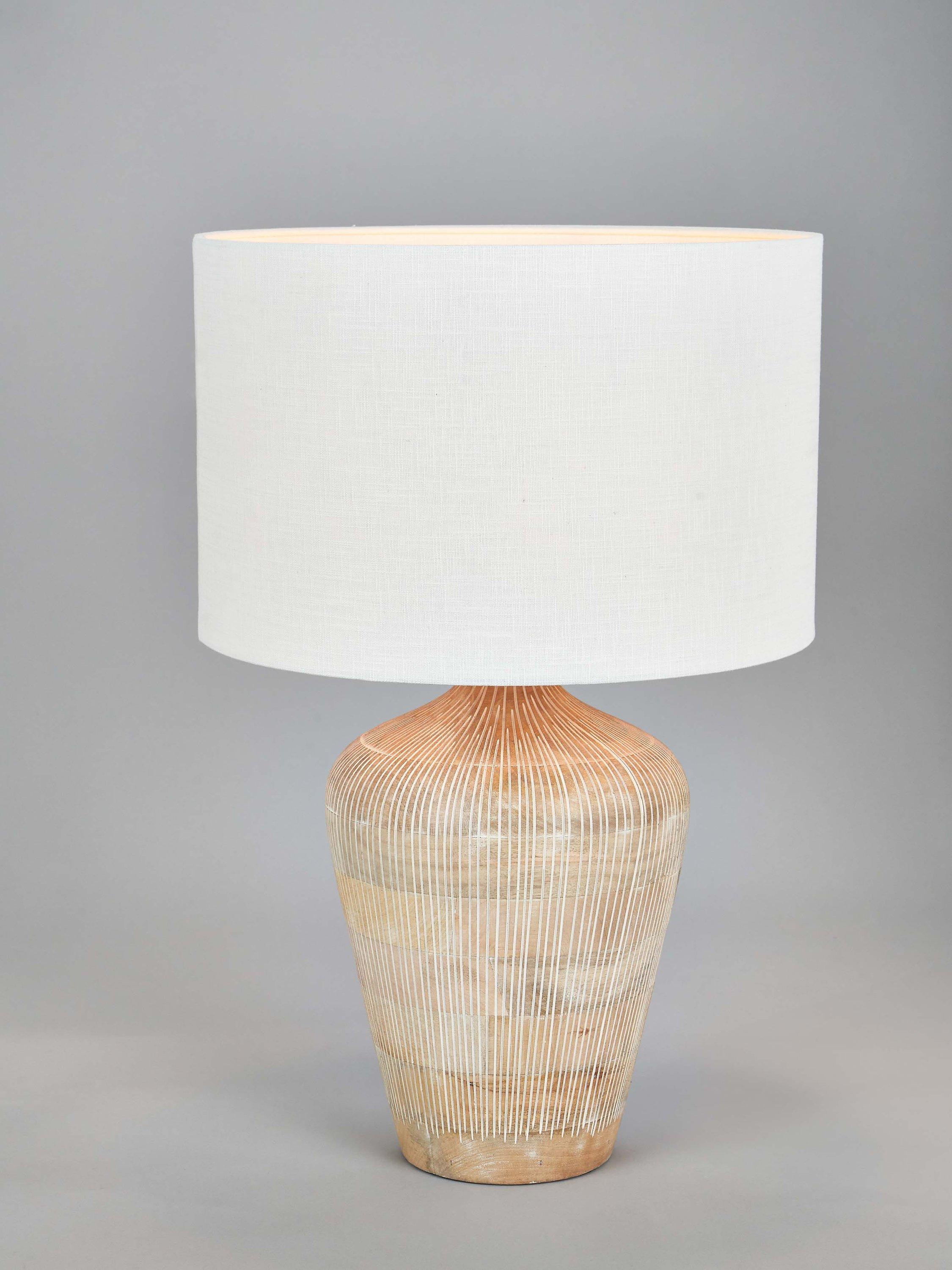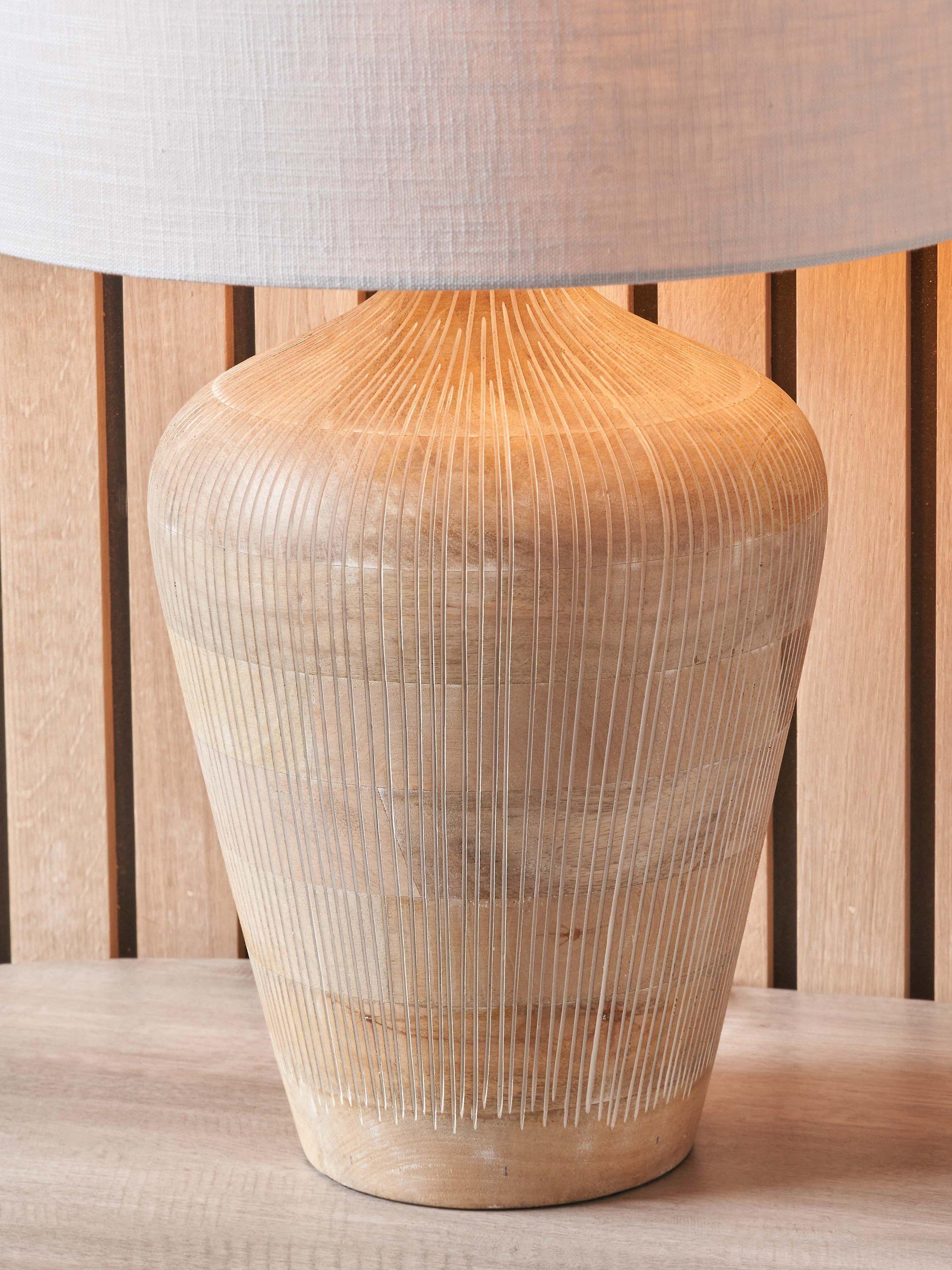 Designed in a tall, curved and elegant shape, the Taika is a contemporary table lamp made from mango wood. Hand carved in India, it is finished in a subtle whitewash for a neutral Scandi look. Topped with a lined, open weave lampshade that allows light to filter through.