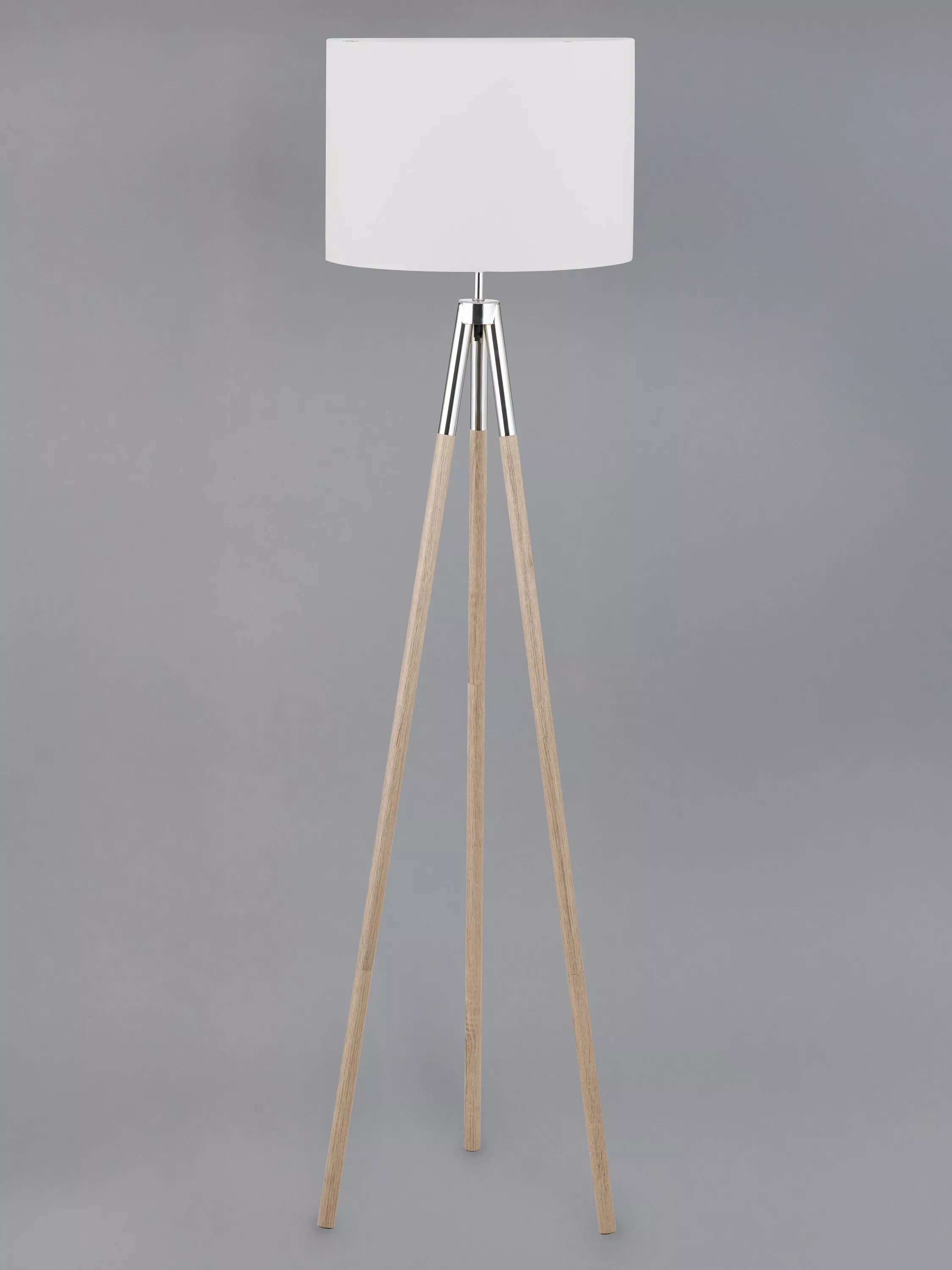 This contemporary tripod floor lamp is finished in wood veneer with a metal accent and topped off beautifully with a neutral lampshade. This floor lamp, featuring three slim legs, will slot easily into any interior space, offering an extra light source and sophisticated styling.