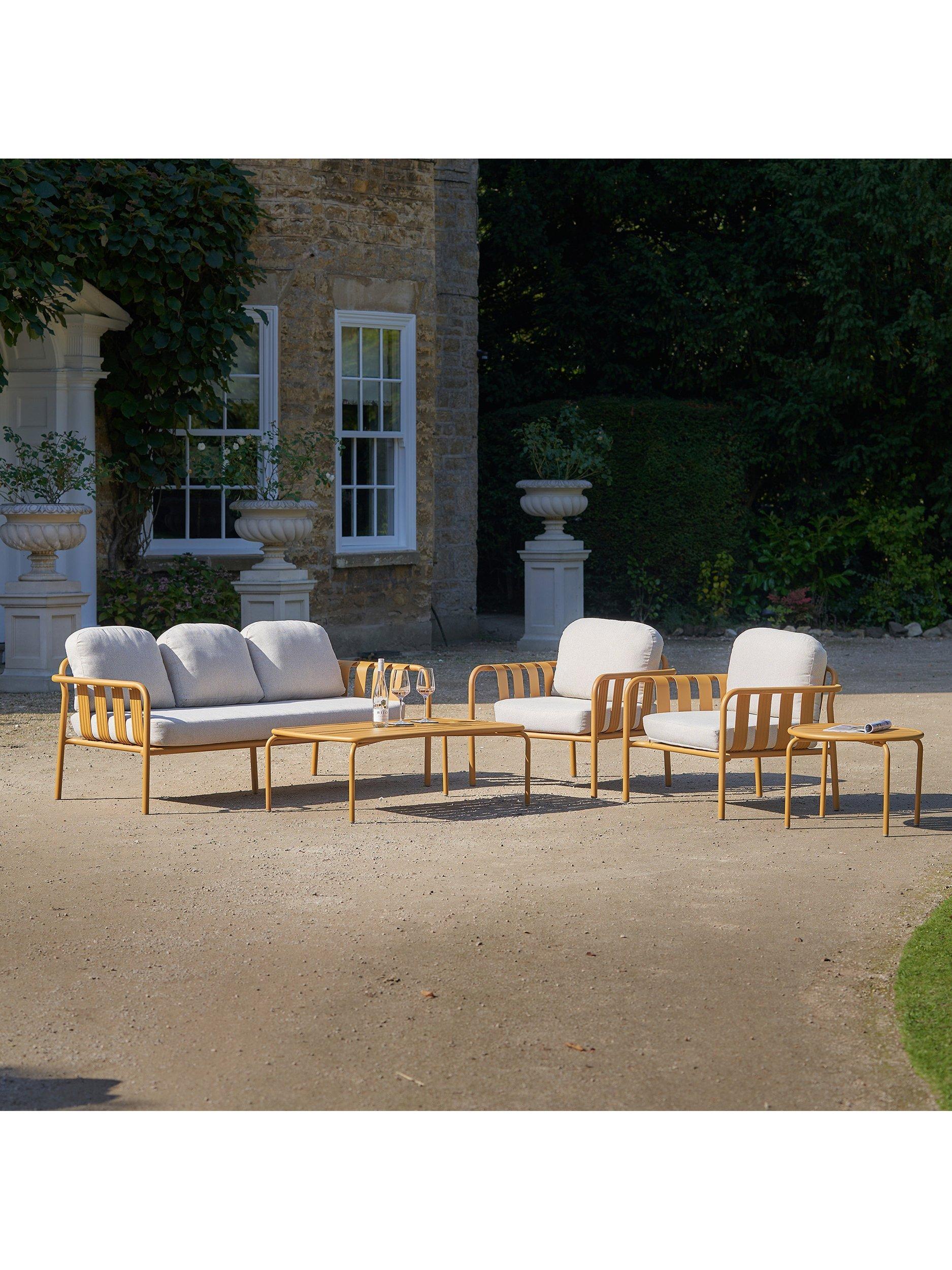 The Valletta features powder-coated aluminium frames in a contemporary design. This lounge set includes a three-seater garden sofa, two matching garden lounge chairs, a rectangular coffee table and a round side table.