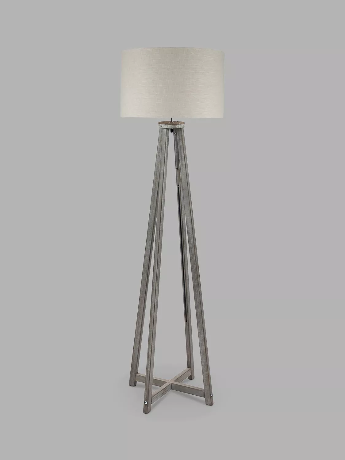 Simply stylish, the Whitby floor lamp has four tapered wooden legs and an elegant criss cross detail at the base. The slender profile and neutral washed grey wood is a match for most decor. Topped with a 45cm linen effect grey cylinder lampshade.