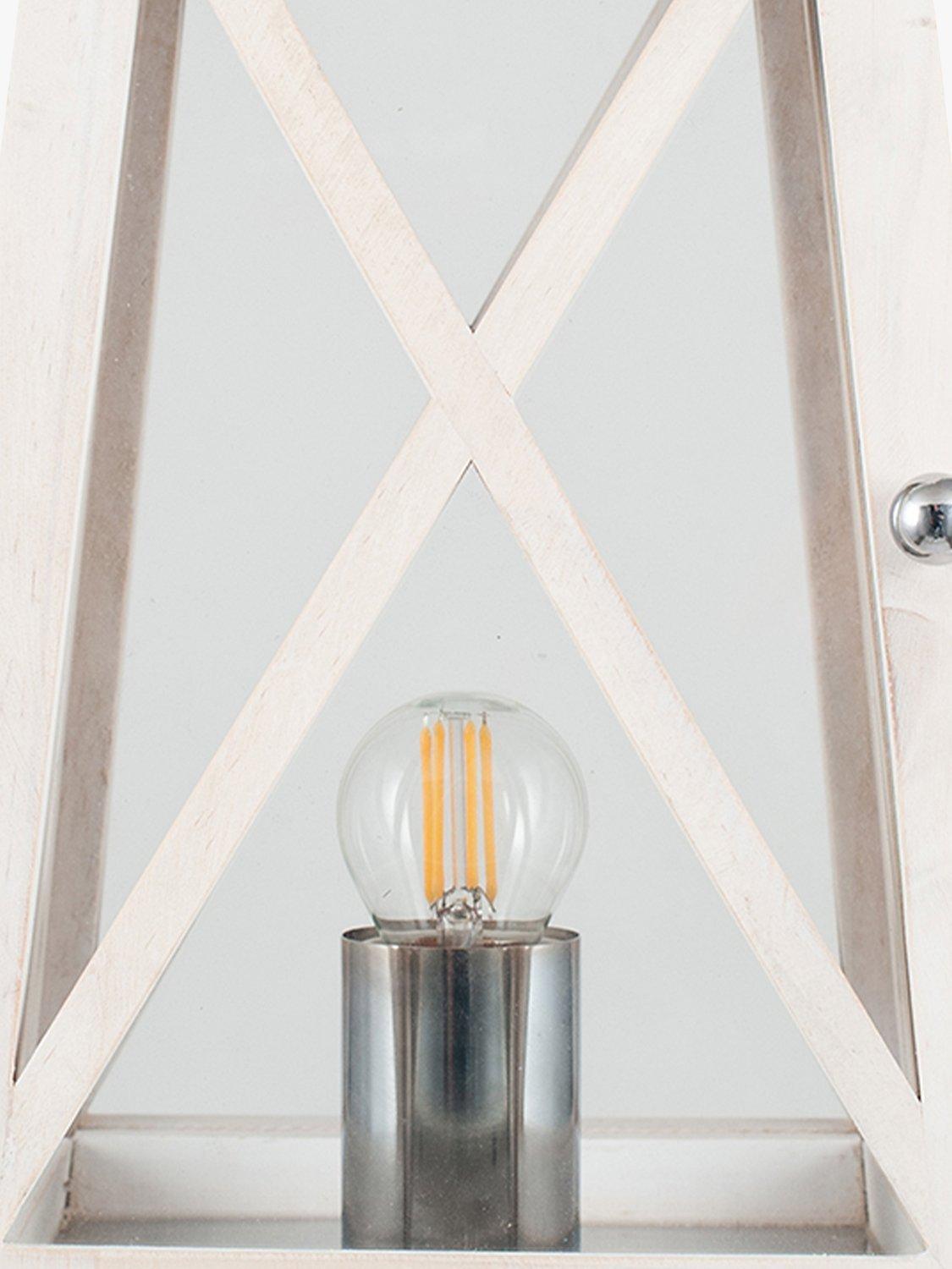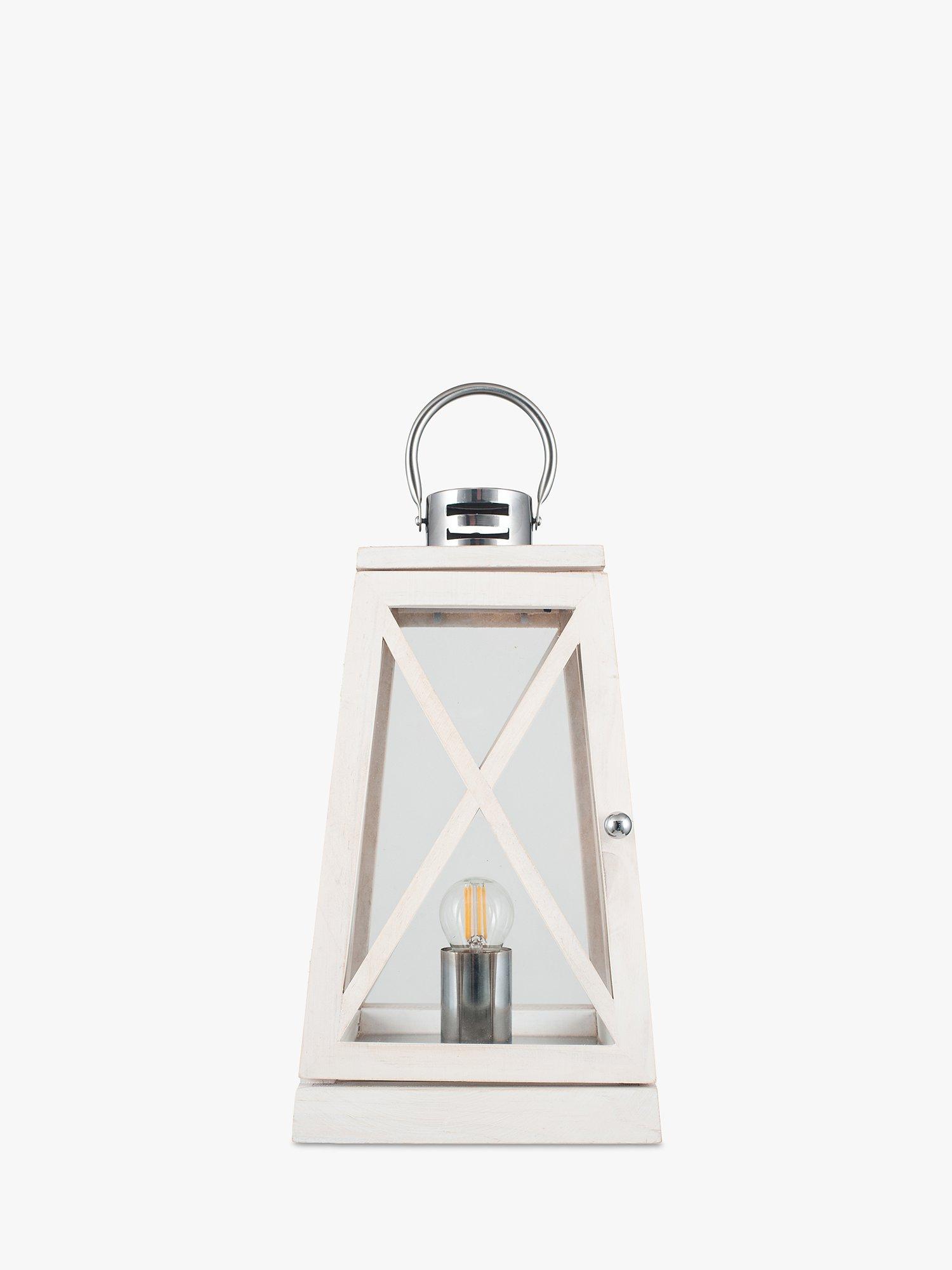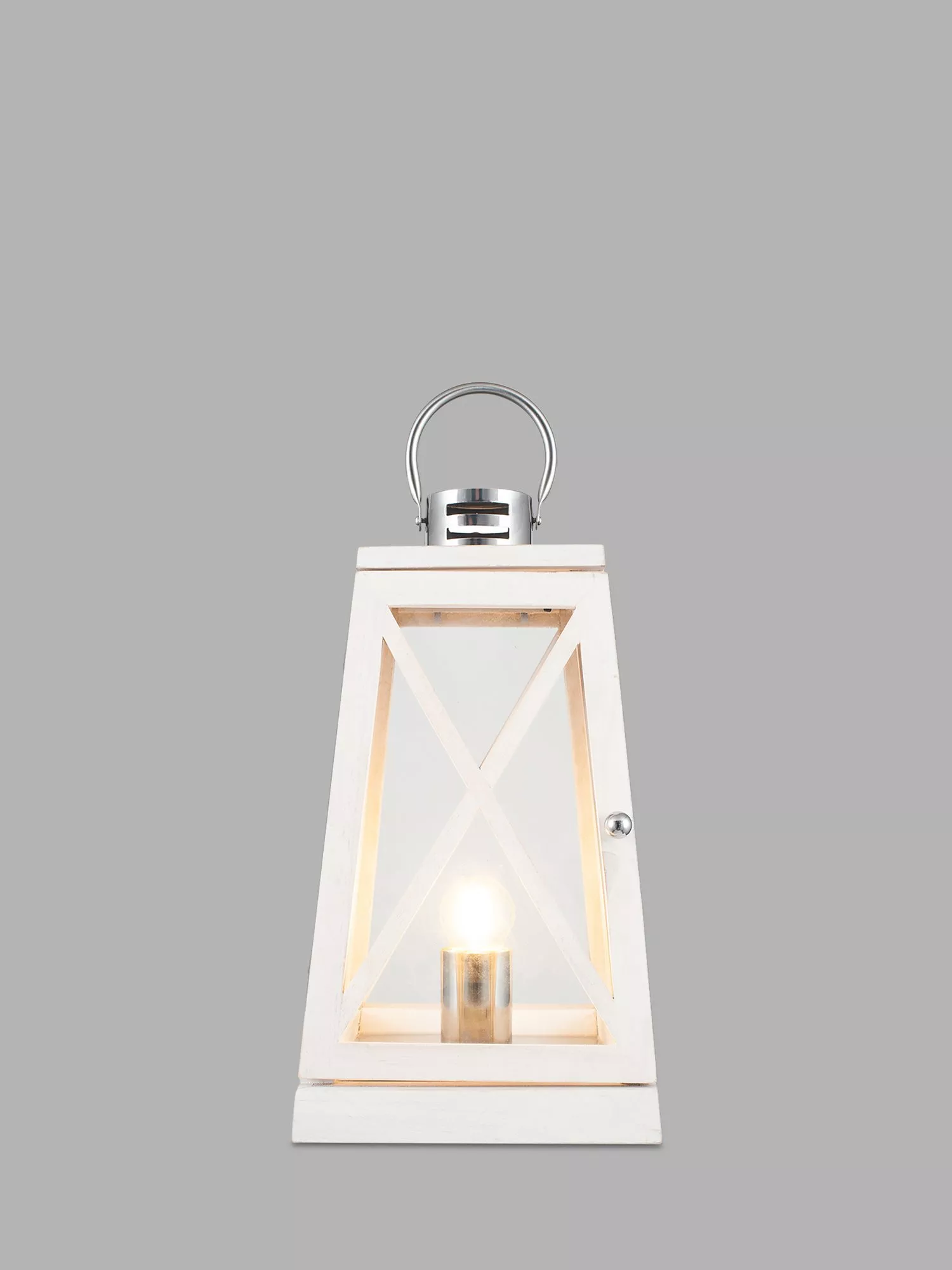 A calming, coastal-inspired table lamp in the design of a lantern. It's made from white wash wood and its tapered square shape maximises the light output. Perfect for adding ambience to your space, it's accented with polished metal hardware.