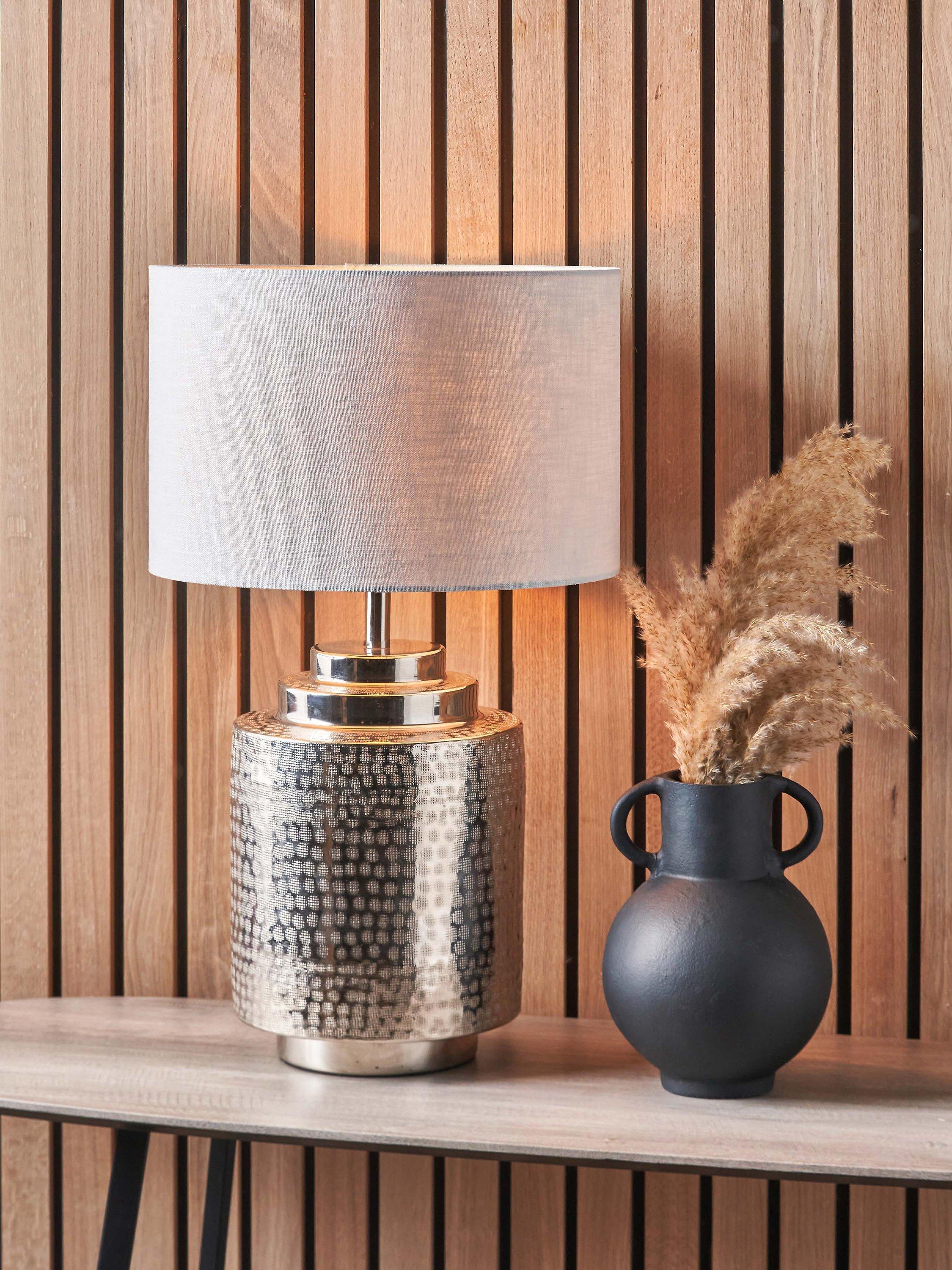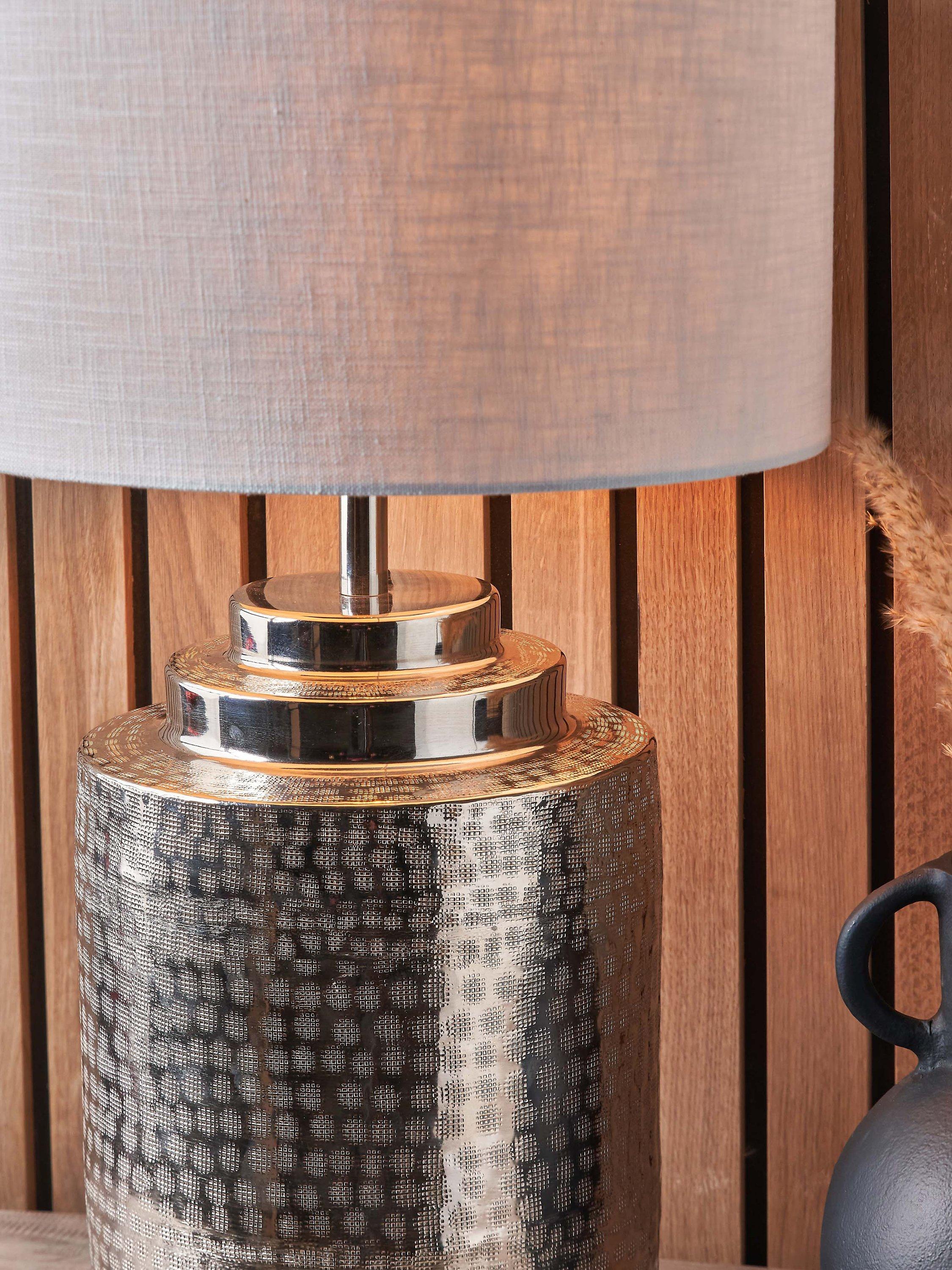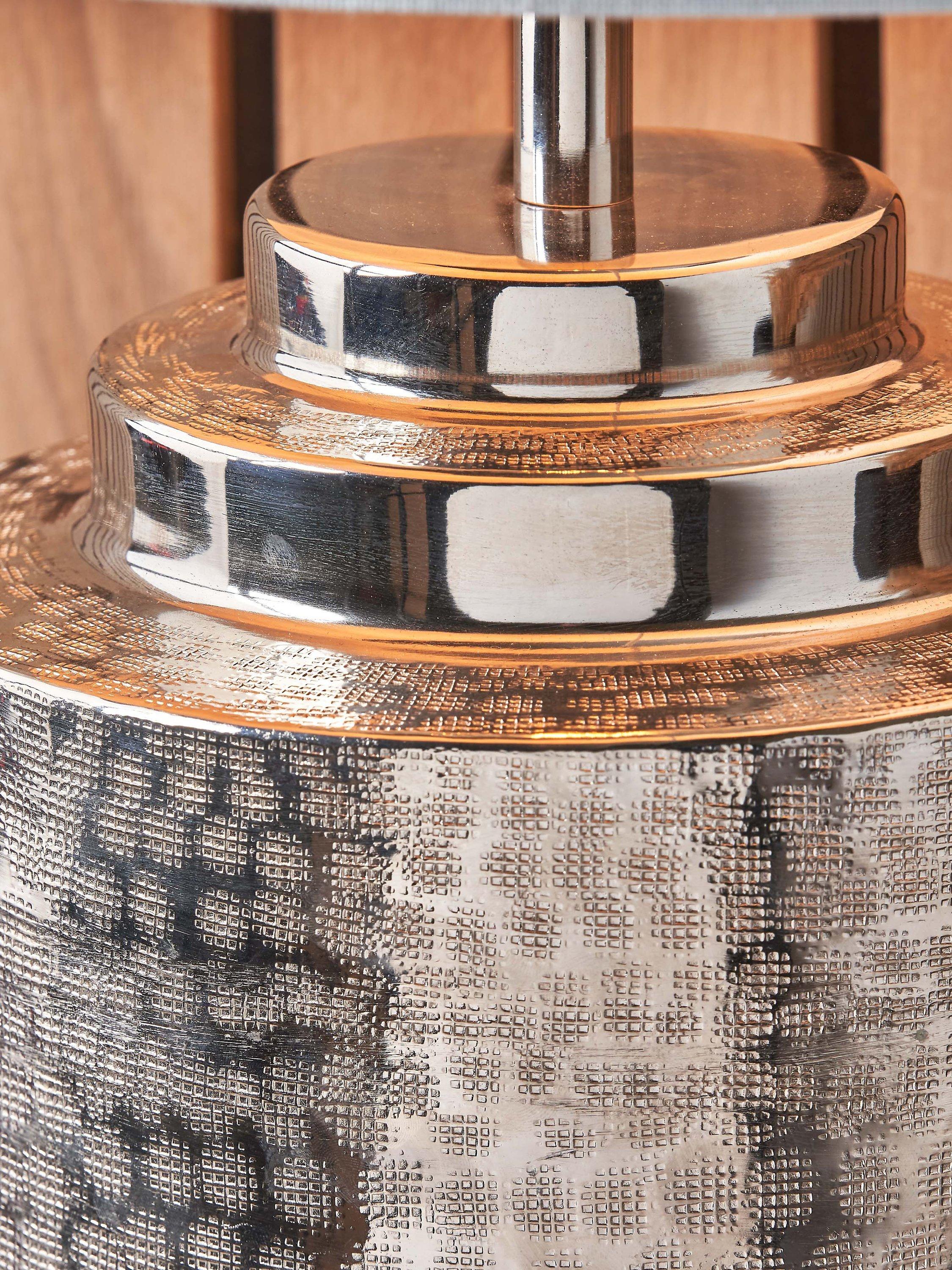 This stylish shiny metal table lamp is made in India using the long-standing technique of hand-hammering. Topped with a lined, open weave lampshade that allows light to filter through.