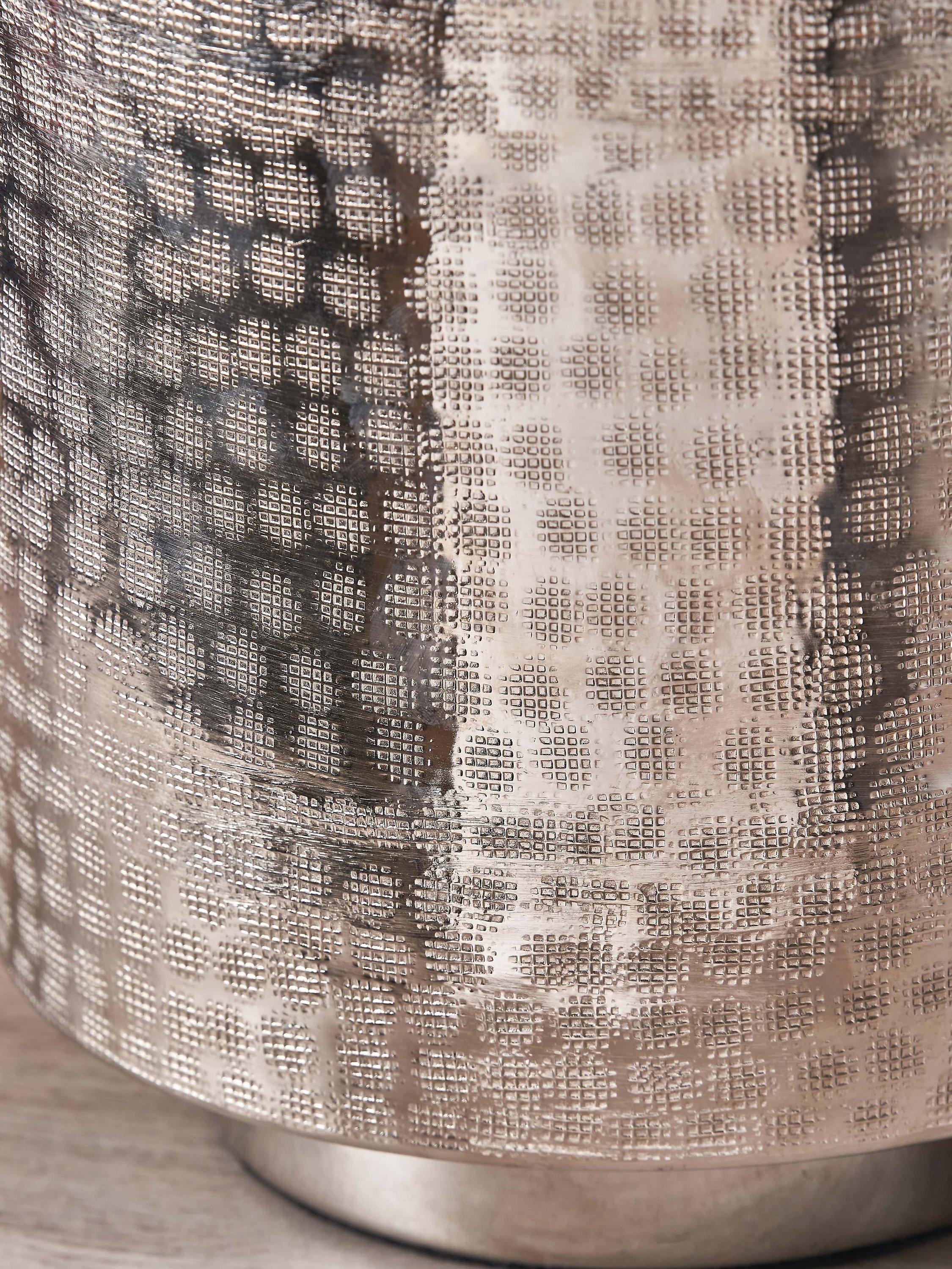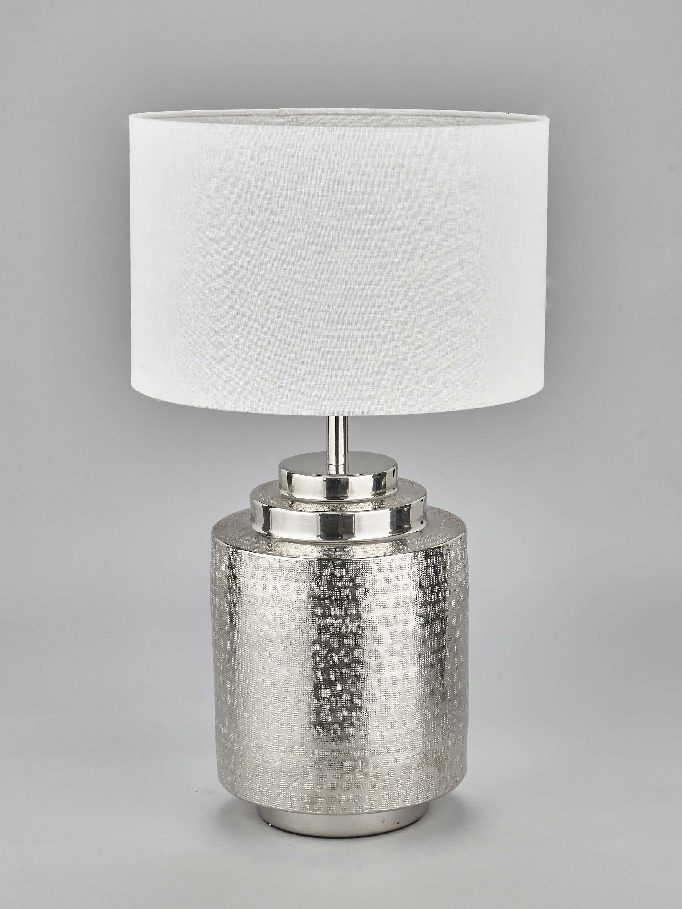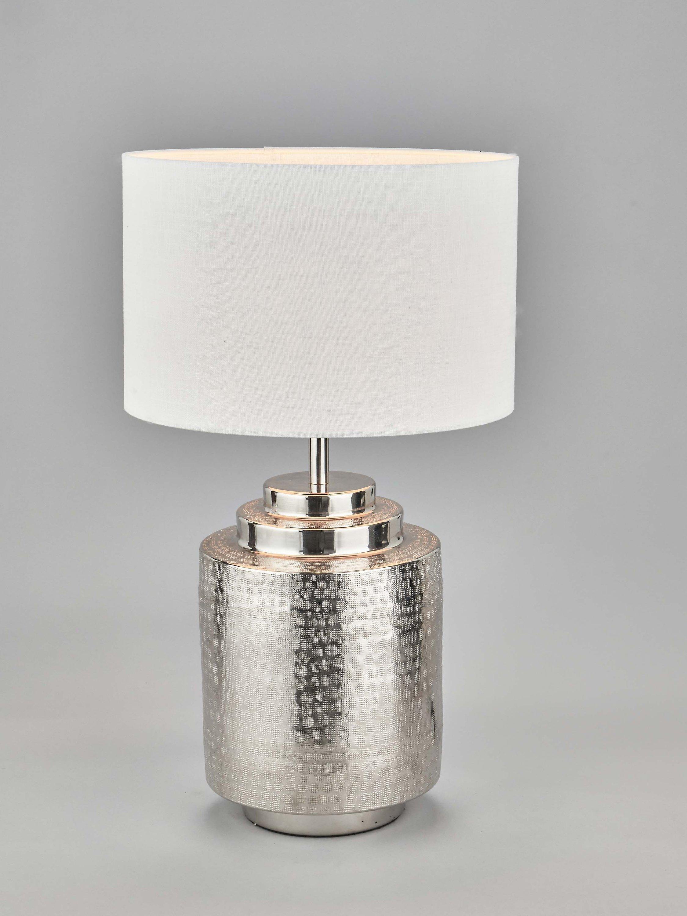 This stylish shiny metal table lamp is made in India using the long-standing technique of hand-hammering. Topped with a lined, open weave lampshade that allows light to filter through.