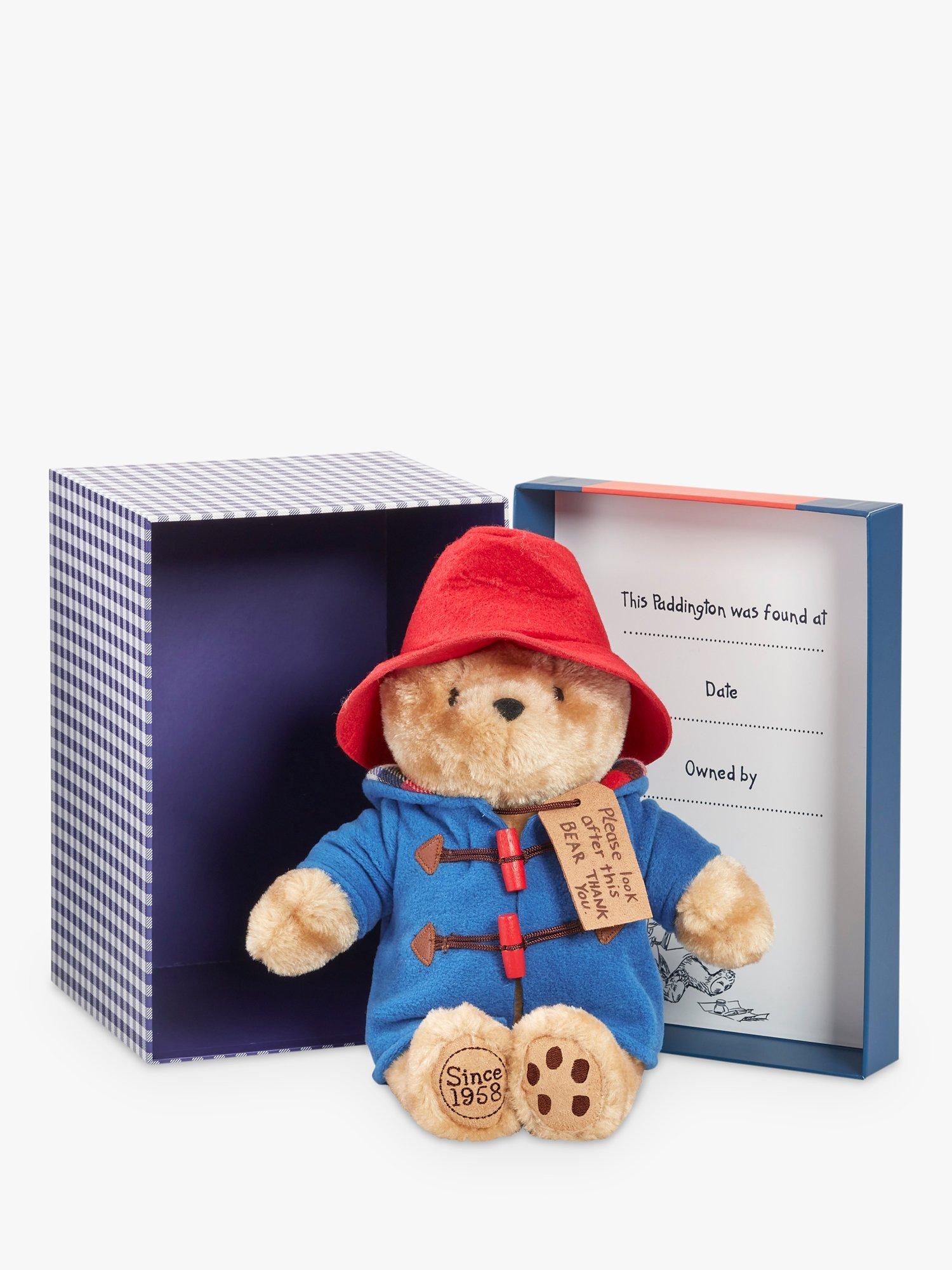 The Classic Paddington in Collectors Box the perfect combination of a soft toy and collectable character in one - and he'd love you to take him home! This super soft and cuddly Paddington sports his signature red hat and blue duffle coat with real toggles, as well as a suedette 'Please look after this bear. Thank you' tag around his neck. Just as at home in the playroom as he is displayed happily on a shelf, Paddington is presented in a beautifully illustrated box, and makes a wonderful gift for fans of all ages