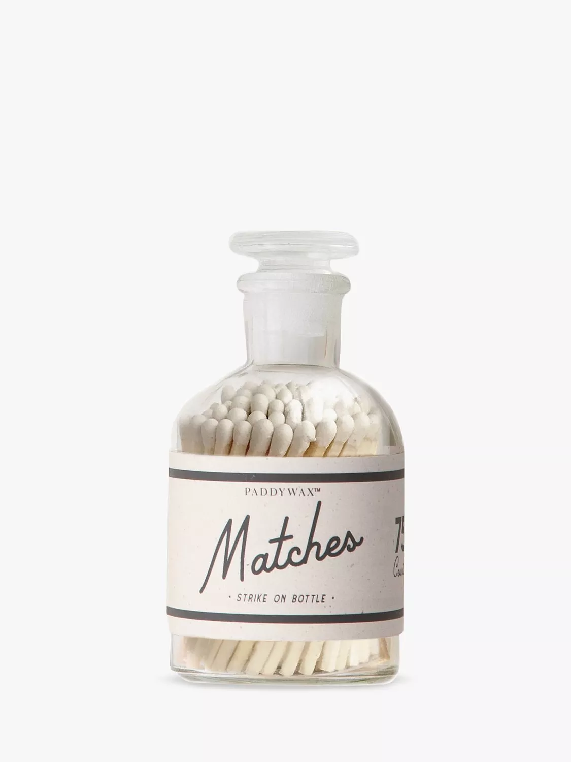 Now you don't have to get off the couch to get that ugly lighter from the drawer. This luxe glass bottle is full of 75 wooden matches with white tips. And on the back of this aesthetically pleasing bottle is a strike strip where you can light your match!