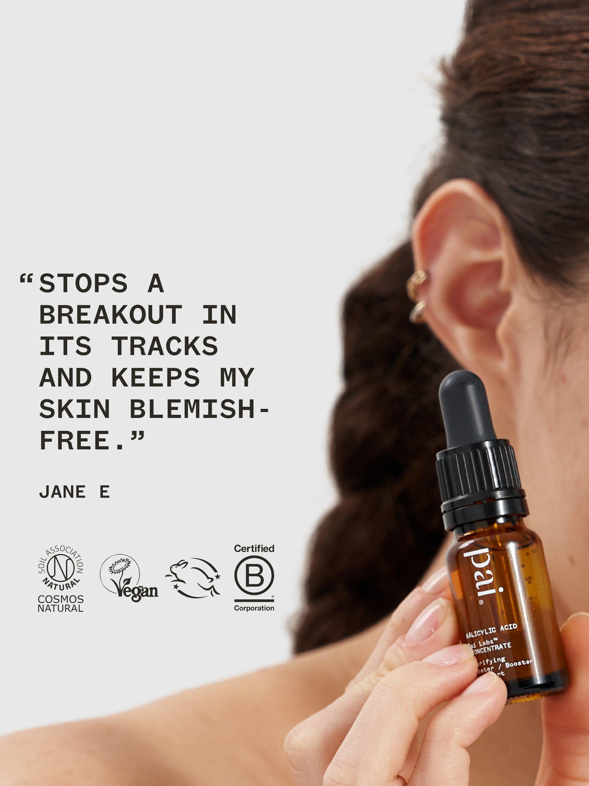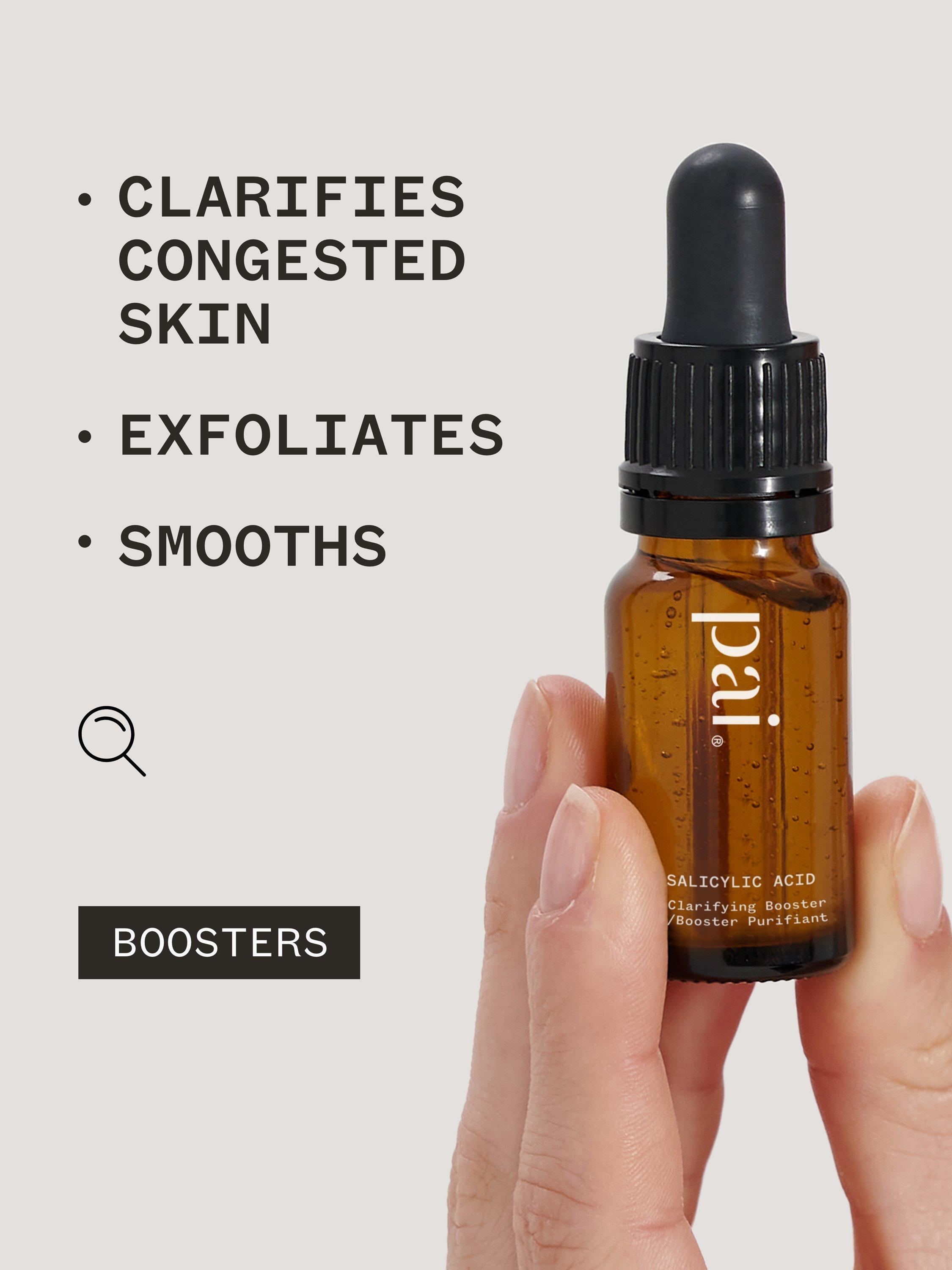 Think breakouts, think beta hydroxy acid (BHA). Salicylic Acid is hailed as a hero for blemish-prone skin – but it’s not without its challenges. It’s often drying, meaning sensitive types are left with even blotchier skin than when they started. So we’ve made it the Pai way. This all-natural booster not only puts you in control of the dosage, but it’s been designed so even the most delicate skin can tolerate it.