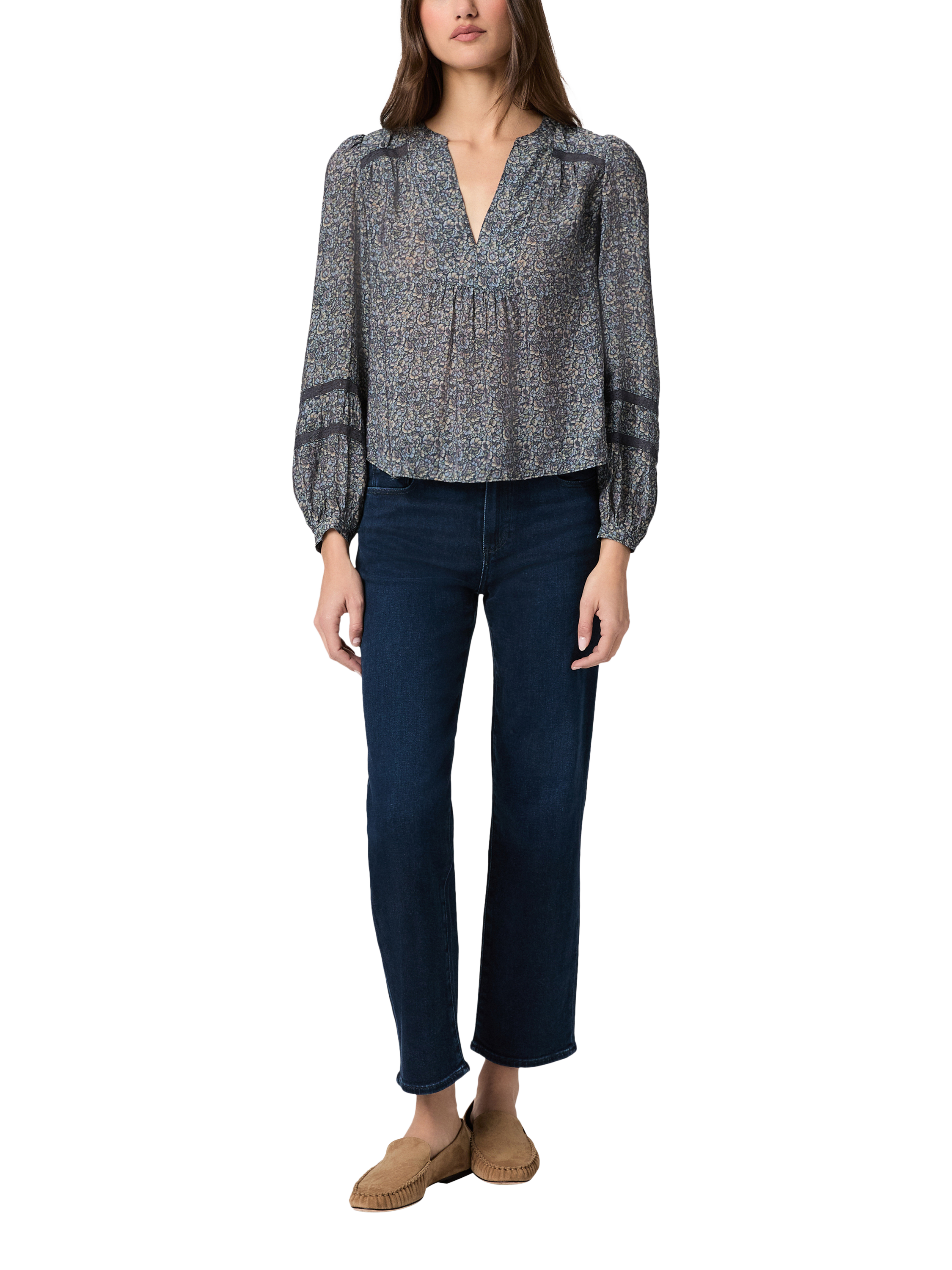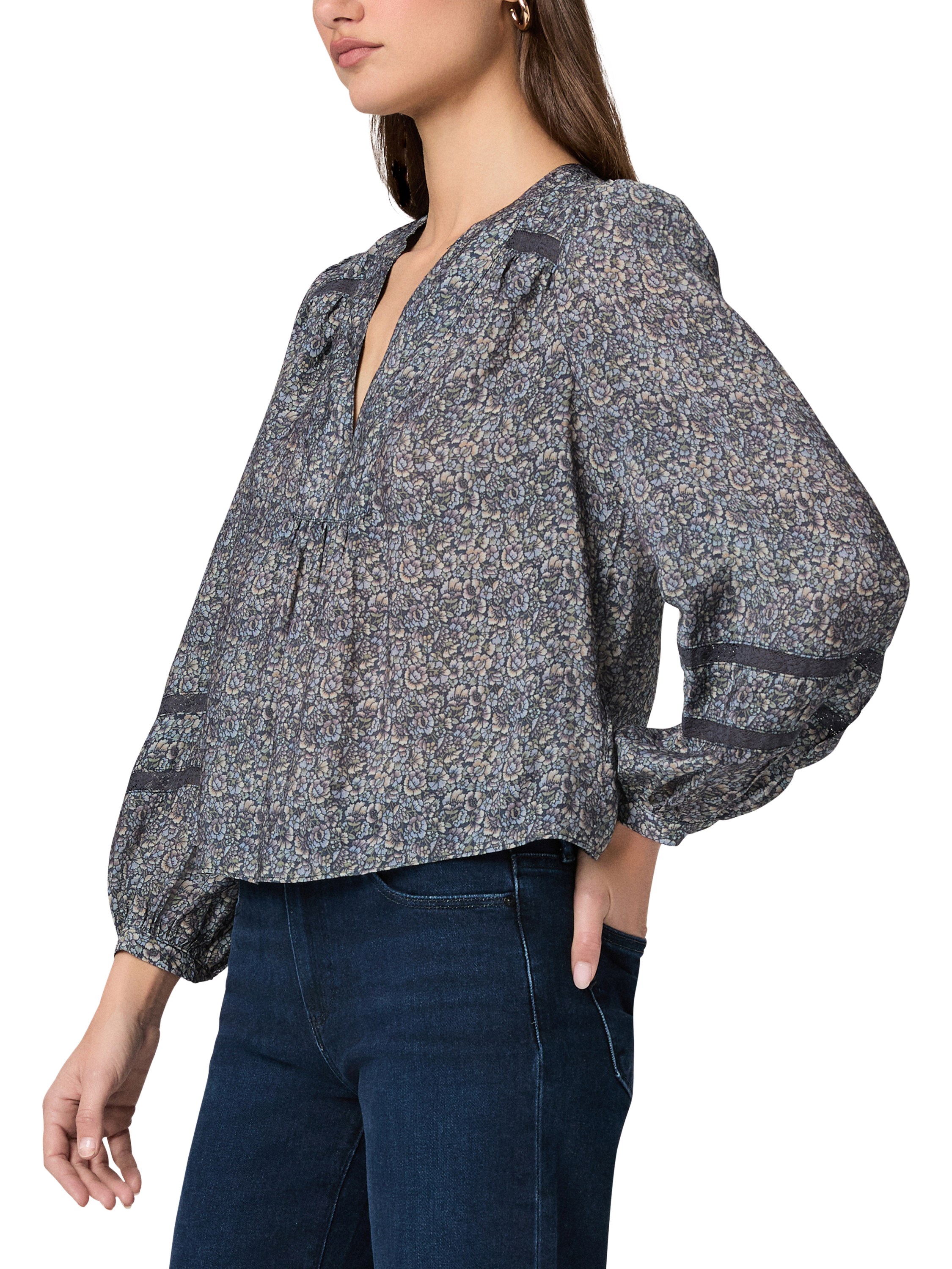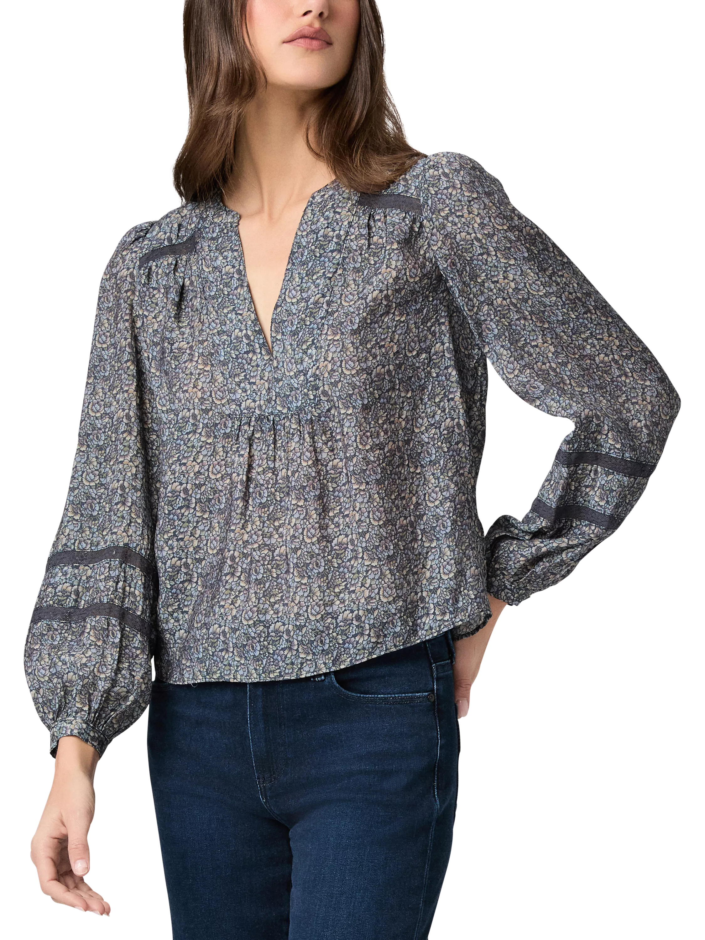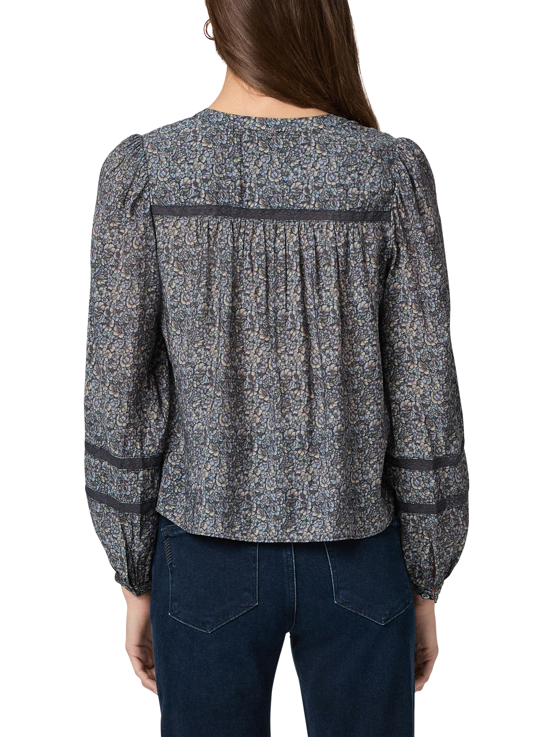 Crafted from a soft rayon-nylon blend in a field flowers print, this long-sleeve blouse is elevated with delicate lace trim at the front and back yoke, as well as along the sleeves, bringing a touch of vintage-inspired charm to this feminine silhouette.