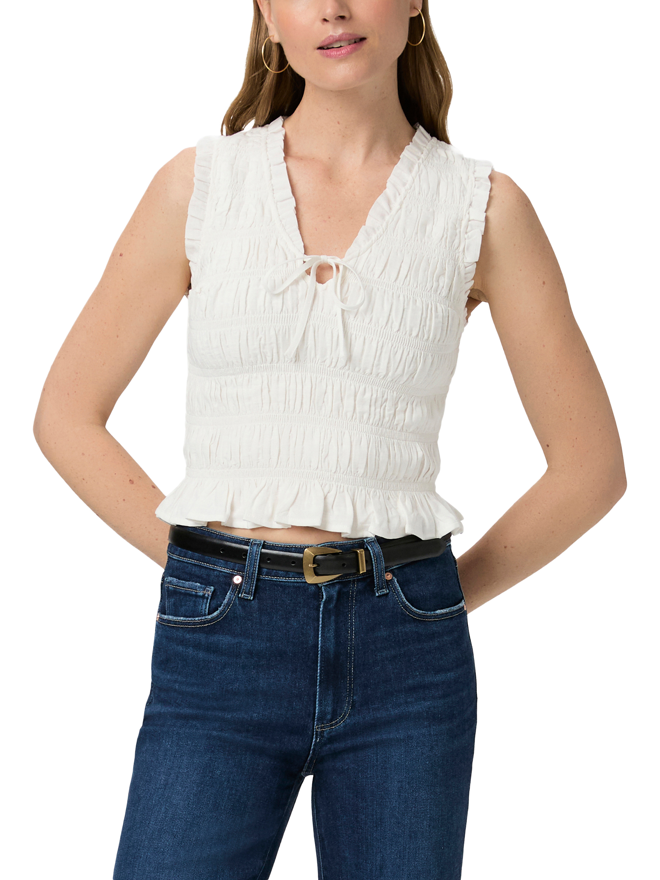Crafted from a soft and lightweight cotton/rayon blend, this sleeveless smocked top features a fitted silhouette with a flattering V-neckline, a tie front and ruffle details throughout. Pair the Devi Top with any shade of denim in your wardrobe.