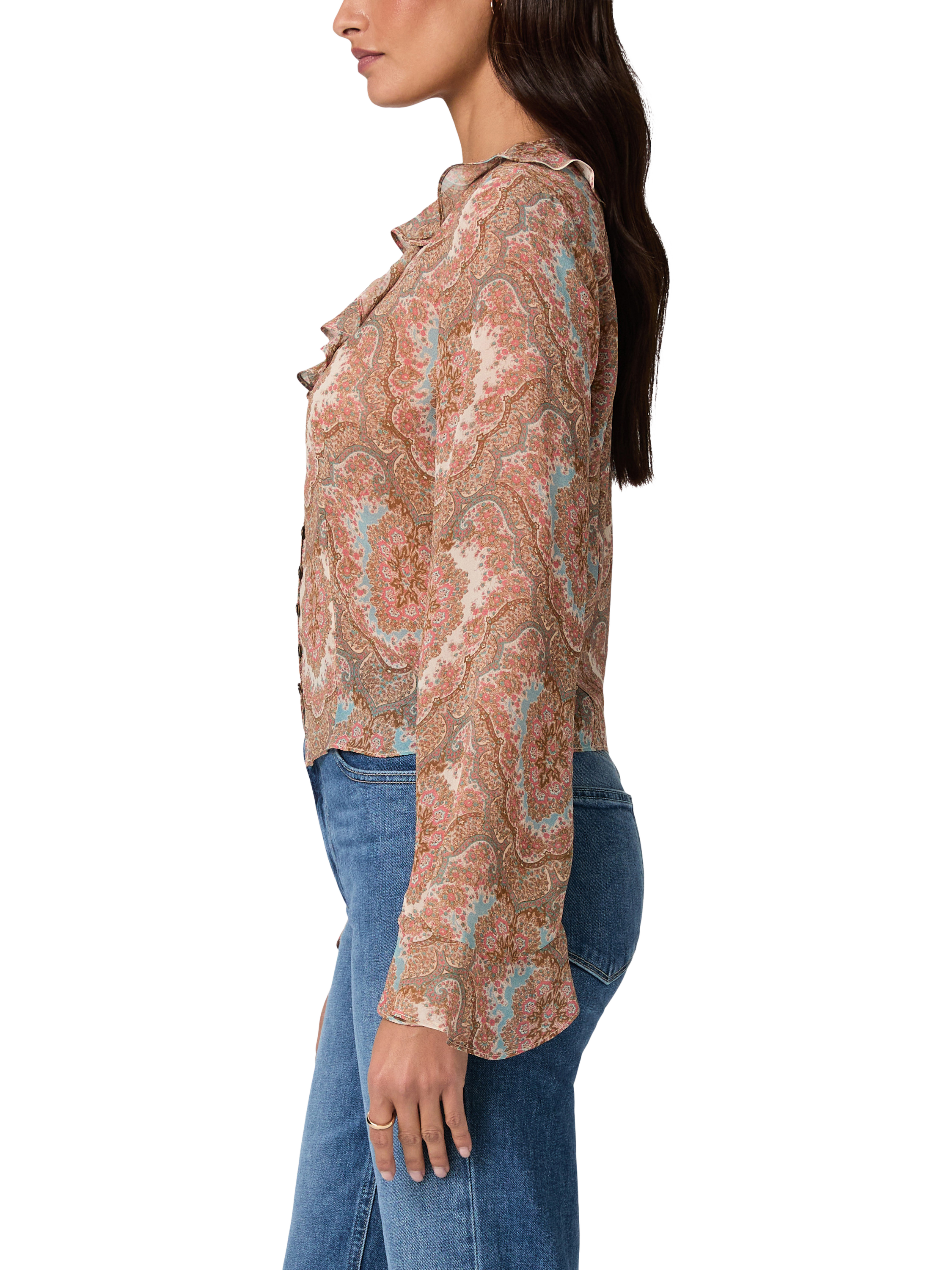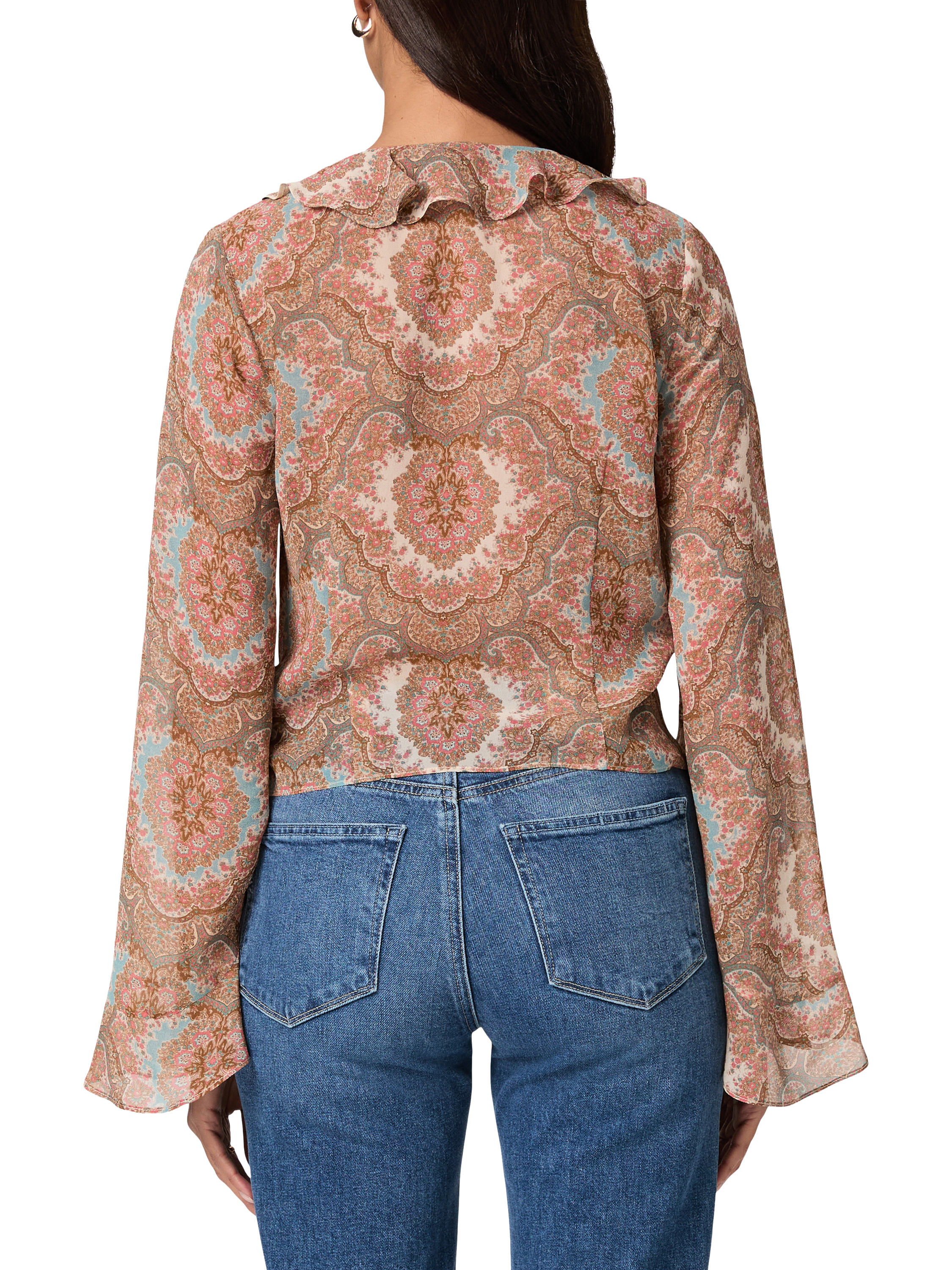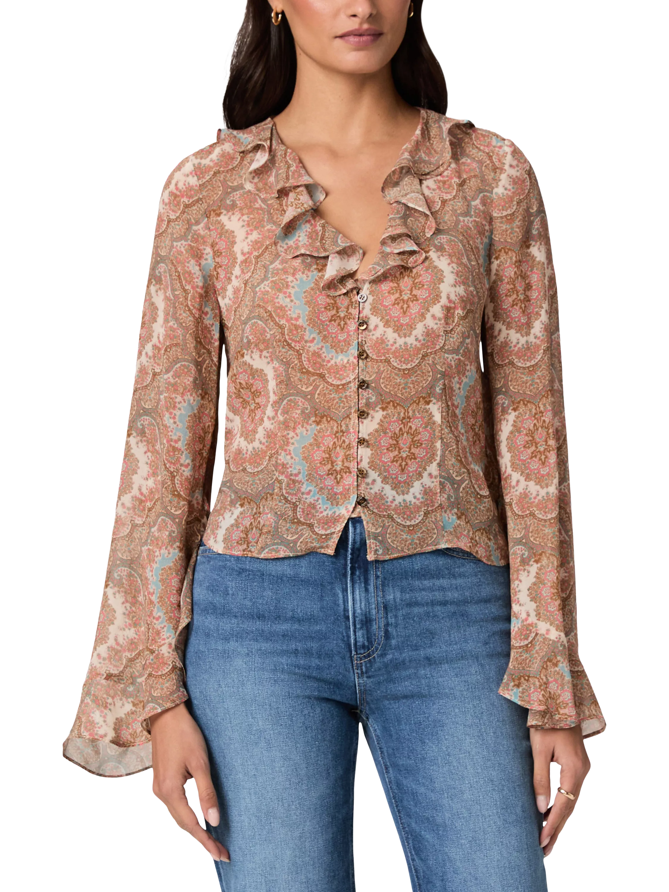 This romantic, bohemian-inspired top is crafted from 100% silk flat georgette in a neutral medallion print. The Eve Blouse features ‘70s-inspired asymmetrical flare sleeves, a slim body, button-front closure, and a V-neckline accented with a delicate ruffle trim for a soft, feminine touch.