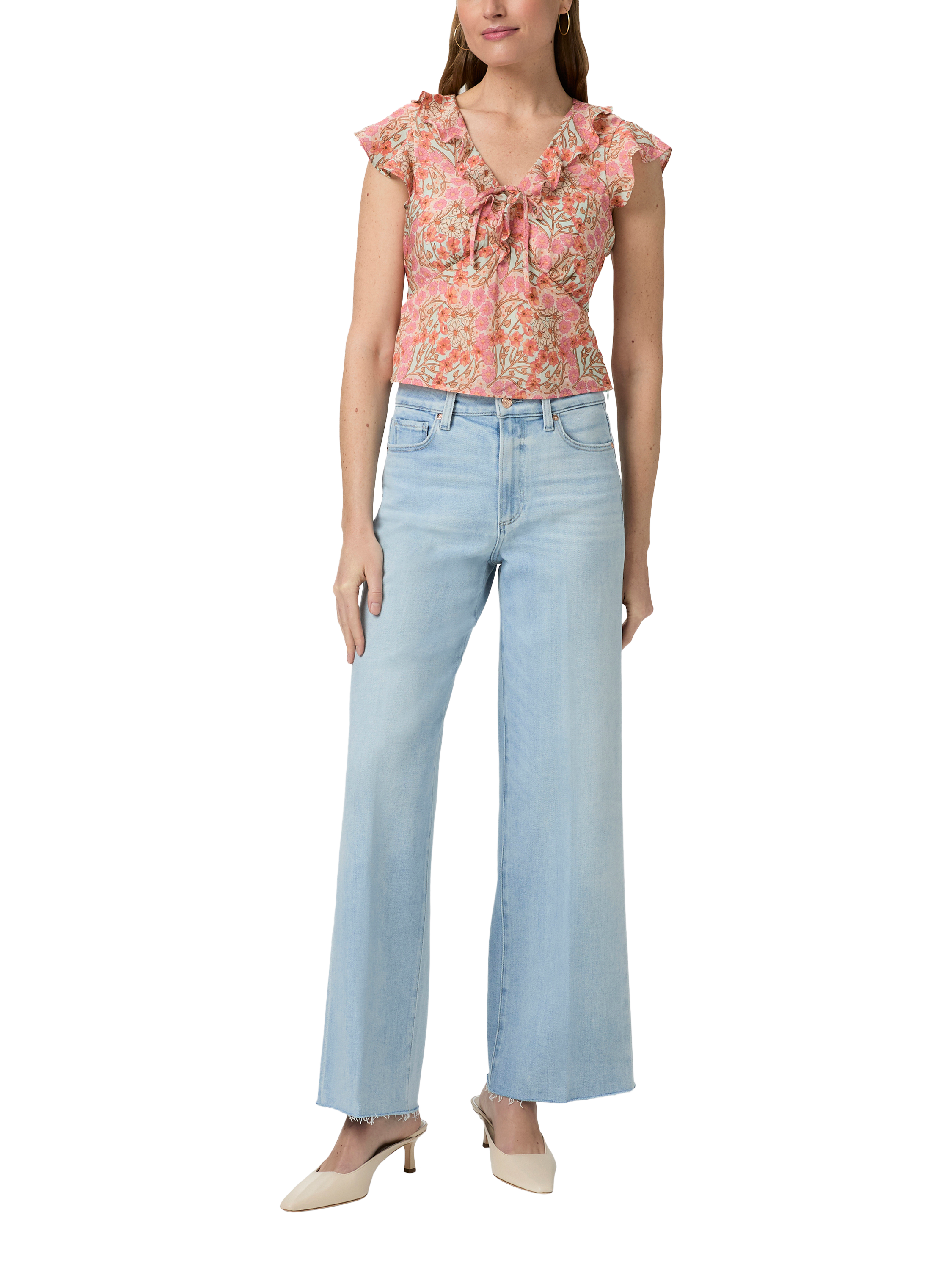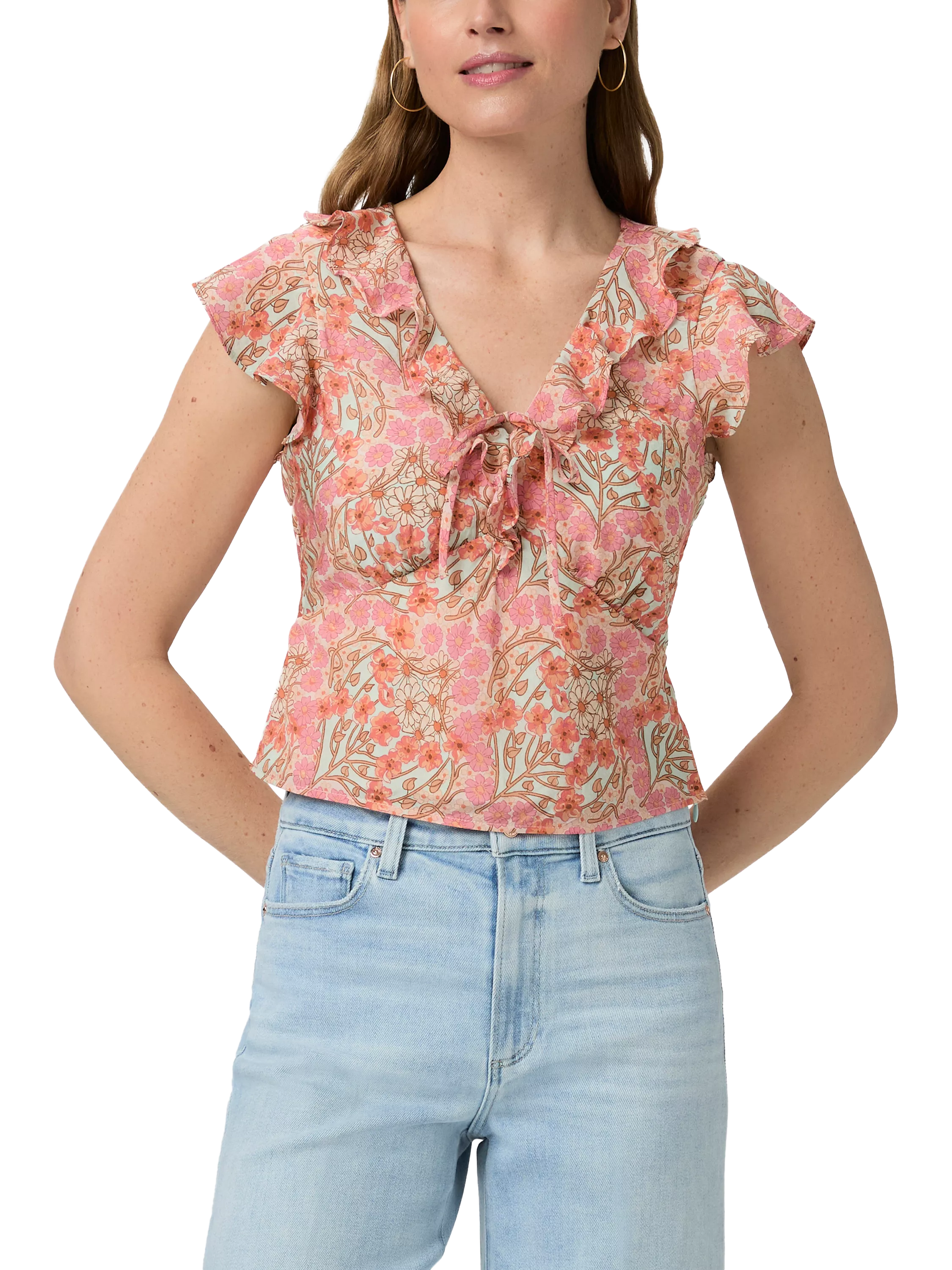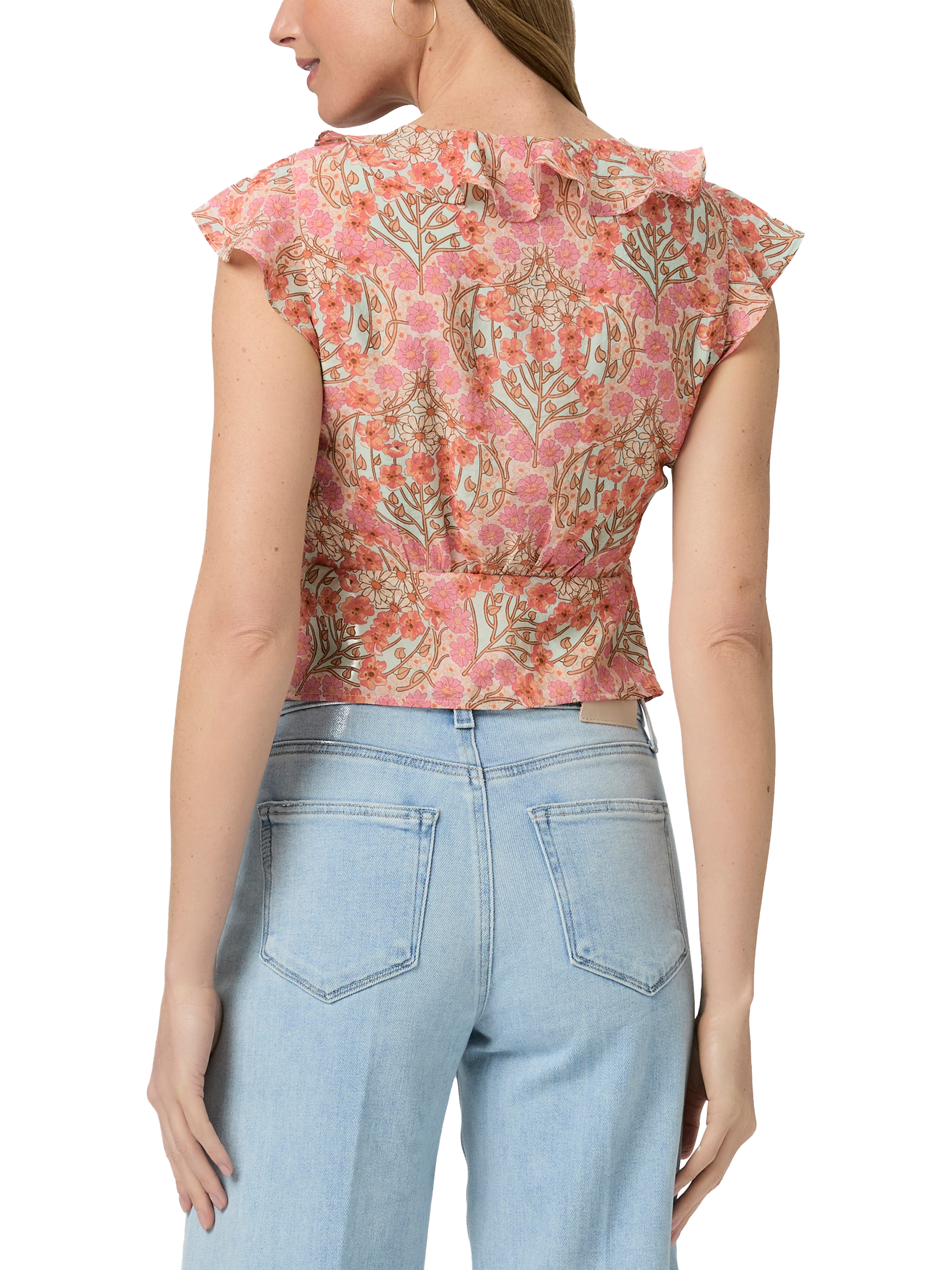 Crafted from a light and airy textured rayon material, this 70s-inspired short sleeve floral blouse is designed with ruffles at the sleeves and v-neckline and a cropped fit that pairs perfectly with high-waisted denim.