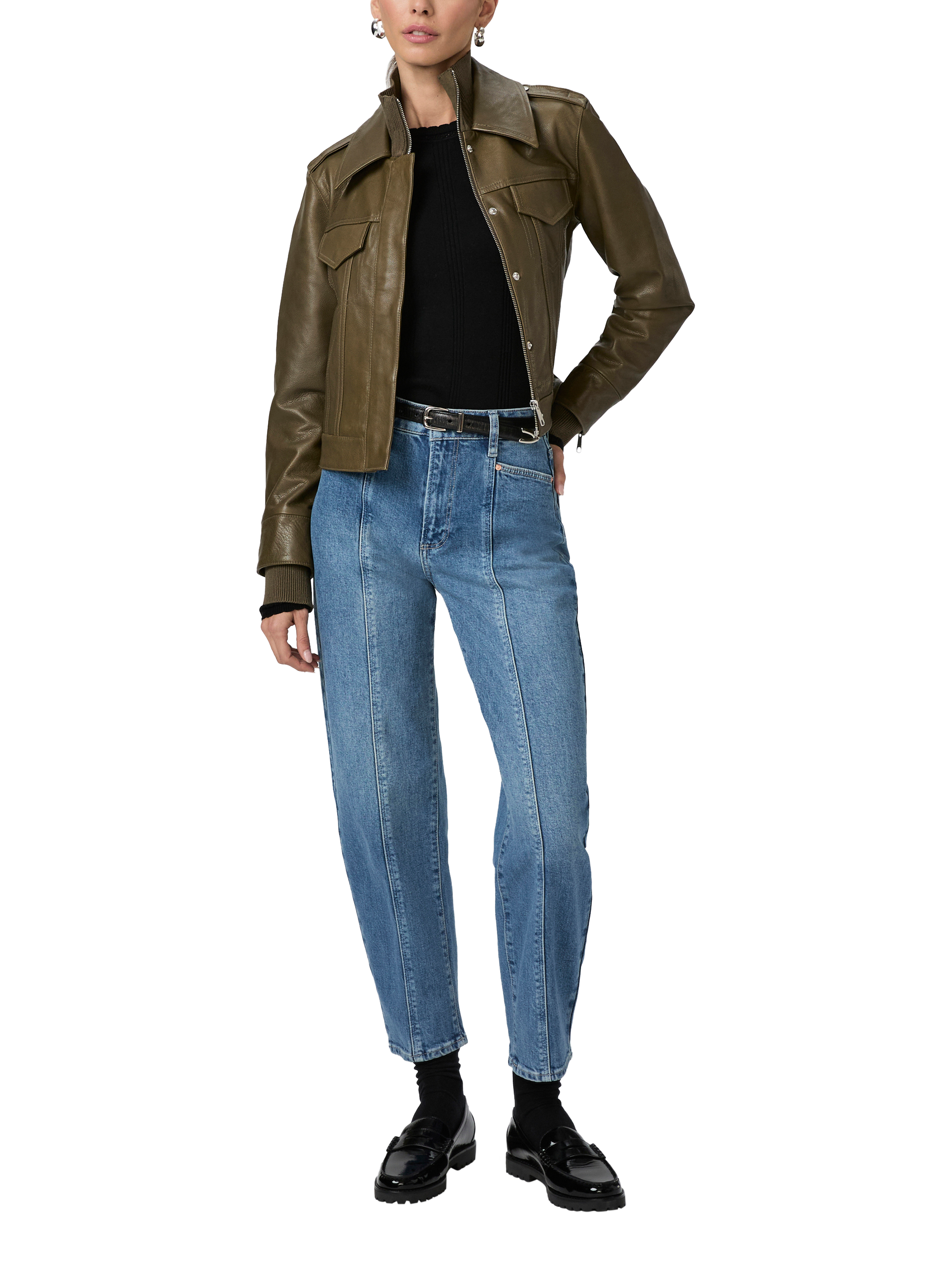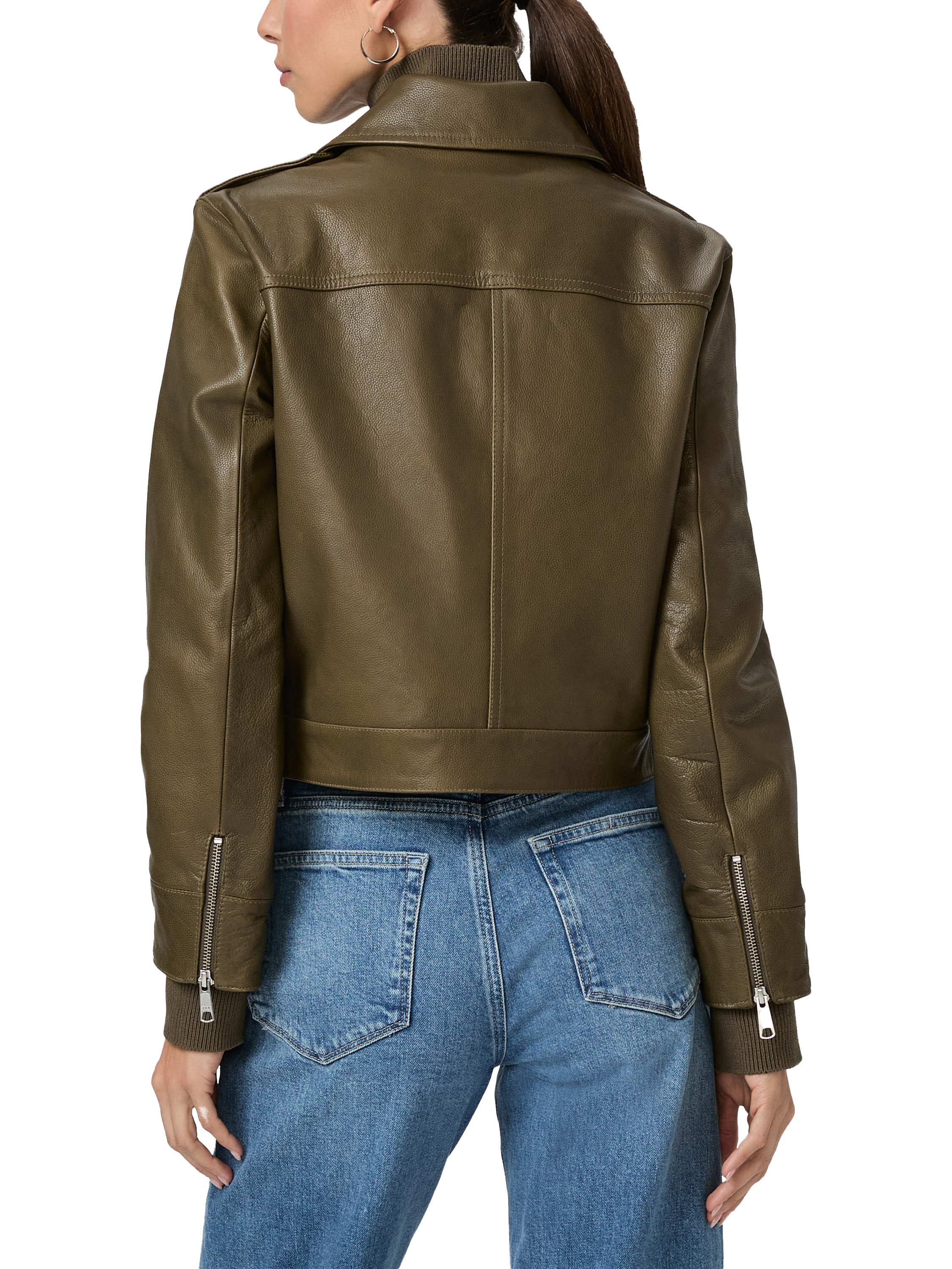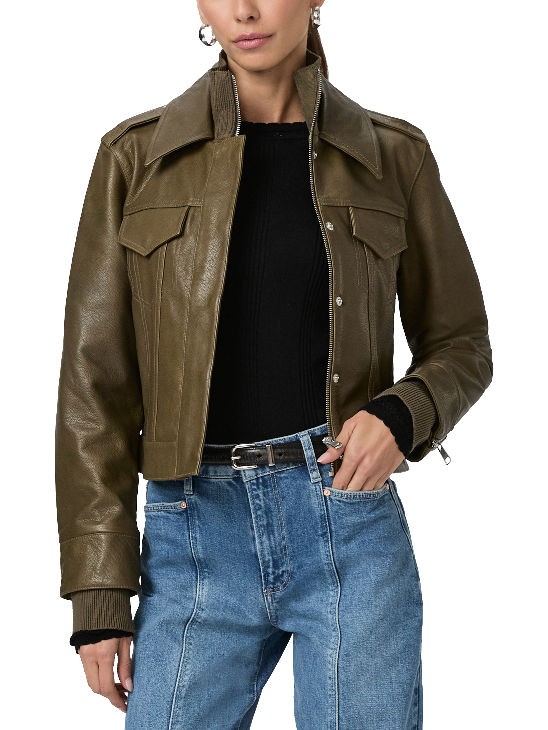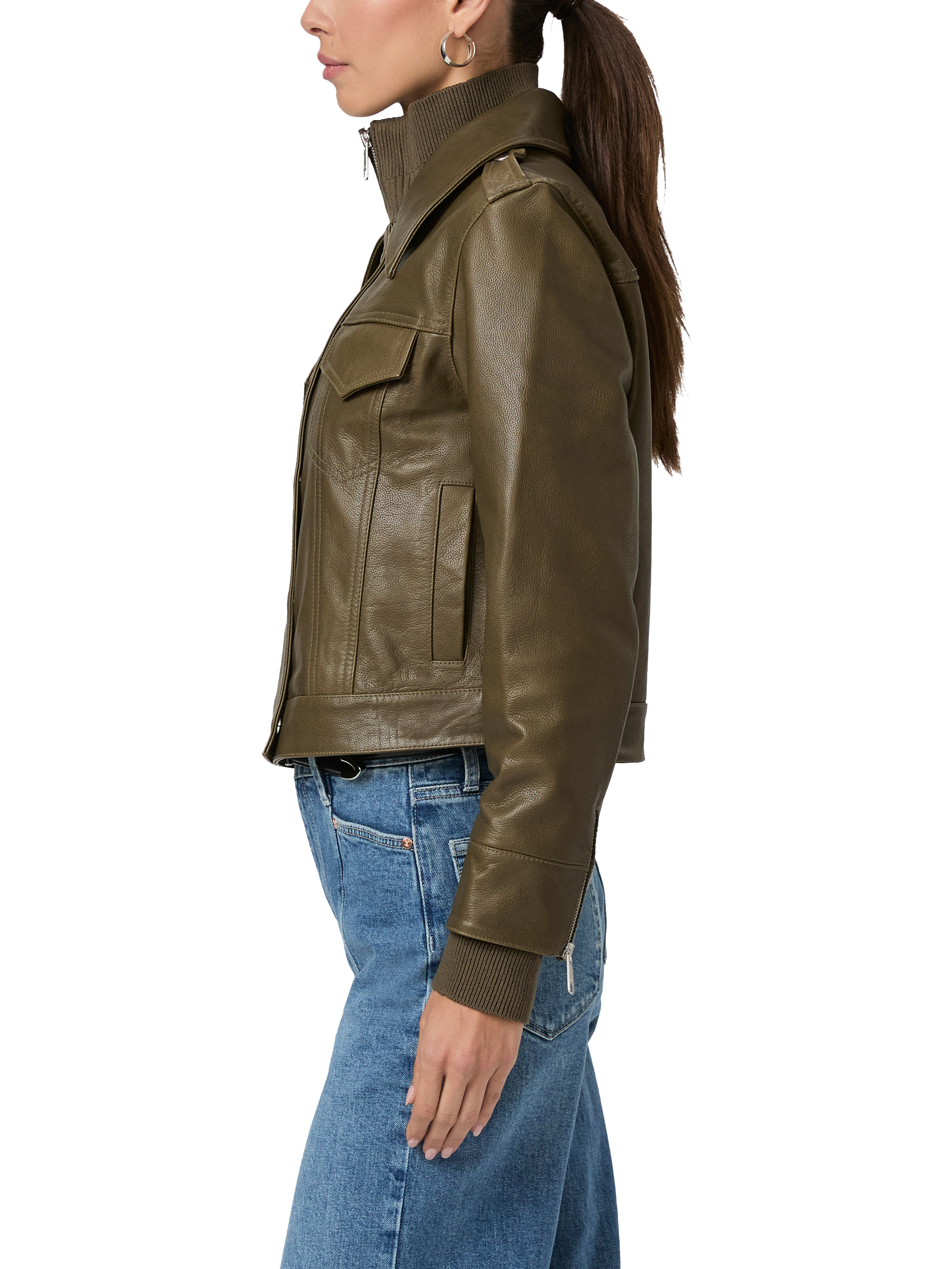 A richly textured genuine leather elevates this casual cropped bomber jacket. The Molina Jacket features a double stand ribbed collar, double chest pockets, ribbed cuffs, and a dual closure with a centre front zipper and snap buttons.