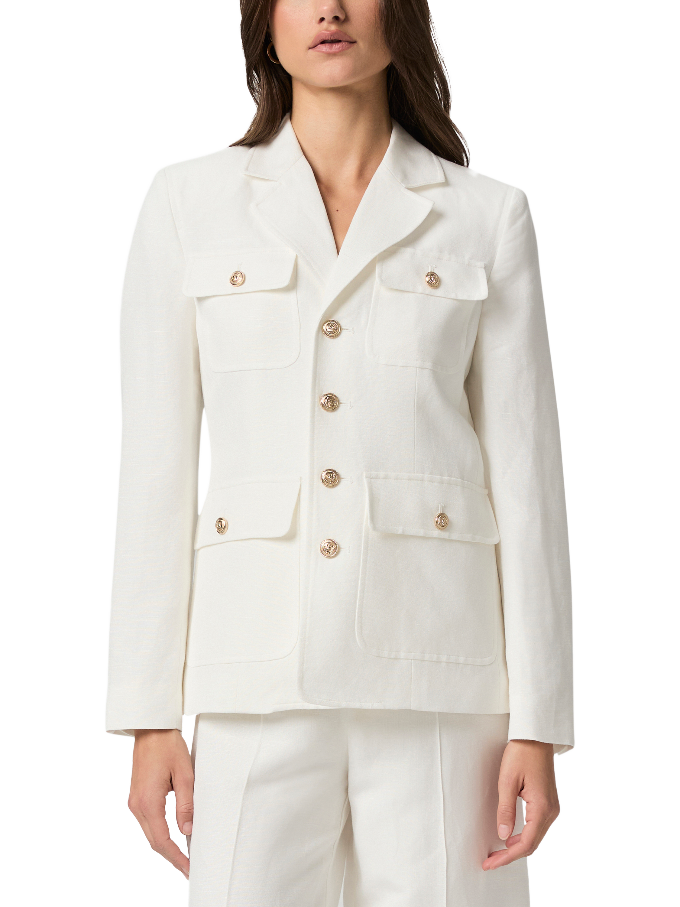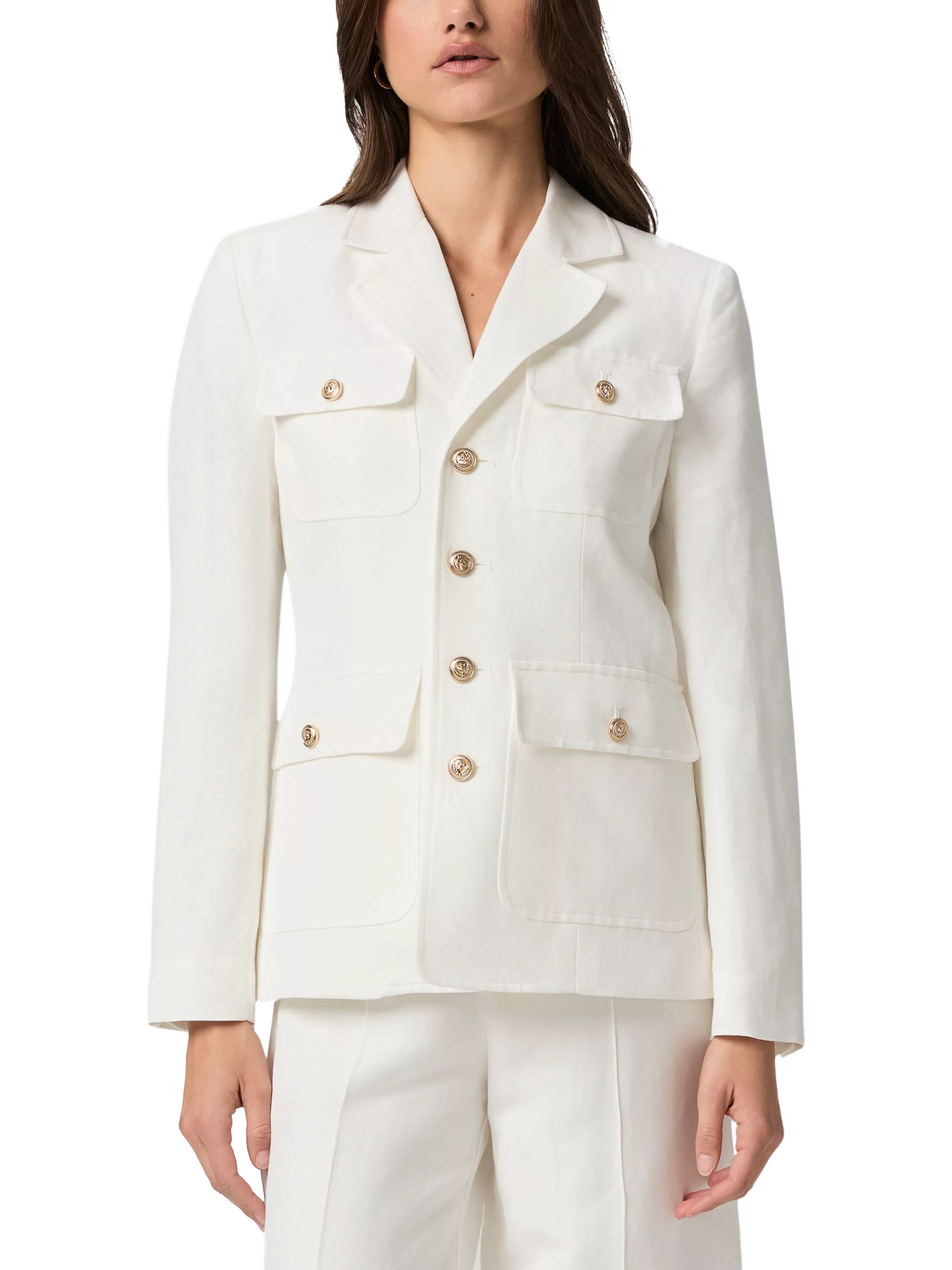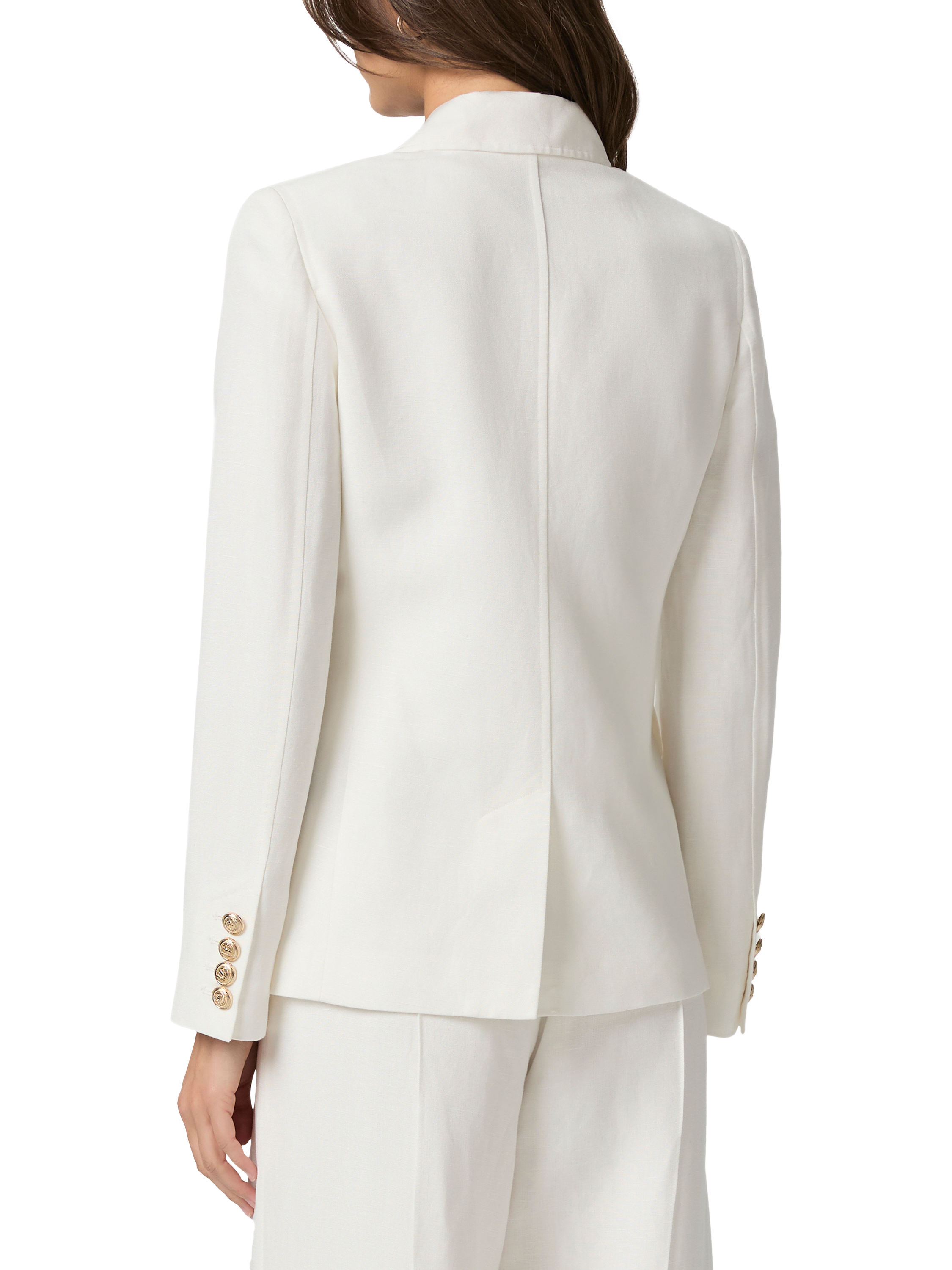 Crafted from PAIGE's linen blend suiting fabric, this elevated white blazer is designed with a straight body, notch collar, patch pockets and soft gold novelty button details.