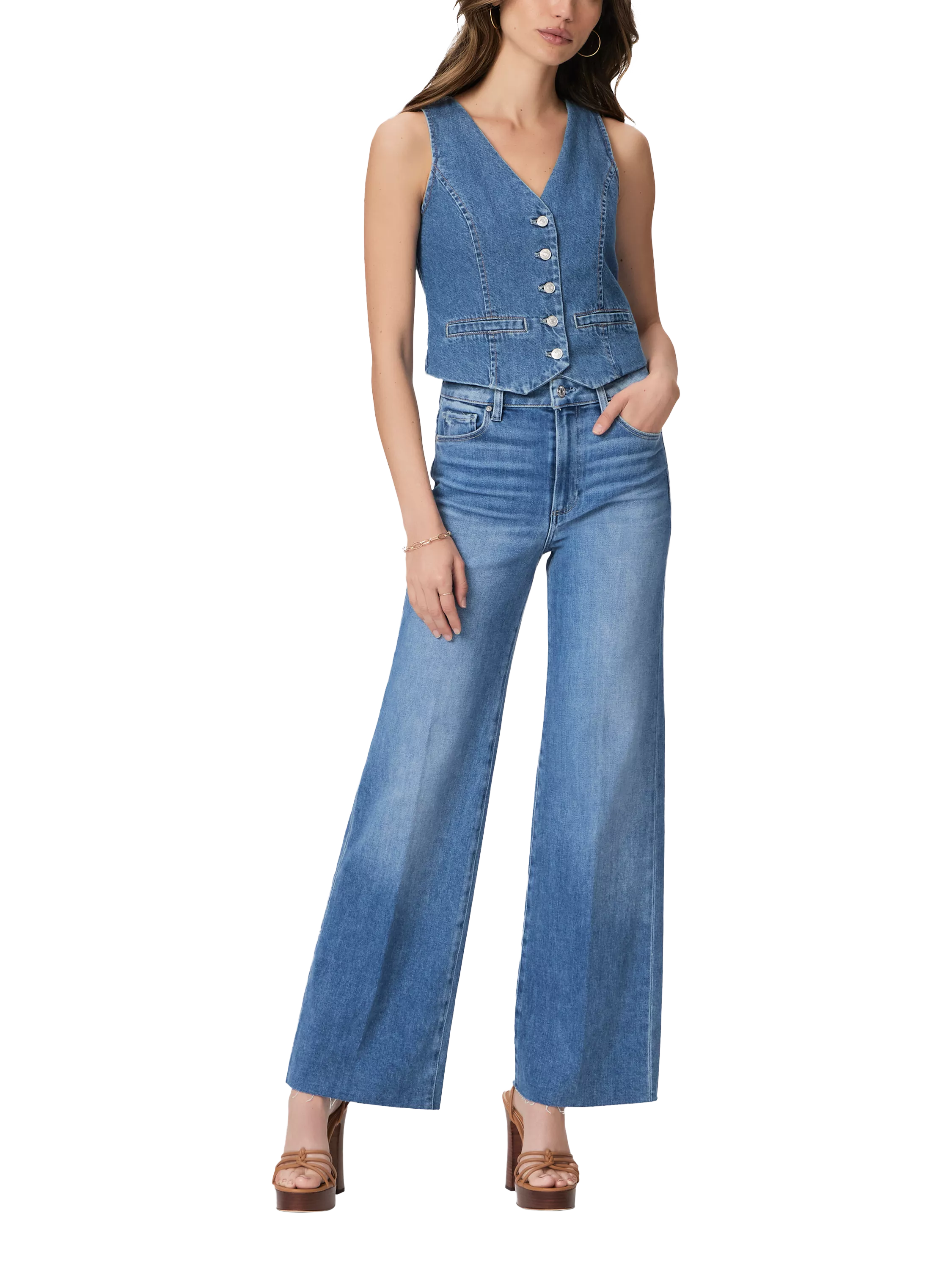 This ultra high-waisted wide leg has an easy, relaxed fit with a raw hem and a 31-inch inseam. This pair is cut from PAIGE VINTAGE denim in an authentic blue wash with natural fading and classic lived-in details.