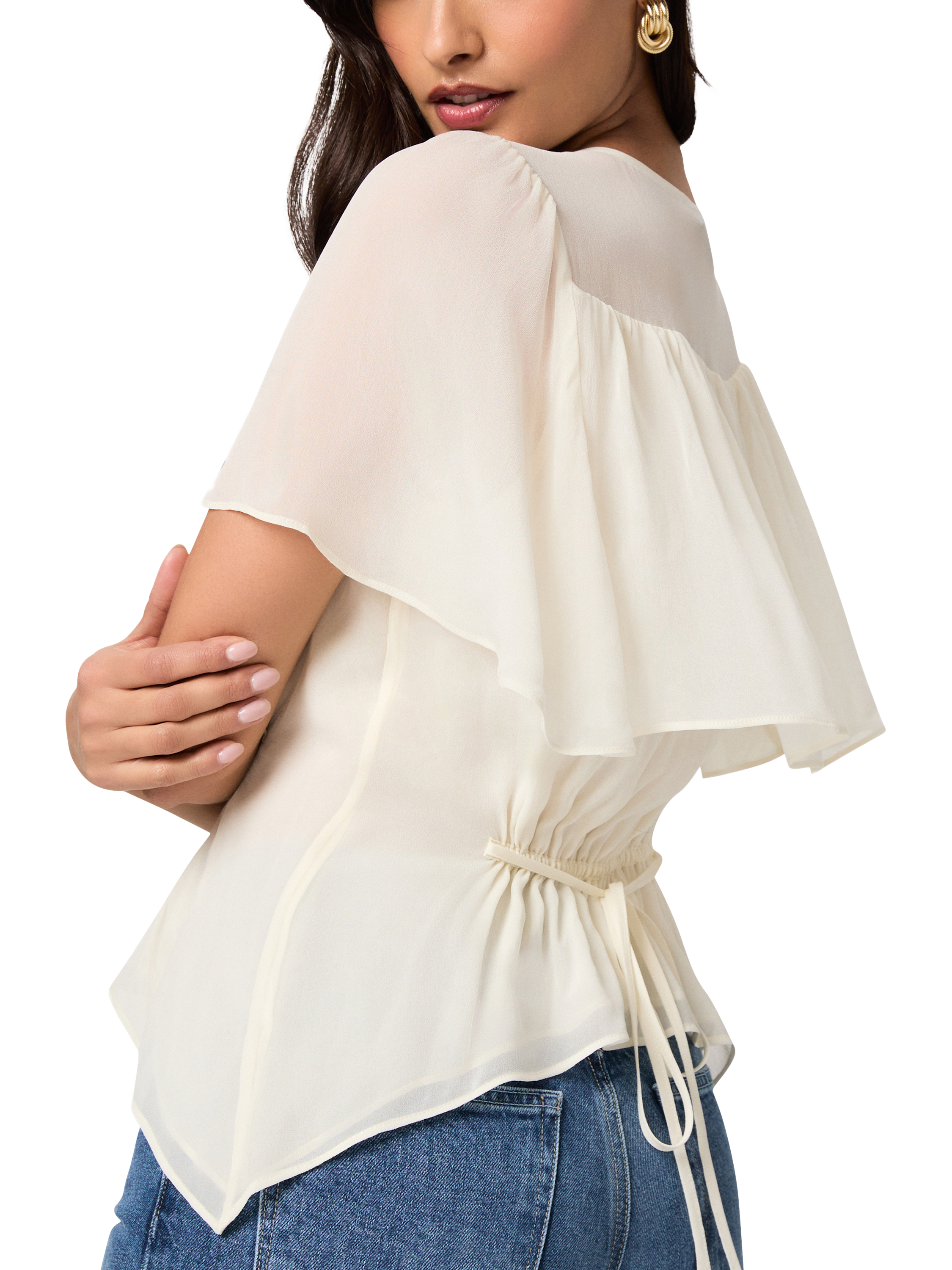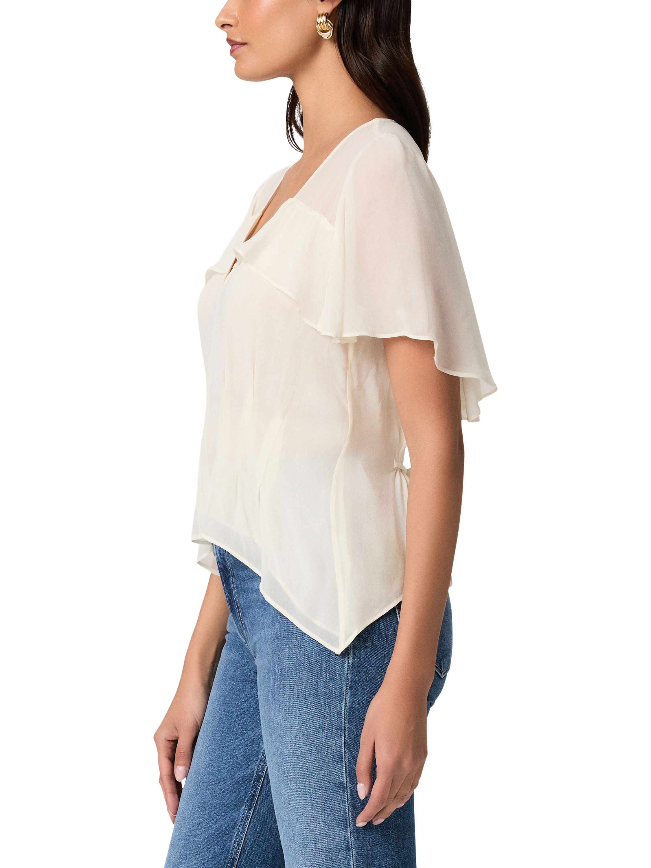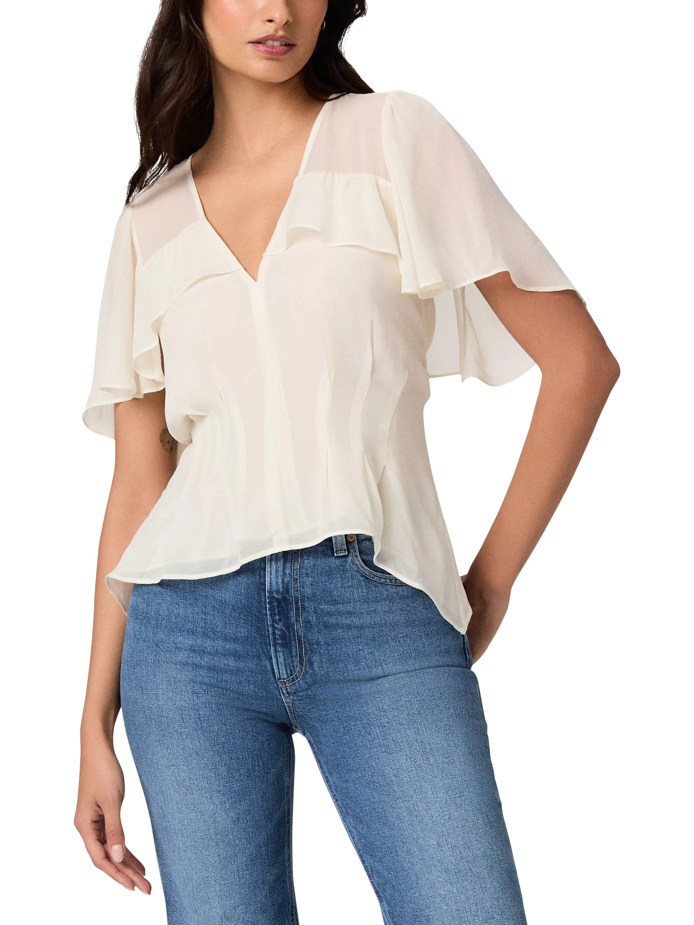 The Willa Blouse is PAIGE's take on the cape trend, crafted from 100% solid viscose georgette. This V-neck, short-sleeve blouse features angled cascading ruffles at the front yoke that continue at the back, creating a cape-like effect.