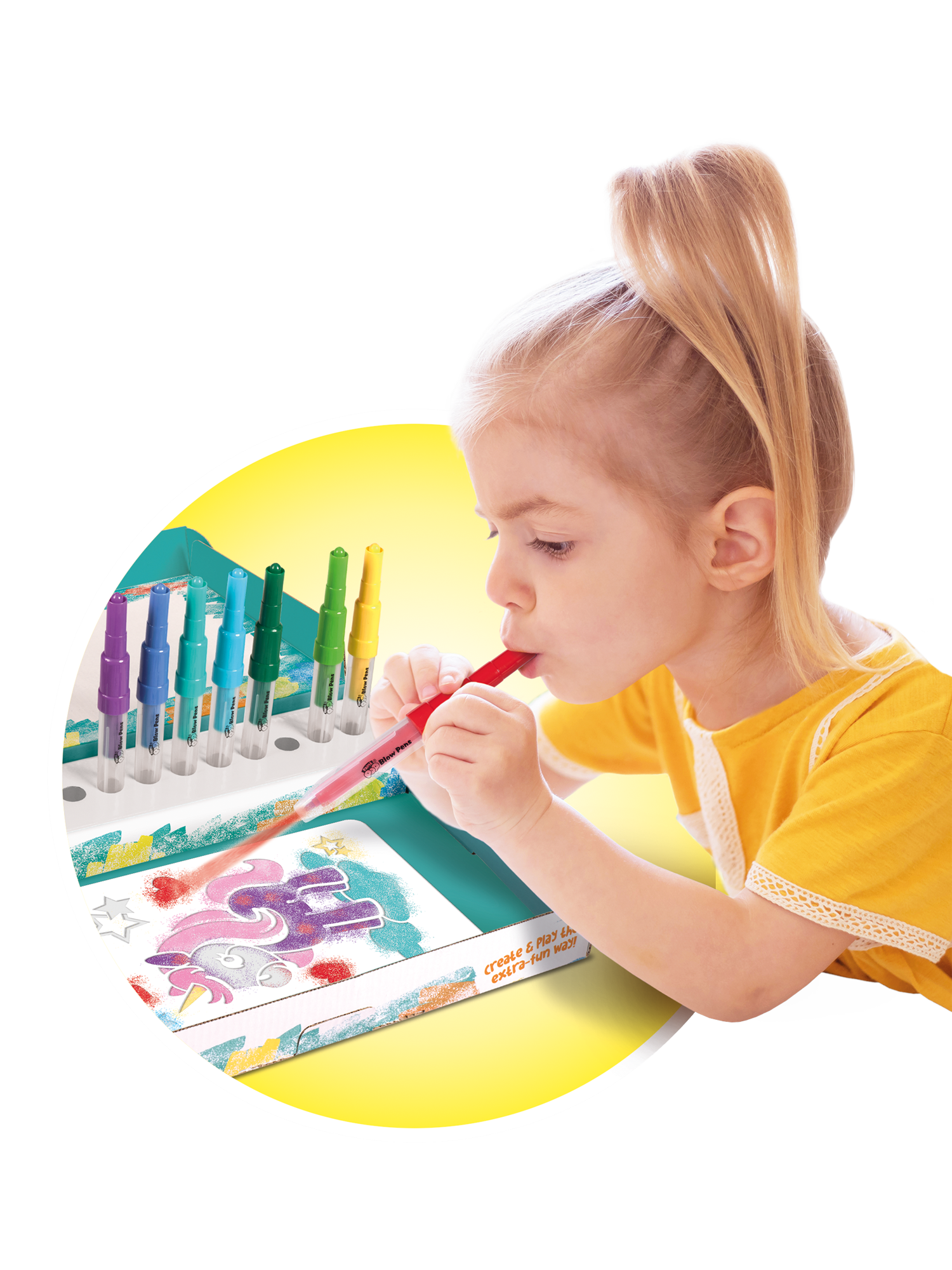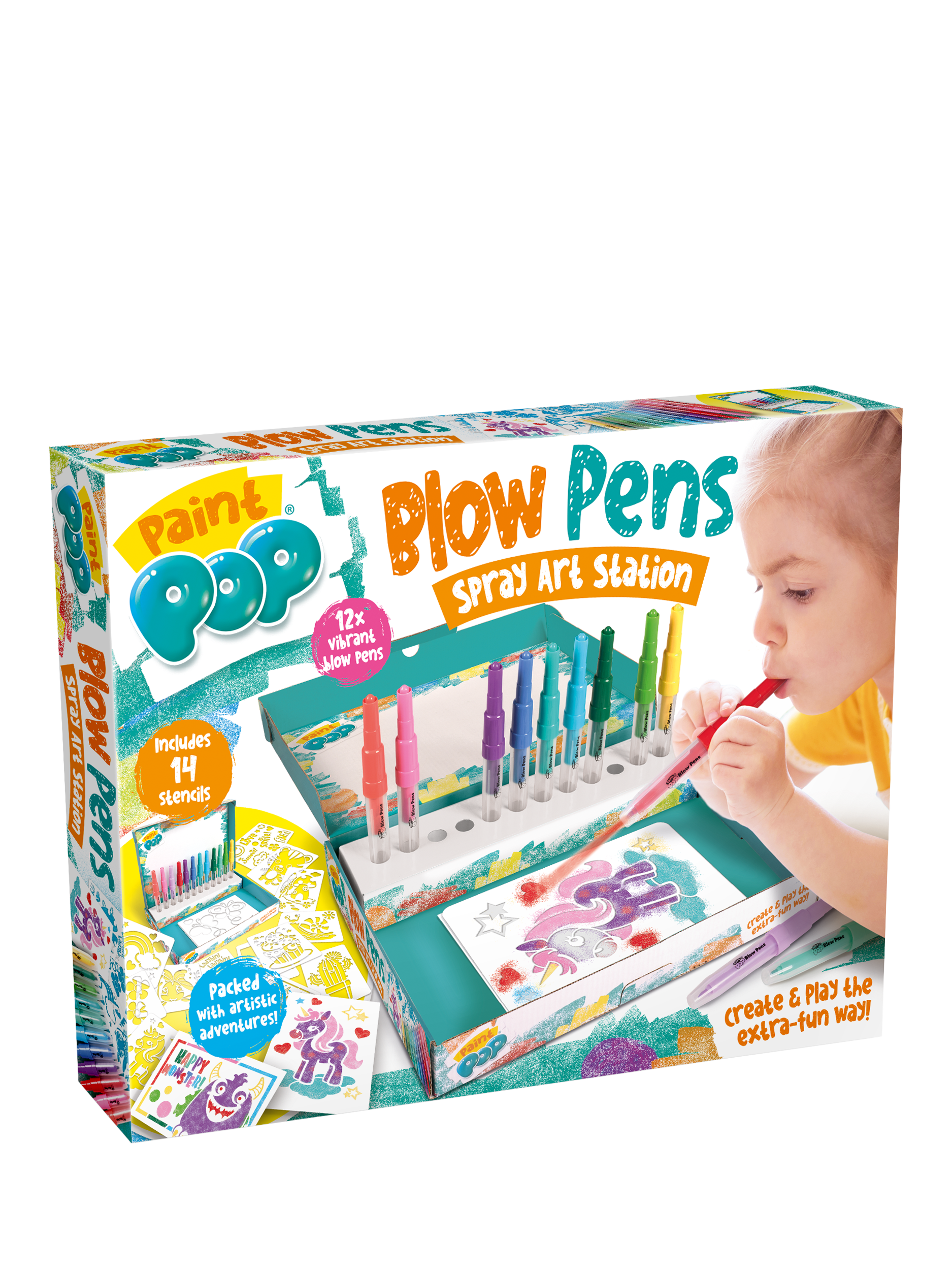 Unlock your creativity by transforming ordinary paper into stunning works of art! With just a simple pen and a fine mist of vibrant paint colours, you can experience the thrill of creating something truly unique and beautiful. Dive into this exciting activity and let your imagination soar. Includes 12 pens, 14 stencils, plain paper and pen holder.