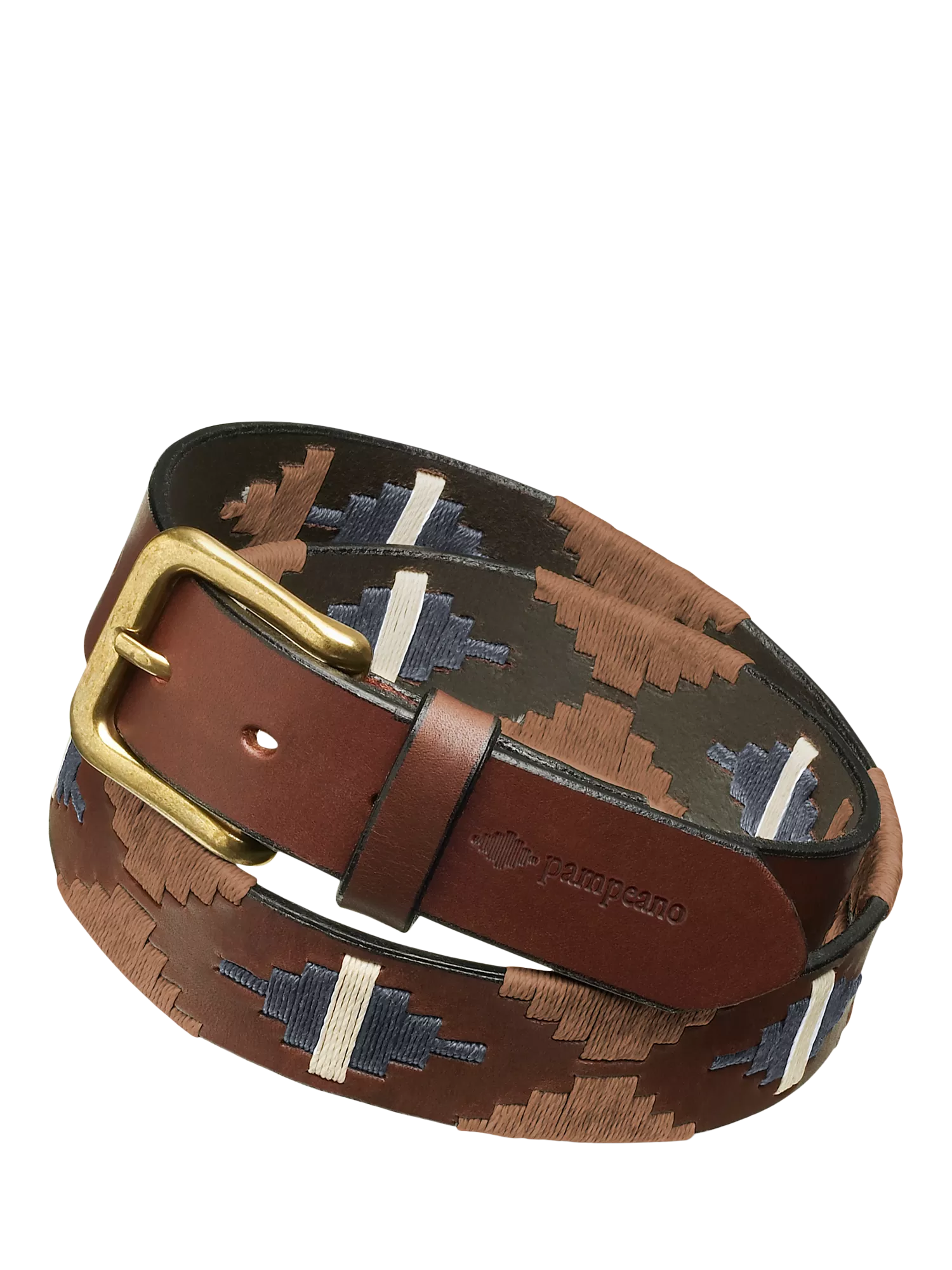 Complete the look with the premium leather Pampeano Patron belt. This intricately patterned brown, navy and white belt is perfect for those with an eye for detail, and those who are looking for more than a standard leather belt.
