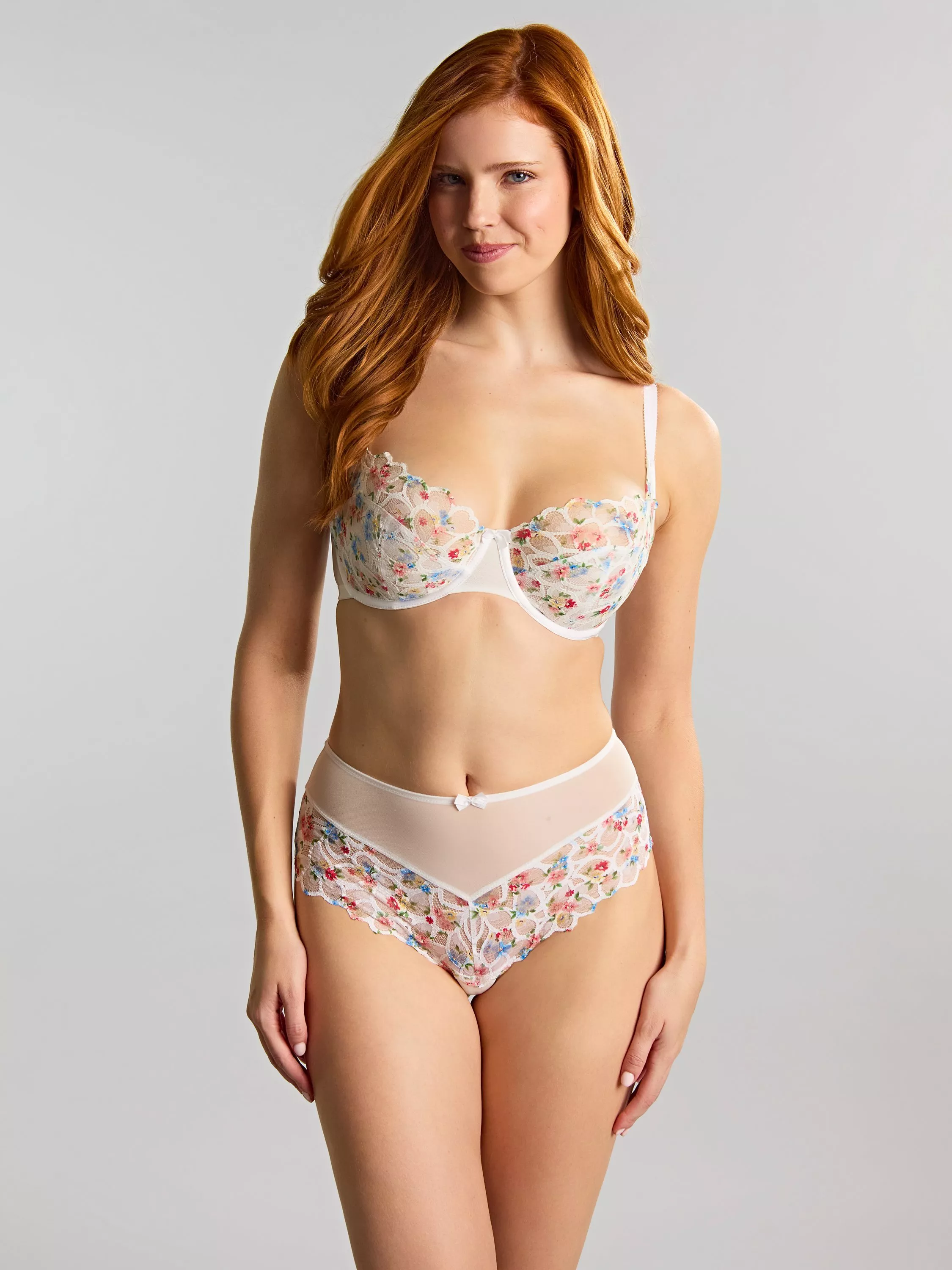 For those who love a little everyday luxe without full coverage, the Allure Demi Balcony is the perfect choice. This more minimal style beautifully frames your curves, offering a lighter, delicate look. Featuring a dramatic, shelf-like neckline that enhances your cleavage and contemporary lace with a vibrant floral print — a fresh take on springtime elegance. Made with stretch lace cups that move with your body, flexing effortlessly to enhance and support your unique shape.
