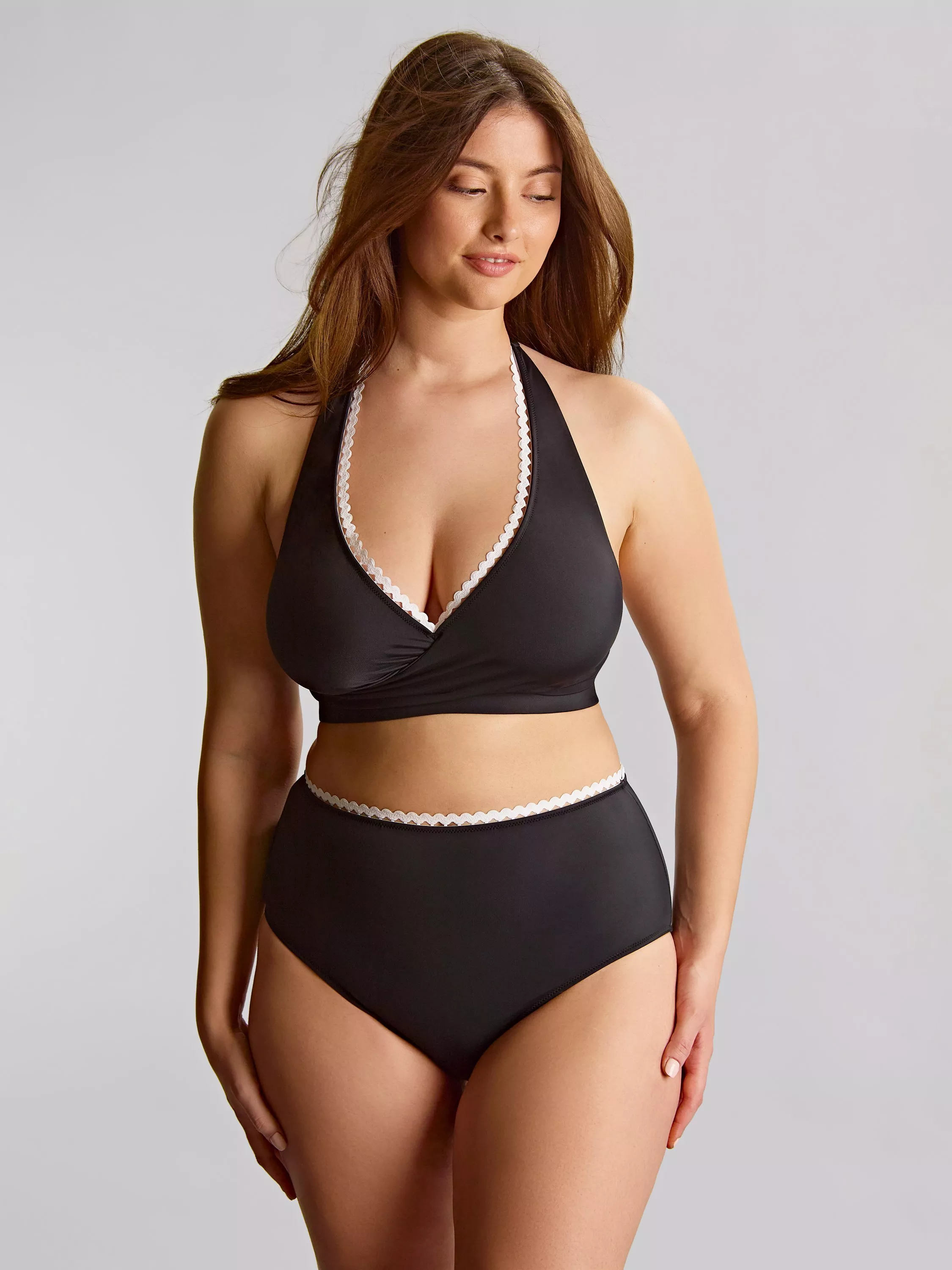 Sofia is designed for those who want support without the wires. With a firm underband providing reassuring support, this twist-front halter-neck bikini is finished with a playful 'ric rac' trim for a joyful monochrome pop of contrast. Whether you’re lounging or taking a dip, Sofia combines comfort and style effortlessly.