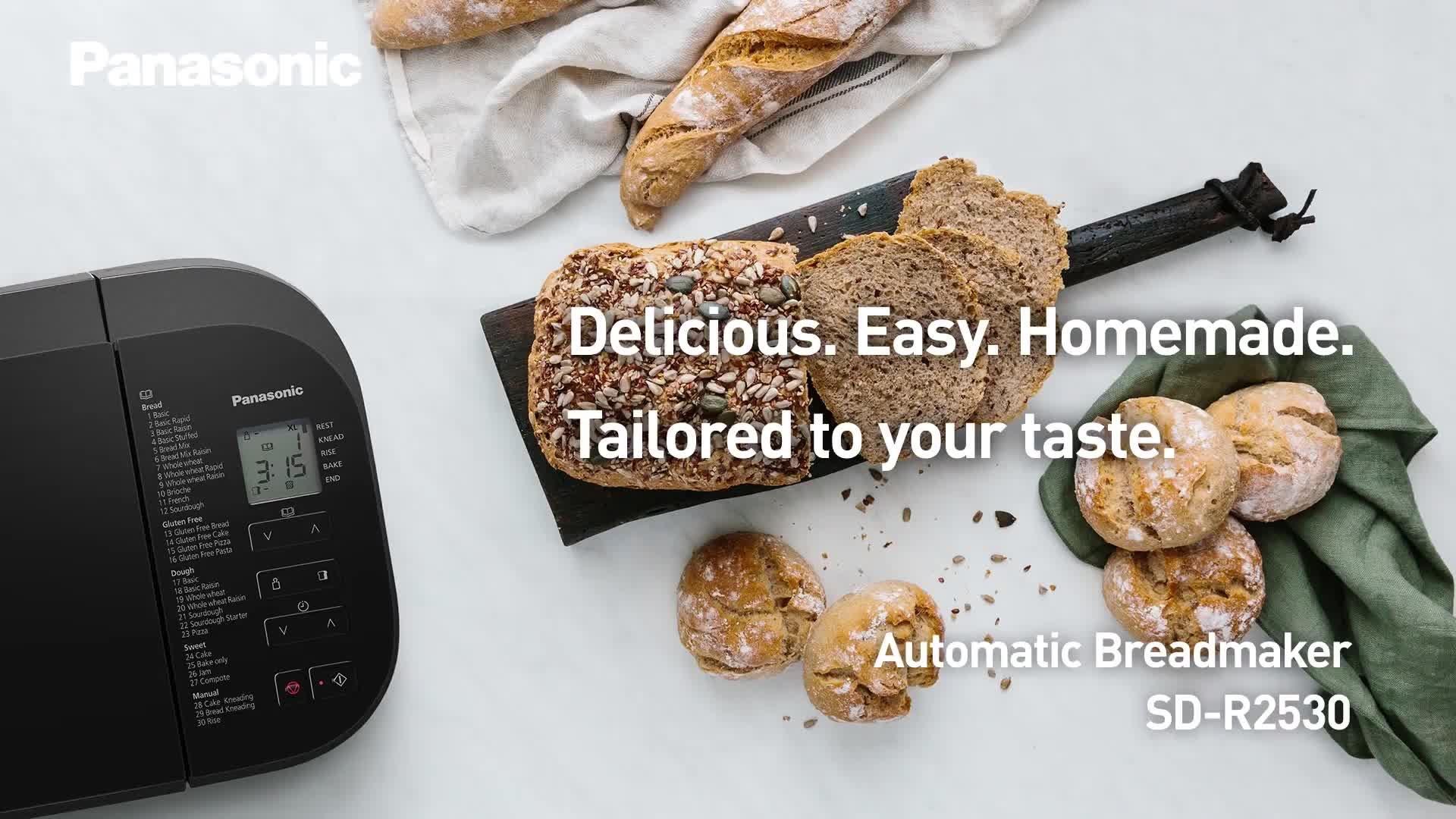 Introducing the NEW SD-R2530KXC automatic breadmaker with a new sleek horizontal design that houses two new features that allow for creative and hassle-free baking from the comfort of your own home. With the new manual modes, you have the freedom to make your bread and cakes exactly how you like by entering the kneading and rising modes. Love the smell and taste of fresh bread? Struggle for time? Then look no further with the dedicated new Bread mix with Yeast mode, just add water for fresh and delicious bread. Plus, with the Raisin/Nut dispenser you can enjoy the fully convenient baking experience. You can make bread in the simplest and most time saving way. There's no need to worry just leave the breadmaker to dispense ingredients at exactly the right time day or night!