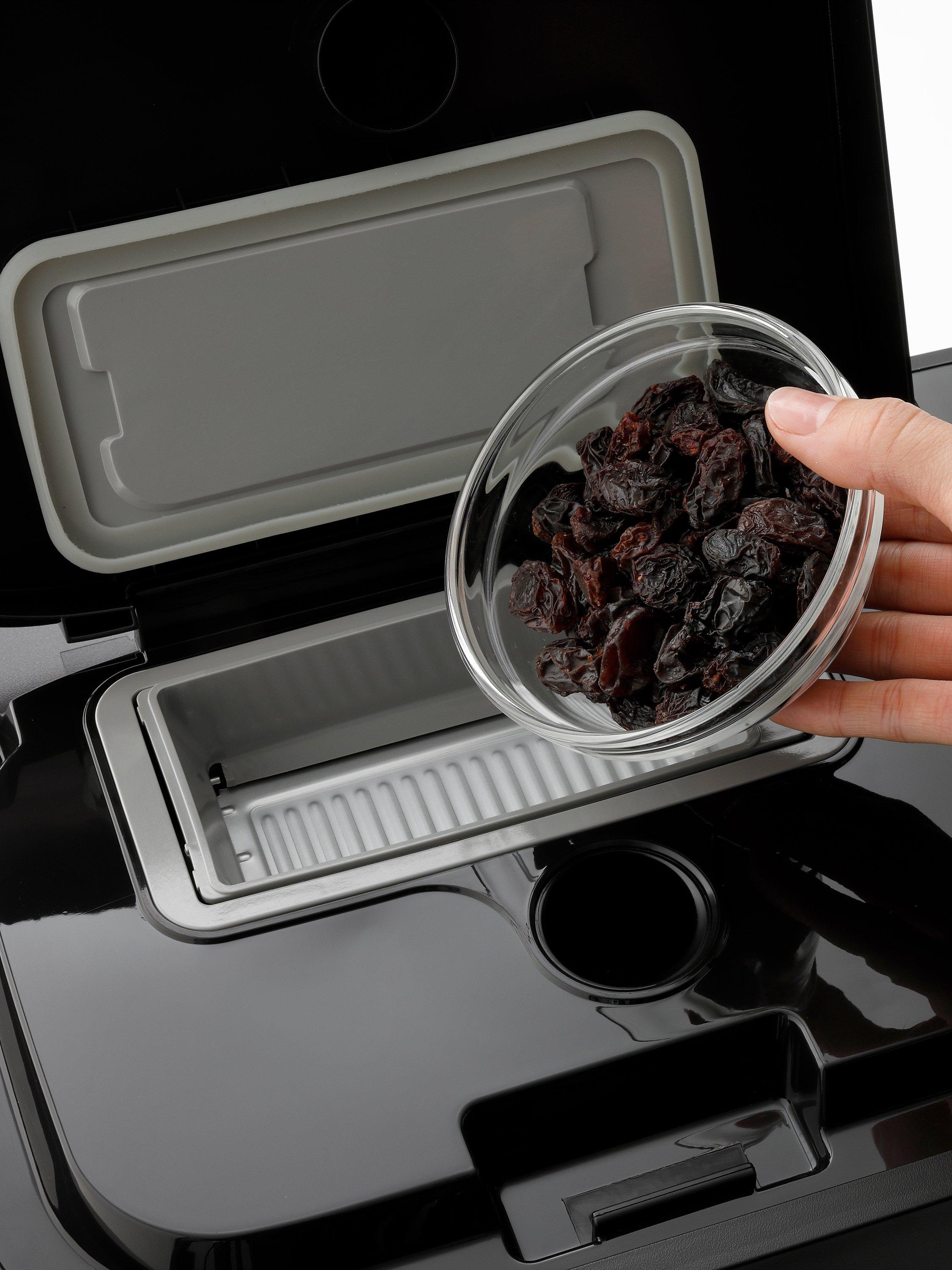 The automatic raisin/nut dispenser mixes additional ingredients such as nuts, seeds, olives, dried fruit, chopped cured meets and more at just the right time to help ensure they are evenly distributed throughout the loaf. They are placed in the tray in the lid and after the mixing stage they are incorporated into the dough at just the optimum time.