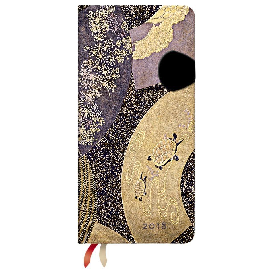 In the Maki-e tradition, lacquerware is created by painting tree sap onto treasured objects and sprinkling them with metallic powder, such as gold, silver or copper, to create luxurious designs. Showcasing foliage and a turtle family, this Paperblanks Ougi 2018 12-Month Diary features the image of an antique 19th-century Japanese lacquer box selected from a private collection in Kyoto.