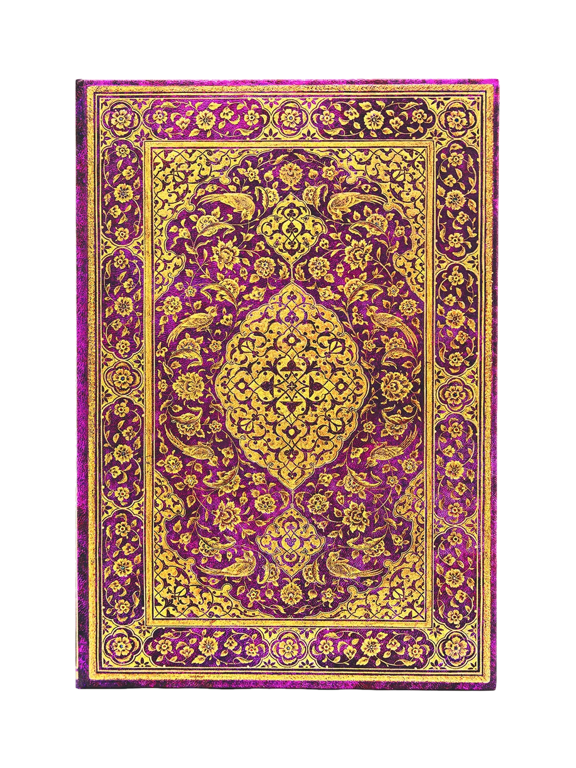Inspired by the 17th-century binding that originally housed the Bustan, a seminal work by Persian author Saadi (1210–1291), this design beautifully mirrors the contents of the original volume. Saadi Shirazi, known by his pen name Saadi, was a poet and prose writer born in Shiraz, Iran. Saadi was nicknamed “The Master of Speech” among Persian scholars for the strength of his writing, which impacted not only Persian literature but Persian everyday language, too.The Bustan (known in English as The Orchard) is one of Saadi’s two best-known works. Written entirely in verse, the stories are rich in moral thought and principles. The intricate botanical patterns of this design reflect the fruits of Saadi’s wisdom.