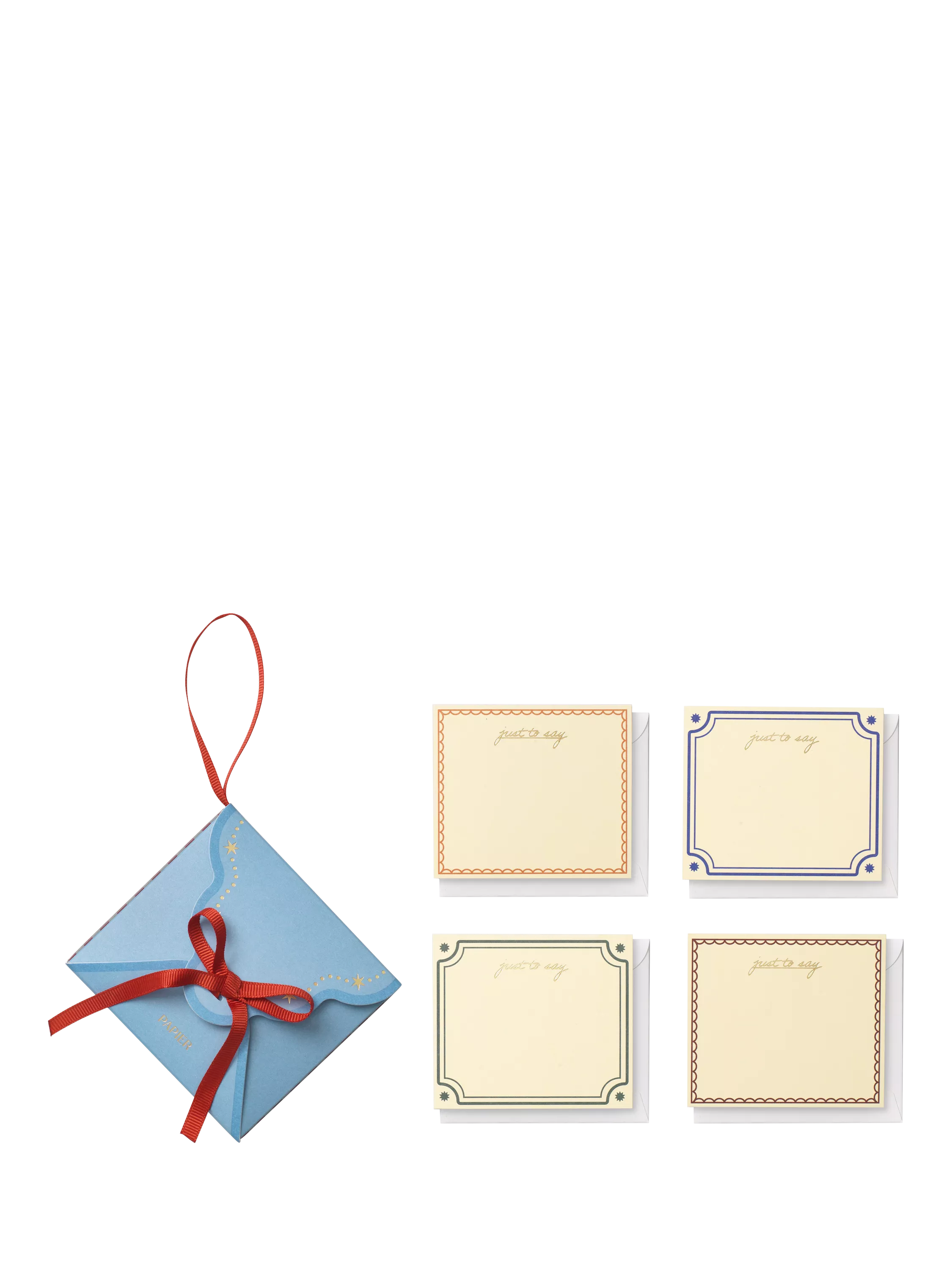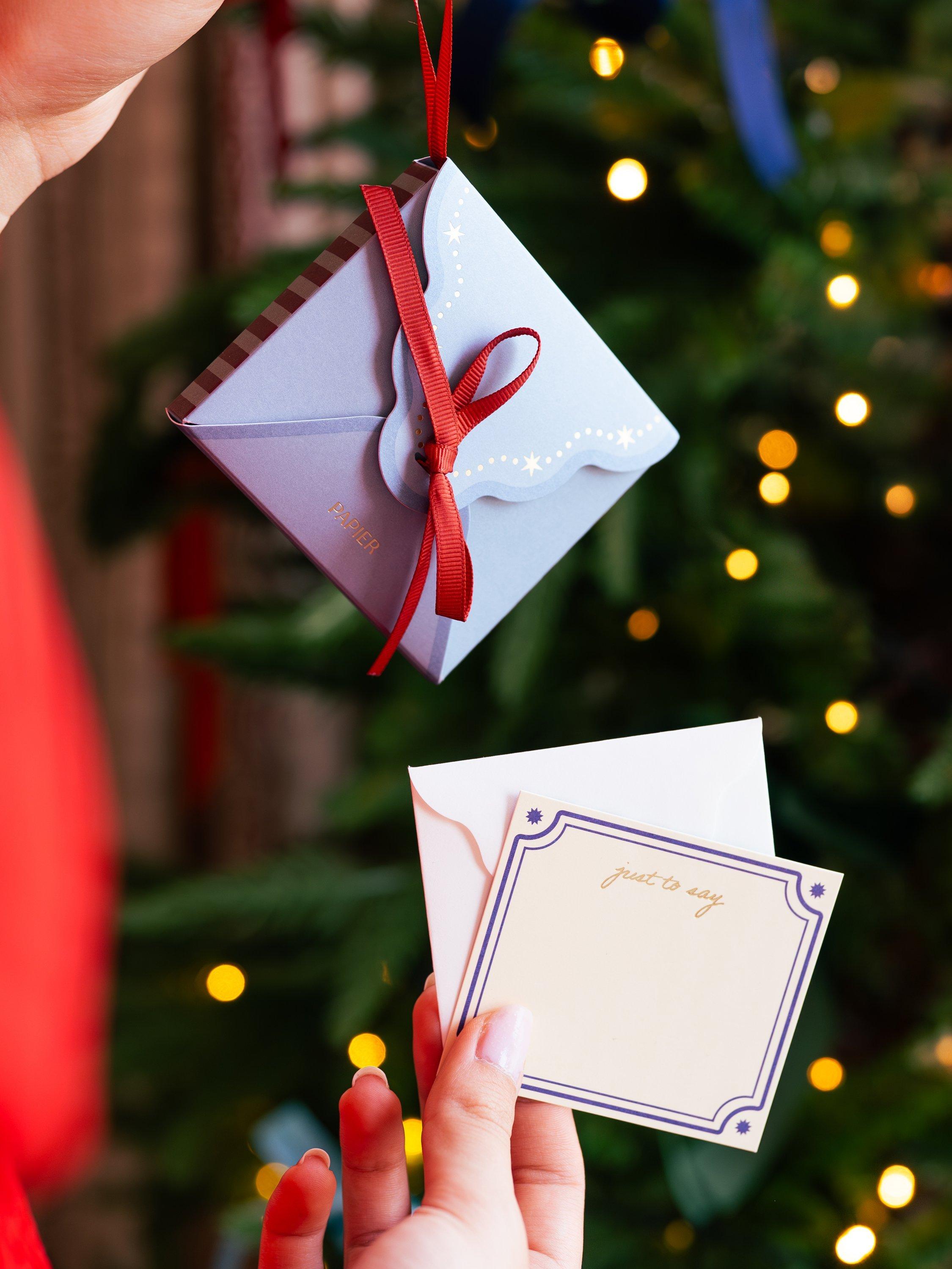 Mini but magical. This pretty hanging tree decoration by Papier unfolds to reveal a cute set of mini notecards – perfect for your tree or gifting to a friend. A small but thoughtful way to share heartfelt messages and moments of festive joy this season.