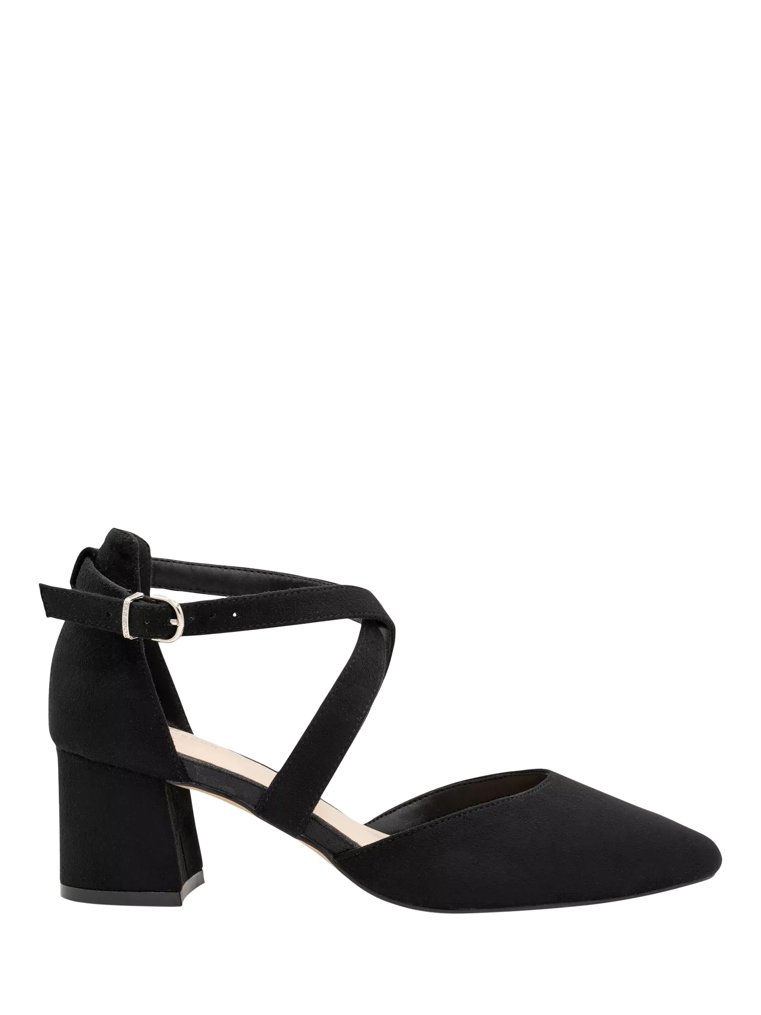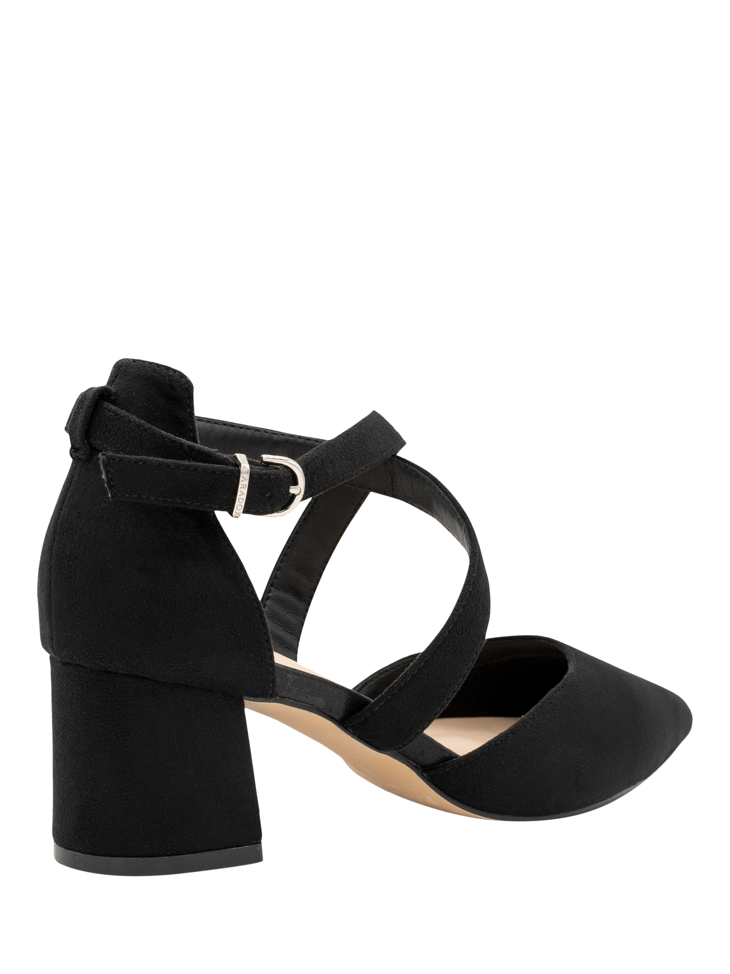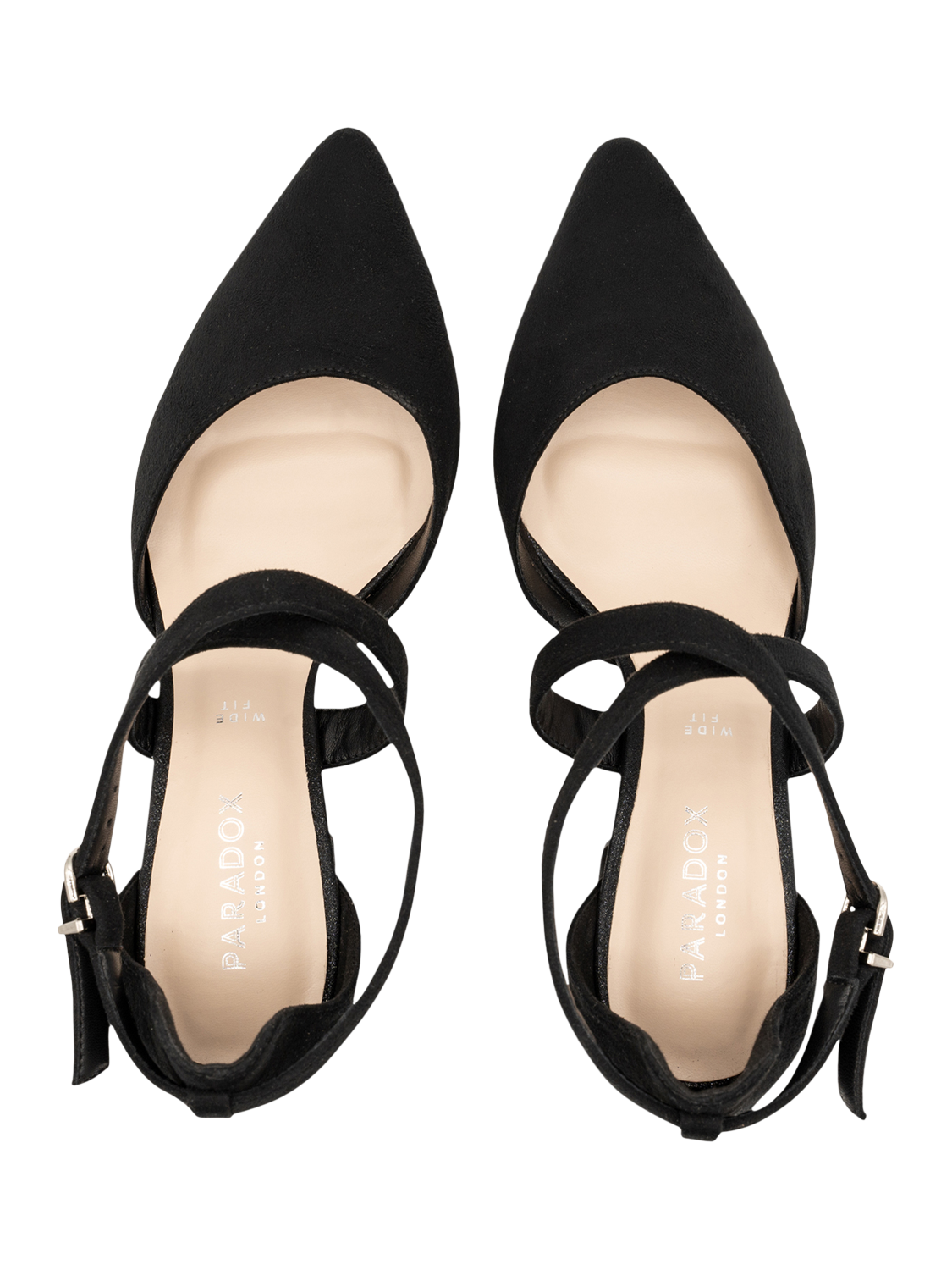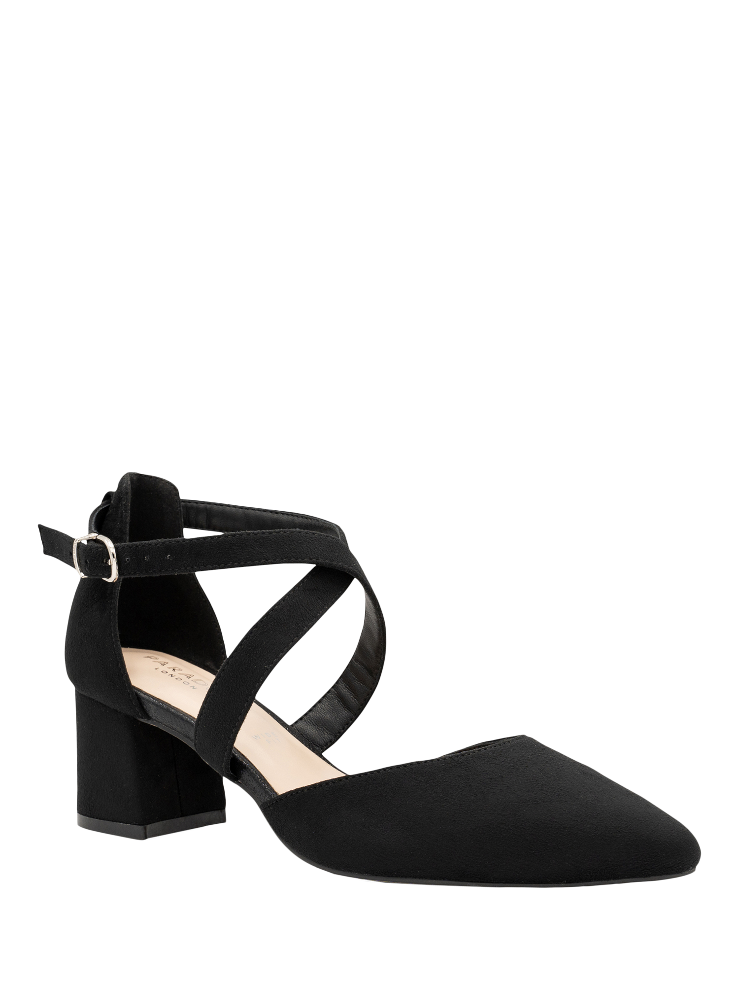 The Ffion Wide Fit heel by Paradox London features cross-strap detailing with a faux leather finish.