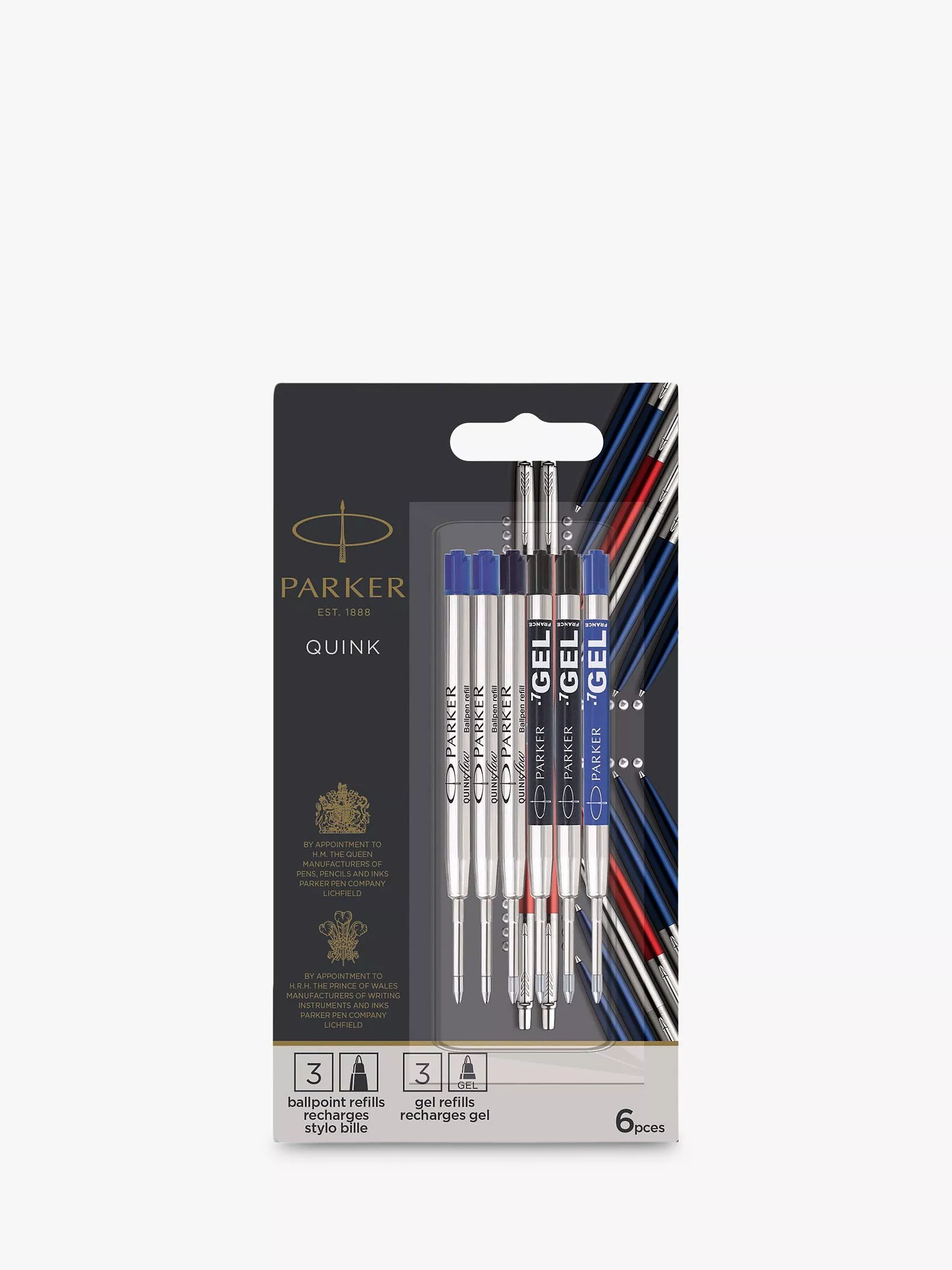 A pack of 6 PARKER Ballpoint Pen & Gel Pen Refills in blue and black.
