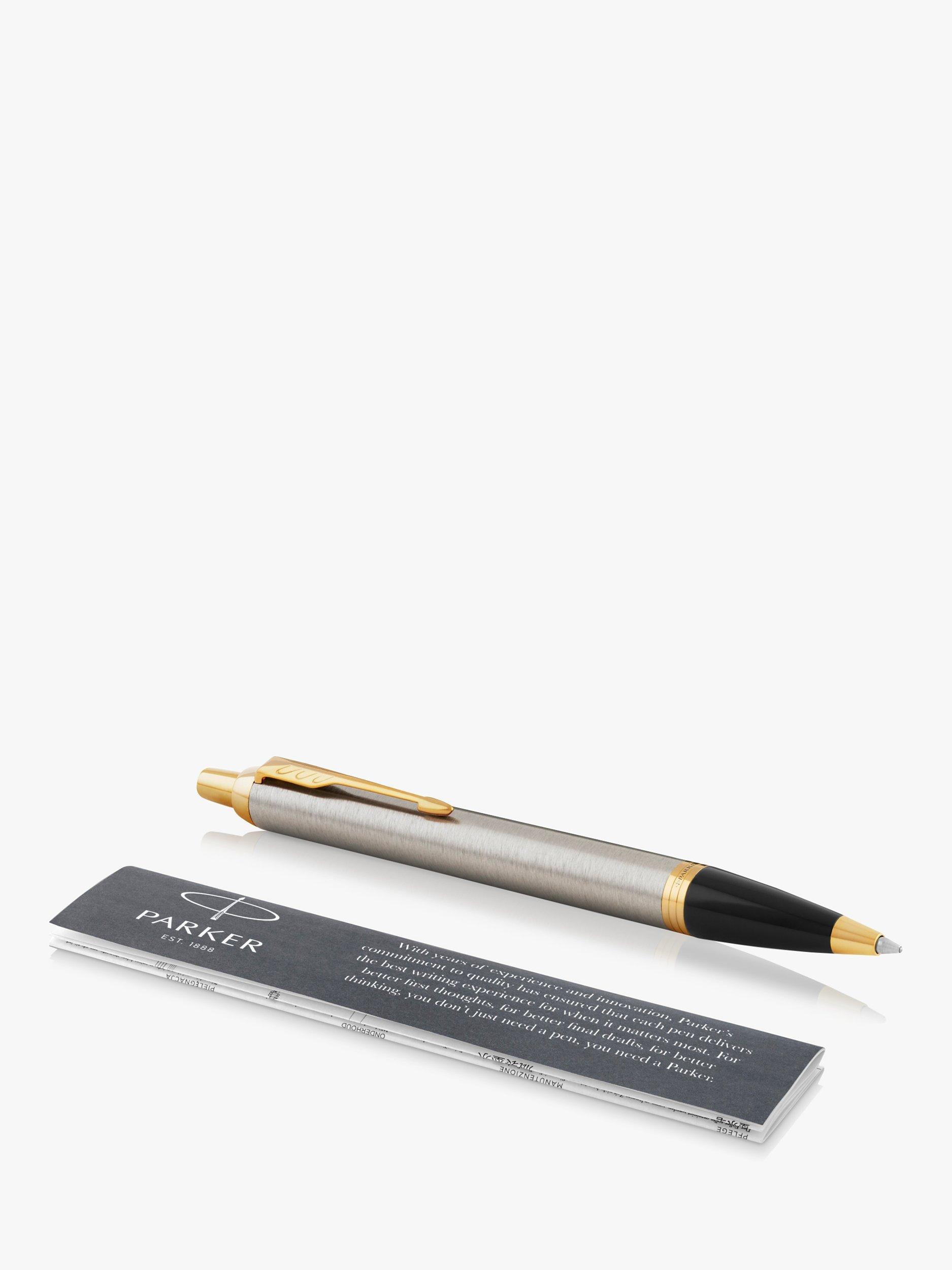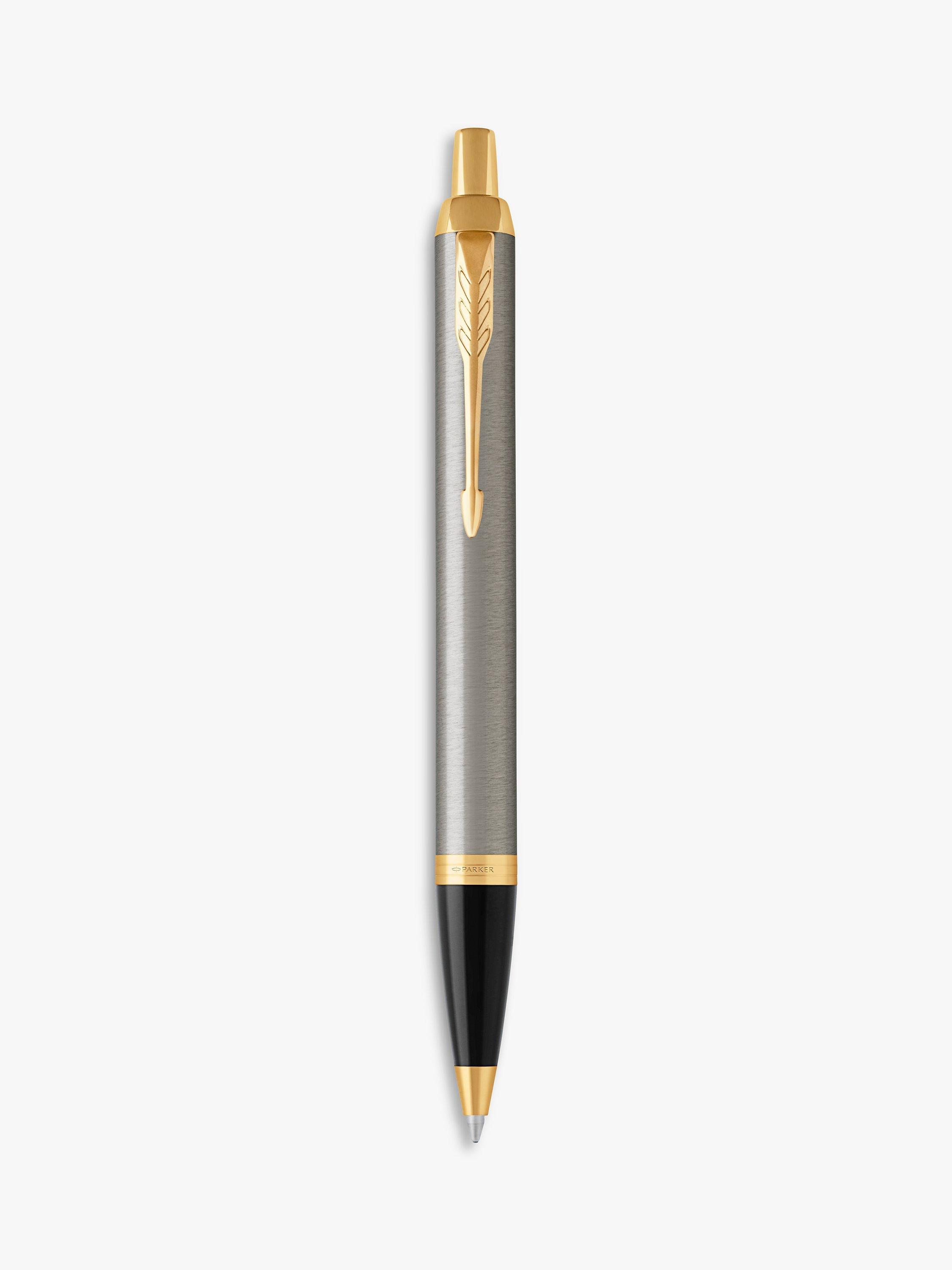 At once smart, polished and professional, the PARKER IM Ballpoint Pen is an ideal partner with unlimited potential. The sleek tapered shape pairs seamlessly with innovative designs to make a striking statement. Crafted with a classic brushed metal body accented in eye-catching gold finish trim, this PARKER pen makes a memorable gift. Retracting with a satisfying click, the ballpoint tip and Quinkflow ink ensure an exceptionally smooth and reliable writing experience. Every detail is refined to deliver a writing experience that is at once dependable and faithful to over 125 years of PARKER brand heritage.