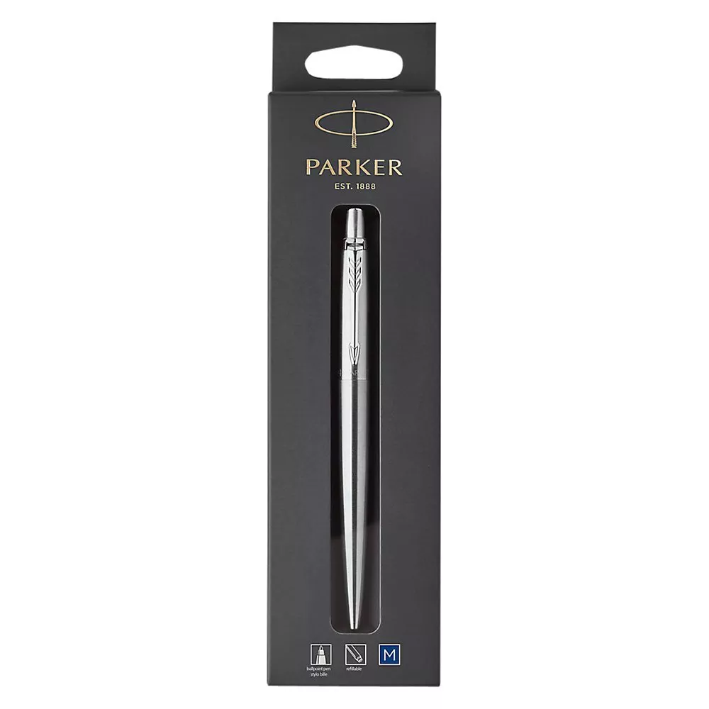 Parker's famous jotter ballpoint pen features a contrasting stainless steel cap and barrel. The medium blue ballpoint refill offers a smooth flowing ink. A writing workhorse.