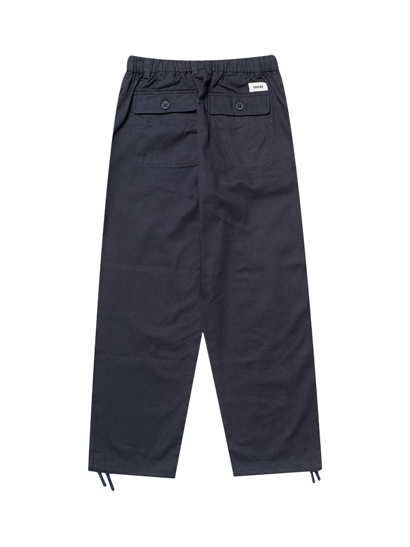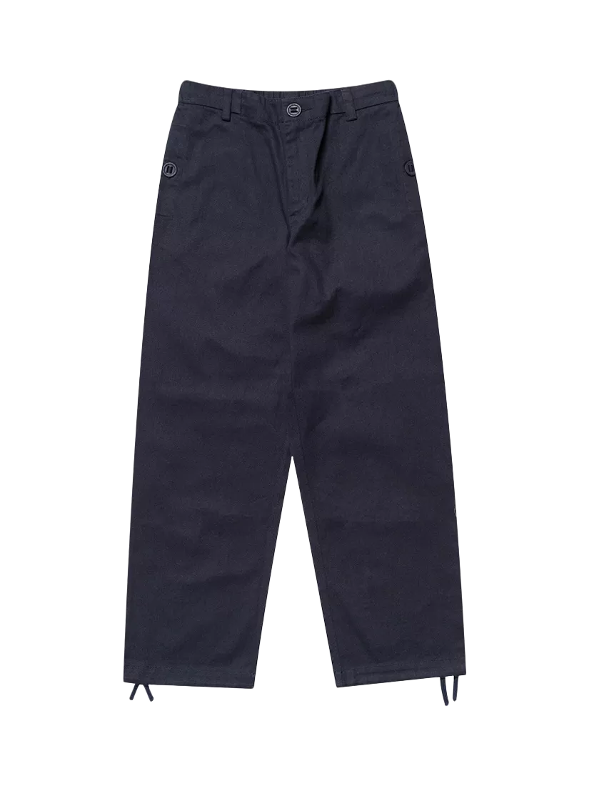 The Basecamp trousers from Parlez feature a part-elasticated waist, in-seam pockets, and branded slit hole buttons.