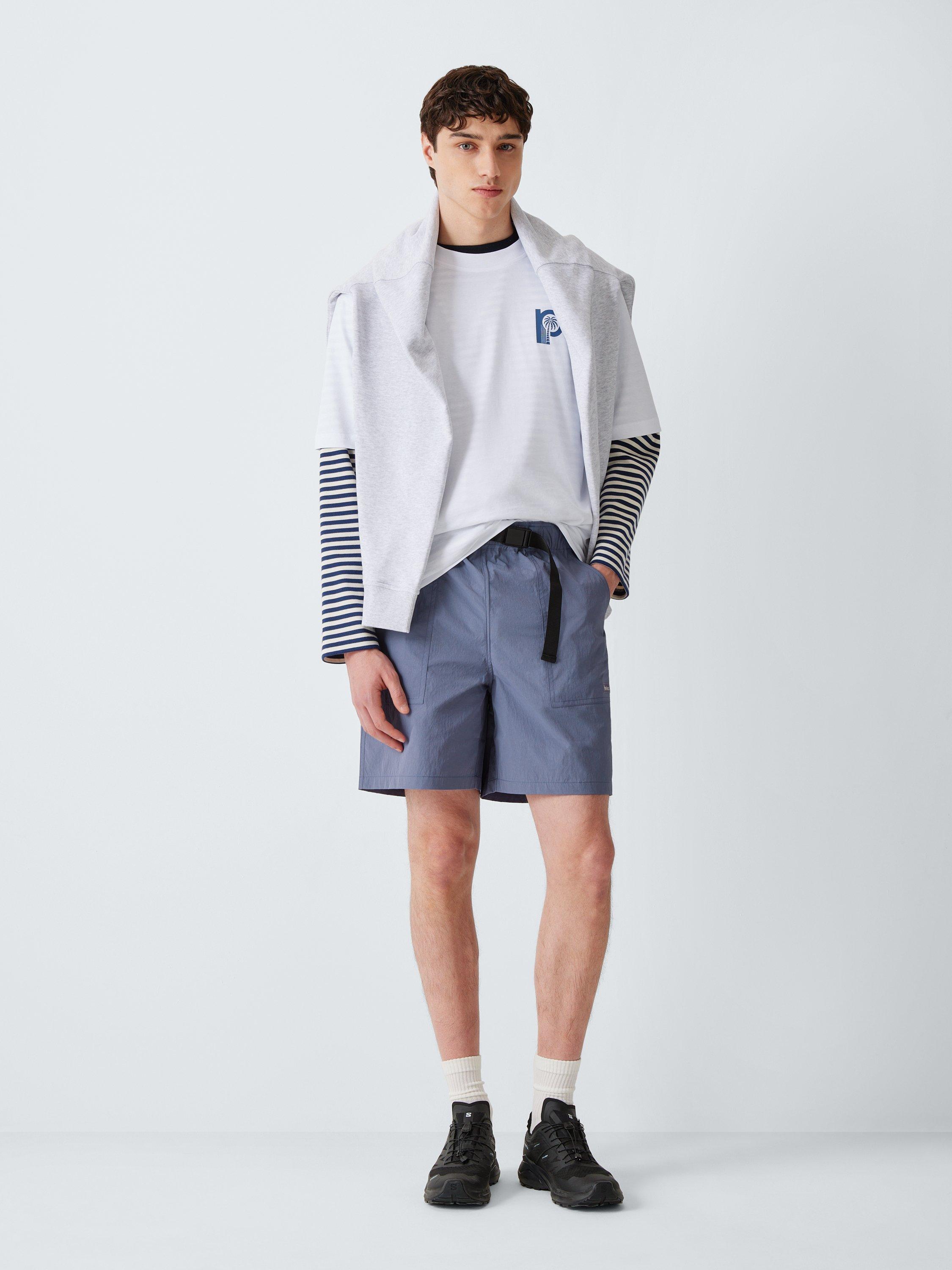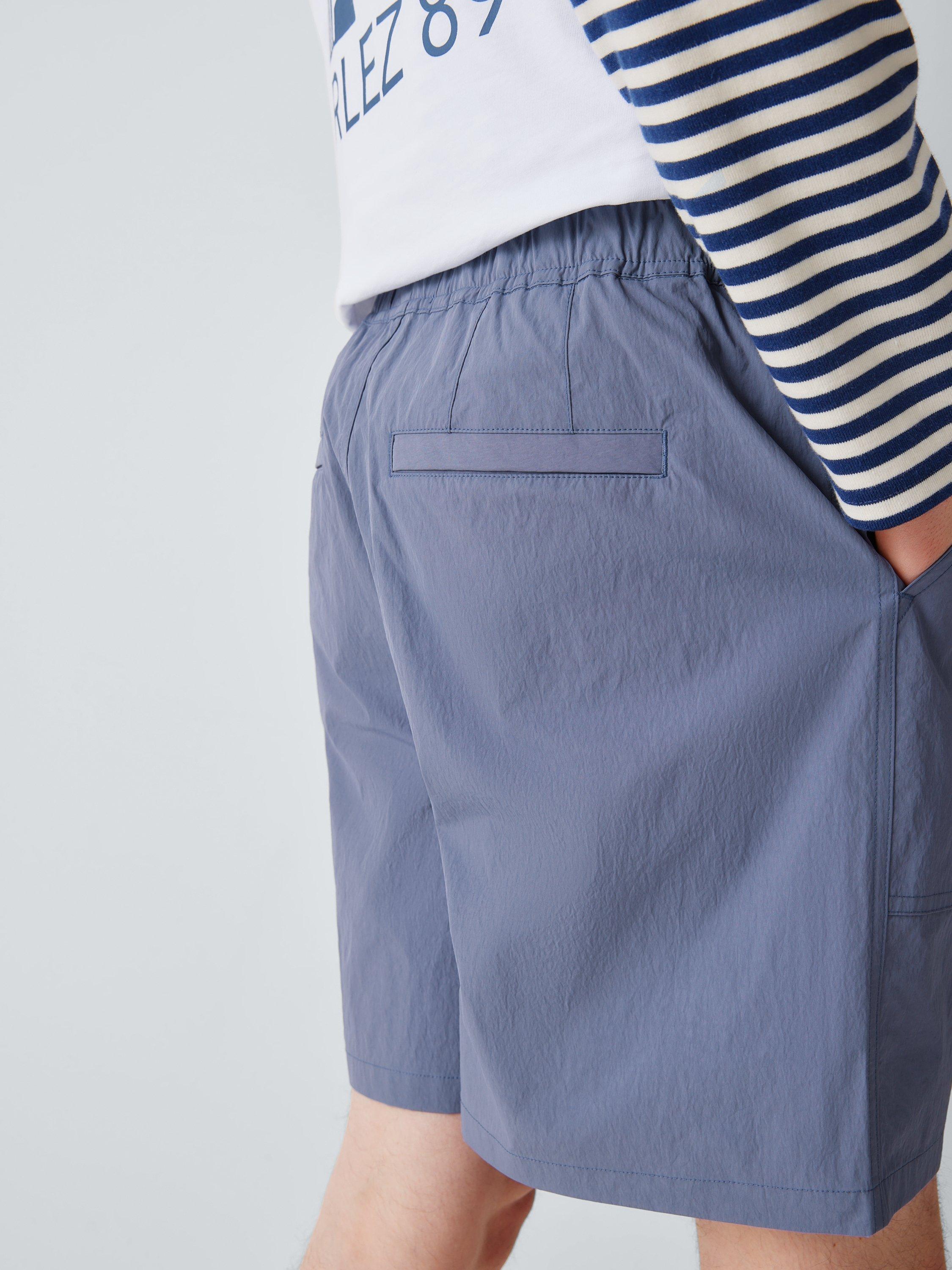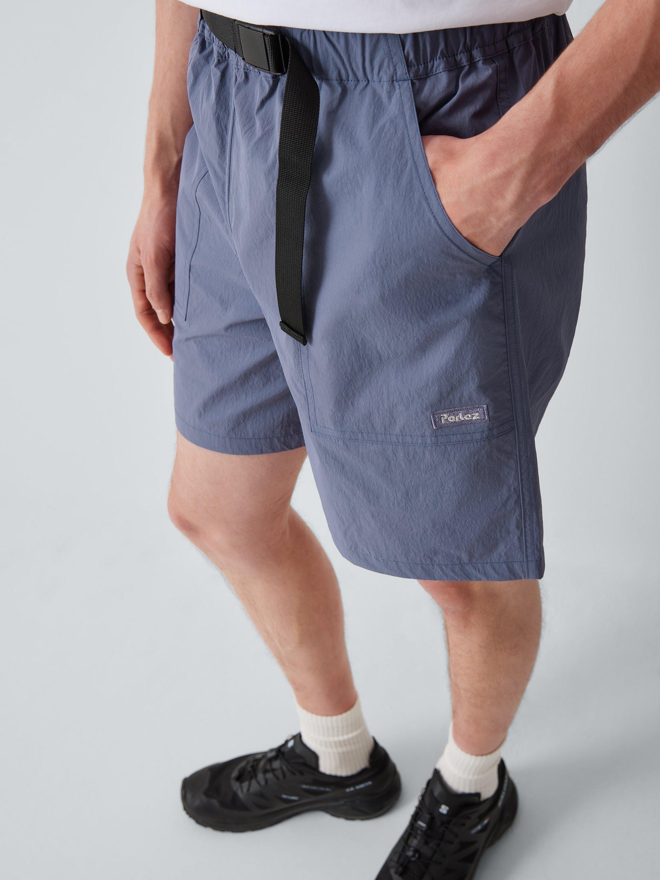 The Cliff shorts from Parlez feature an elasticated waist, with a built-in clip belt and embroidered patch branding.