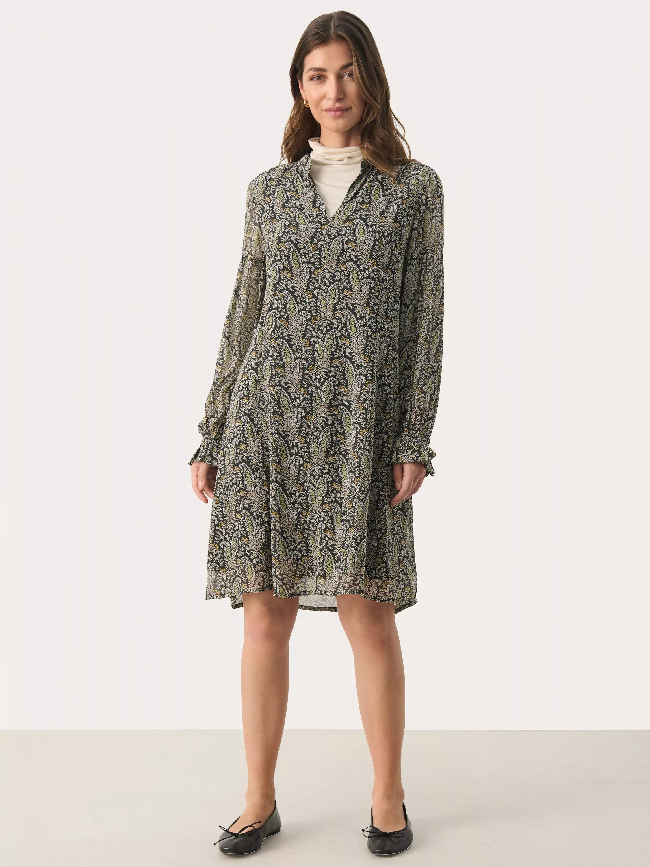 The Botella dress is a cute and versatile style made in a lovely, printed chiffon fabric. It has a V-notch neck with a frilled collar, and it has a casual A-line fit. The sleeves are long and loose-fitting, and they are gathered in elastic edges with ruffles. The dress has a sleeveless lining, and it is cut above the knees.