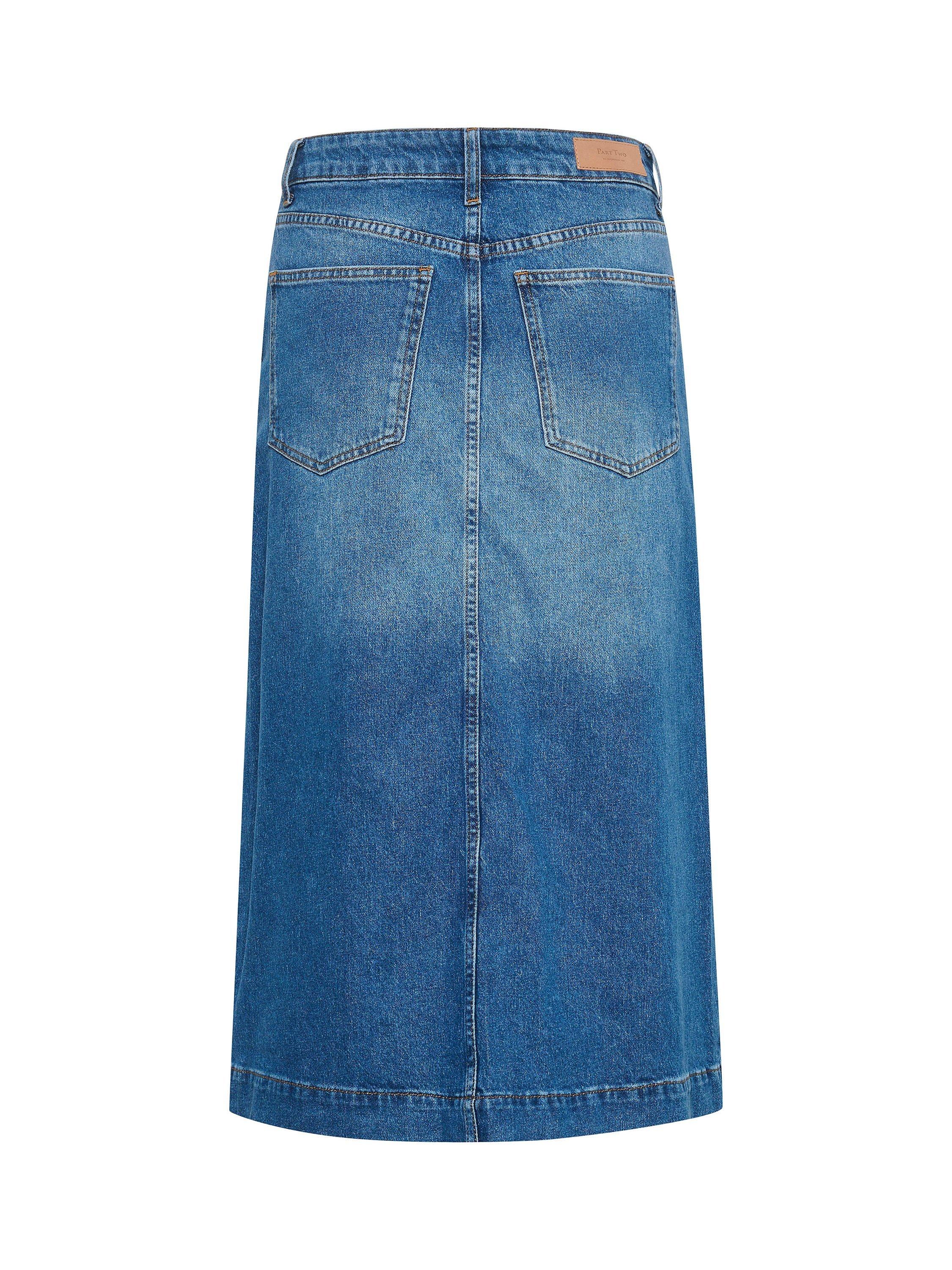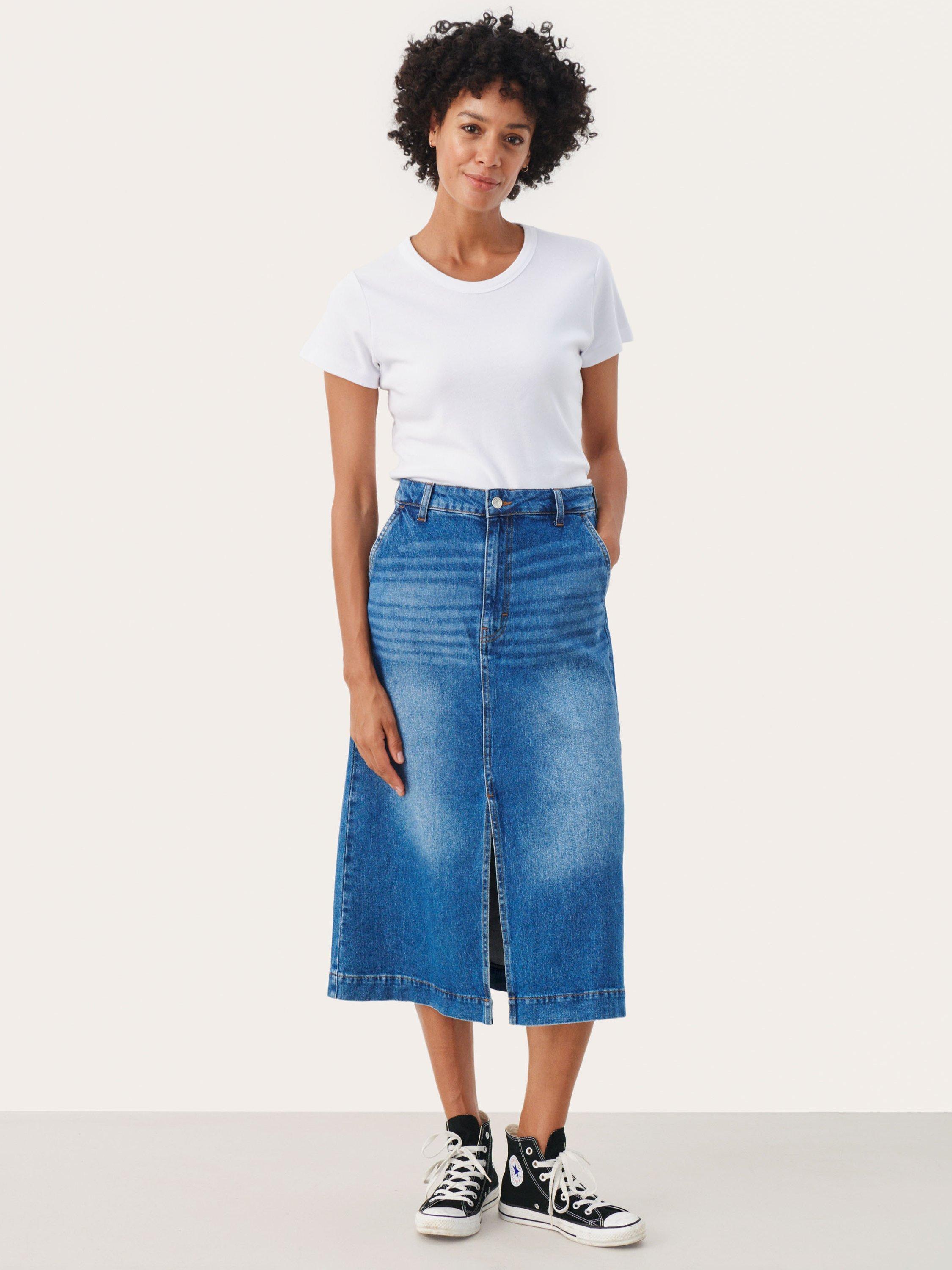 The Calia denim skirt is a fun and casual everyday style. It is cut below the calves and has an A-line fit. At the front the skirt has a slit that goes up above the knees. The skirt has a regular waistband with belt loops and a zip and button fastening. It has oblique front pockets and patch back pockets.