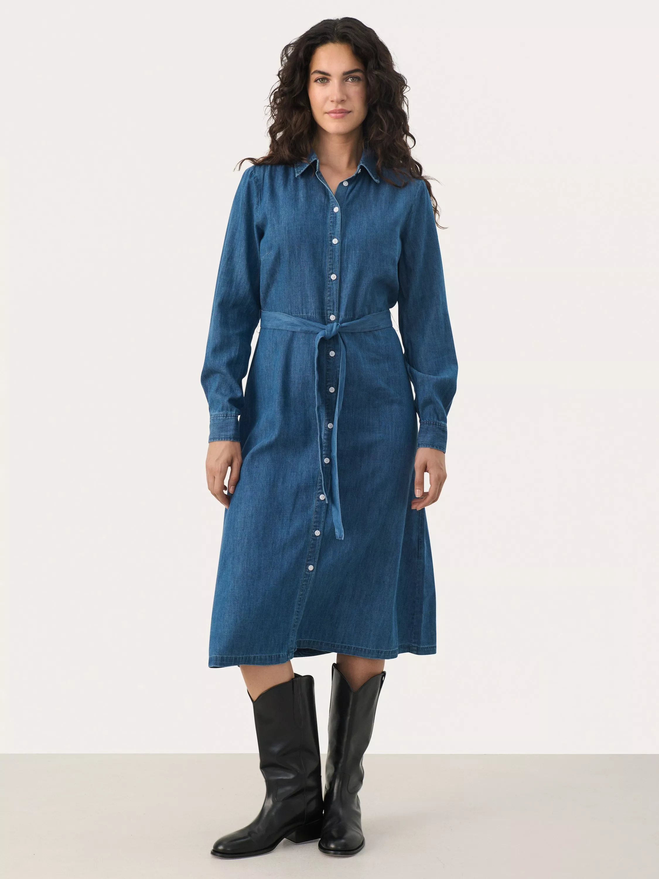The Cirke dress is a shirt dress made in a soft and thin denim quality. It has a spread collar and button fastening, and at the waist it has a matching tying belt. The sleeves are long, and have buttoned cuffs. The dress has a regular fit and is cut below the knees.