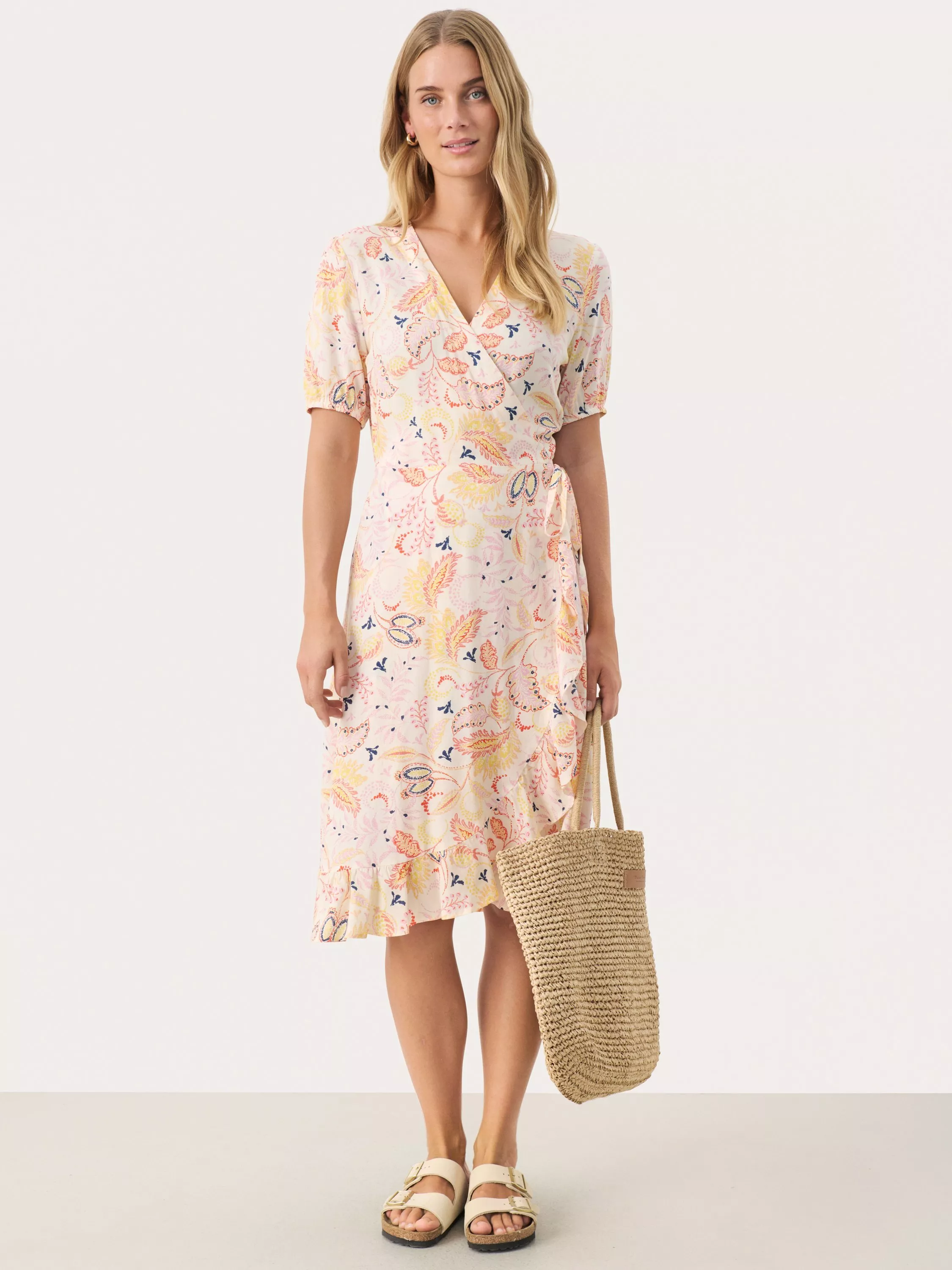 This elegant Claire wrap dress with a soft floral print is designed to accentuate your figure with its adjustable fit. The short sleeves and feminine ruffle hem make it perfect for both everyday wear and special occasions.