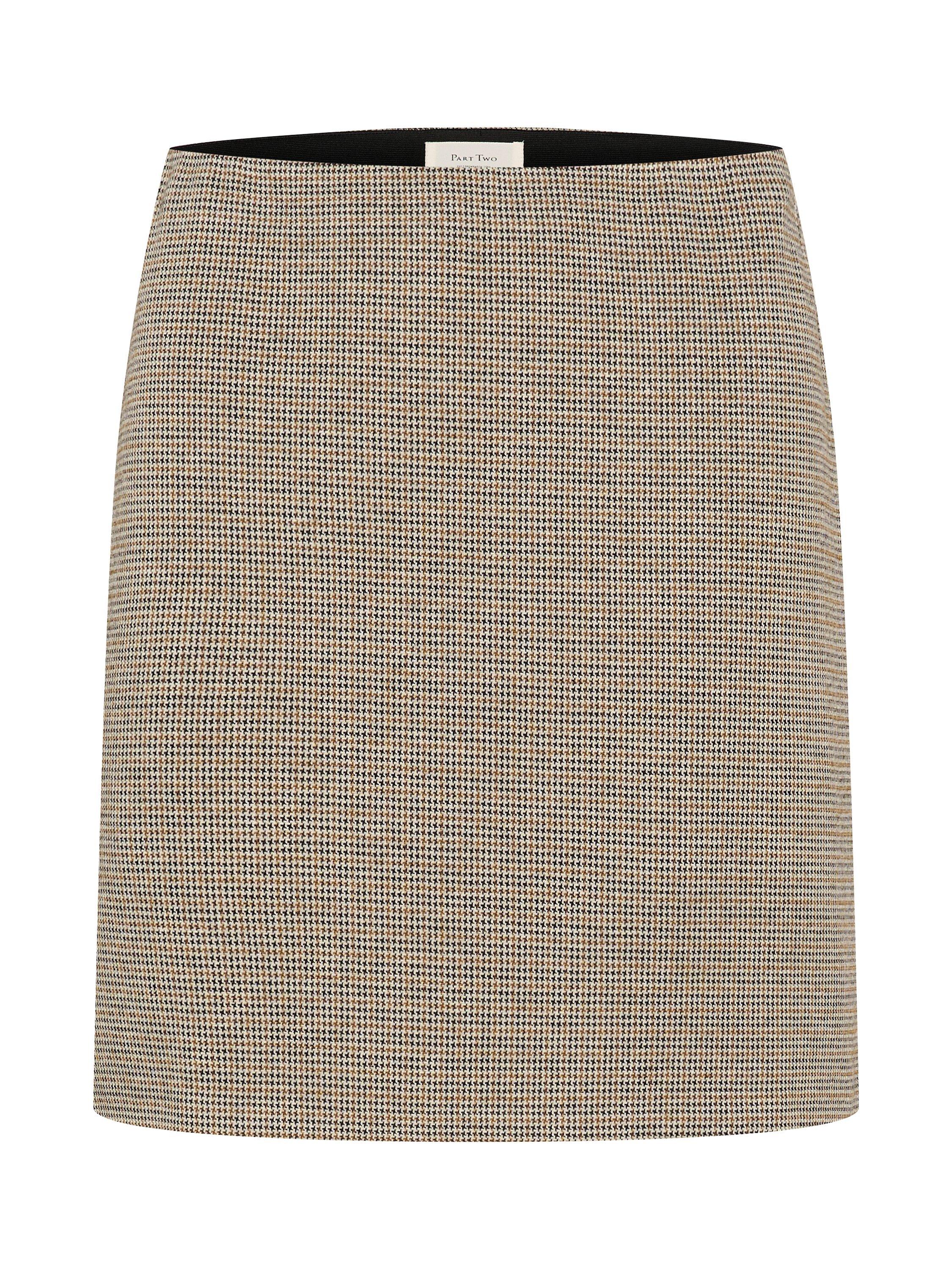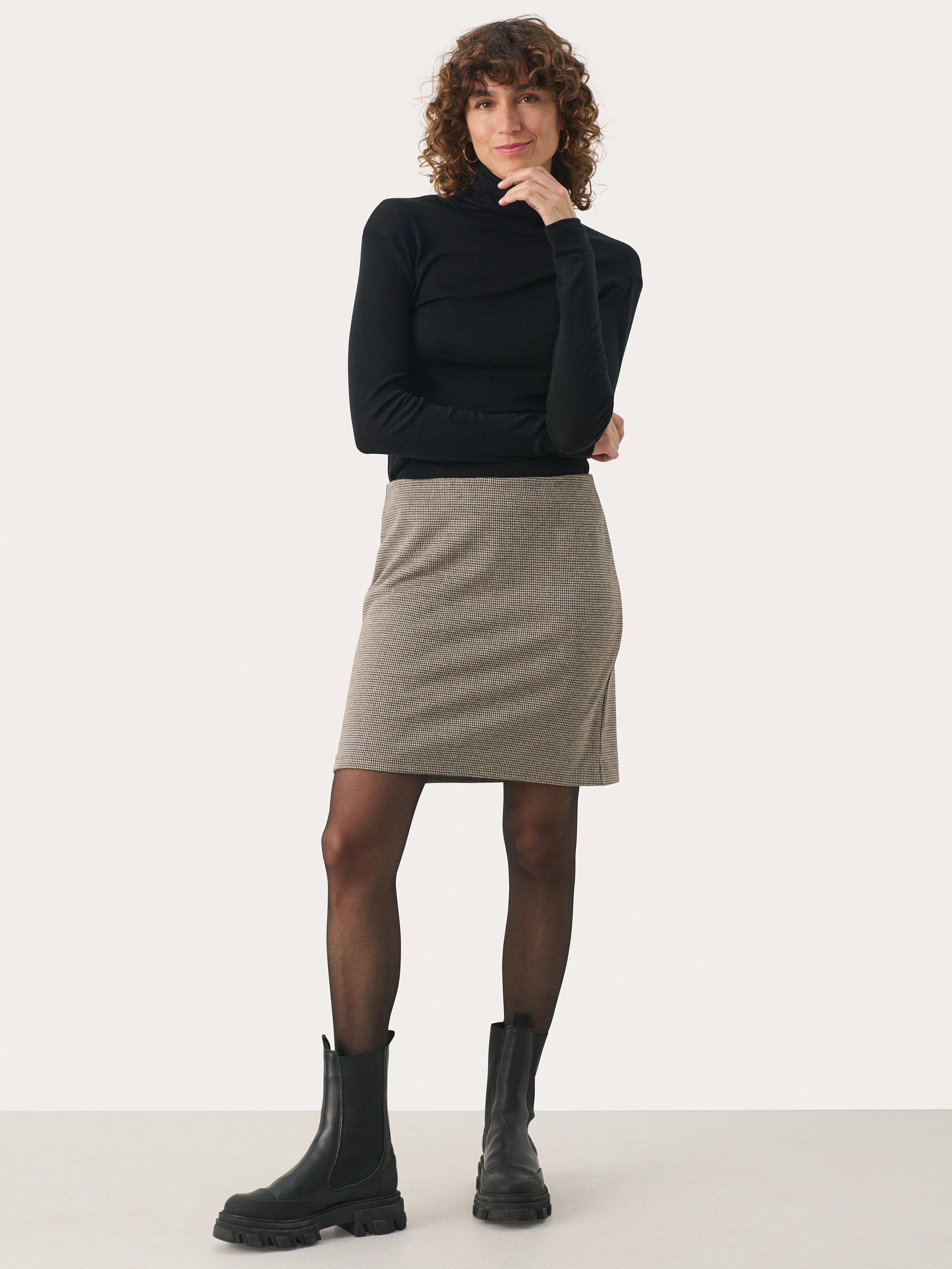 The Corinne skirt is a flattering mini skirt in a checked pattern. The skirt is cut at the mid-thigh and it is made without a waistband, which gives it a super sleek look. The skirt has a slim silhouette and is high-waisted with an elastic waist.