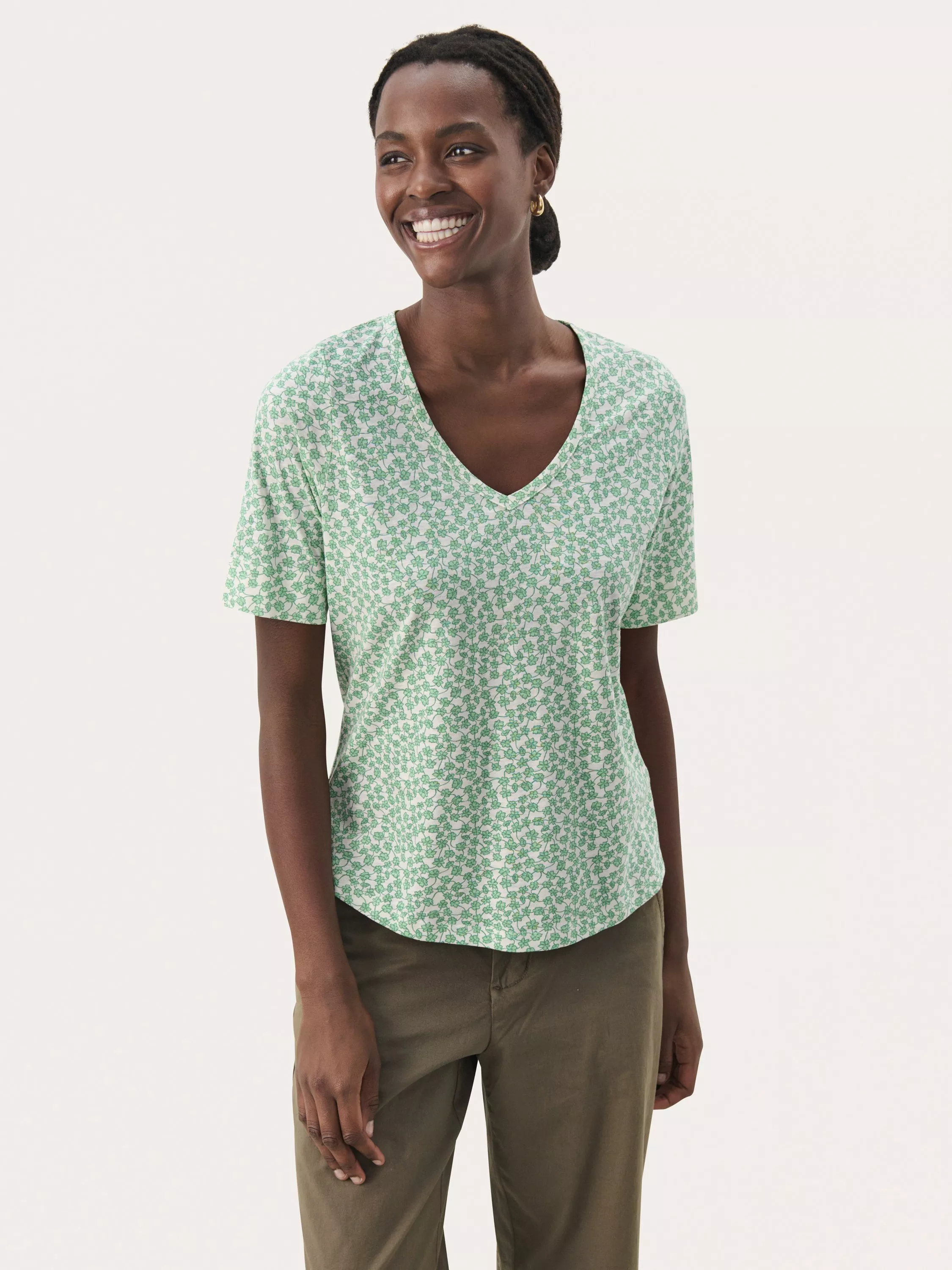 This Curlia T-Shirt with a V-neckline and delicate pattern brings a fresh touch to your wardrobe. Its lightweight fabric and short sleeves make it perfect for warm days. Pair with jeans or a skirt for a feminine and relaxed look.